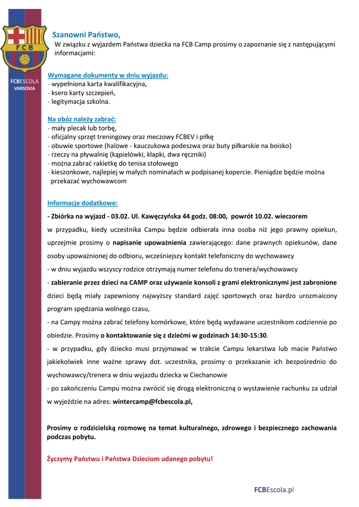 Szanowni Państwo, W związku z wyjazdem Państwa dziecka na FCB Camp prosimy o zapoznanie się z następującymi informacjami: Wymagane dokumenty w dniu wyjazdu: - wypełniona karta kwalifikacyjna, - ksero karty szczepień, - legitymacja szkolna. Na obóz należy zabrać: - mały plecak lub torbę, - oficjalny sprzęt treningowy oraz meczowy FCBEV i piłkę - obuwie sportowe (halowe - kauczukowa podeszwa oraz buty piłkarskie na boisko) - rzeczy na pływalnię (kąpielówki, klapki, dwa ręczniki) - można zabrać rakietkę do tenisa stołowego - kieszonkowe, najlepiej w małych nominałach w podpisanej kopercie. Pieniądze będzie można przekazać wychowawcom Informacje dodatkowe: - Zbiórka na wyjazd - 03.02. Ul. Kawęczyńska 44 godz. 08:00, powrót 10.02. wieczorem w przypadku, kiedy uczestnika Campu będzie odbierała inna osoba niż jego prawny opiekun, uprzejmie prosimy o napisanie upoważnienia zawierającego: dane prawnych opiekunów, dane osoby upoważnionej do odbioru, wcześniejszy kontakt telefoniczny do wychowawcy - w dniu wyjazdu wszyscy rodzice otrzymają numer telefonu do trenera/wychowawcy - zabieranie przez dzieci na CAMP oraz używanie konsoli z grami elektronicznymi jest zabronione dzieci będą miały zapewniony najwyższy standard zajęć sportowych oraz bardzo urozmaicony program spędzania wolnego czasu, - na Campy można zabrać telefony komórkowe, które będą wydawane uczestnikom codziennie po obiedzie. Prosimy o kontaktowanie się z dziećmi w godzinach 14:30-15:30. - w przypadku, gdy dziecko musi przyjmować w trakcie Campu lekarstwa lub macie Państwo jakiekolwiek inne ważne sprawy dot. uczestnika, prosimy o przekazanie ich bezpośrednio do wychowawcy/trenera w dniu wyjazdu dziecka w Ciechanowie - po zakończeniu Campu można zwrócić się drogą elektroniczną o wystawienie rachunku za udział w wyjeździe na adres: [email protected], Prosimy o rodzicielską rozmowę na temat kulturalnego, zdrowego i bezpiecznego zachowania podczas pobytu. Życzymy Państwu i Państwa Dzieciom udanego pobytu!