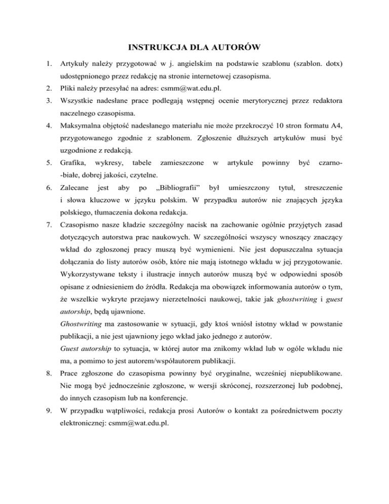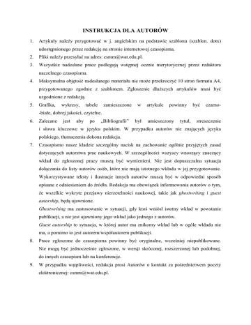 INSTRUKCJA DLA AUTORÓW 1. Artykuły należy przygotować w j. angielskim na podstawie szablonu (szablon. dotx) udostępnionego przez redakcję na stronie internetowej czasopisma. 2. Pliki należy przesyłać na adres: [email protected]. 3. Wszystkie nadesłane prace podlegają wstępnej ocenie merytorycznej przez redaktora naczelnego czasopisma. 4. Maksymalna objętość nadesłanego materiału nie może przekroczyć 10 stron formatu A4, przygotowanego zgodnie z szablonem. Zgłoszenie dłuższych artykułów musi być uzgodnione z redakcją. 5. Grafika, wykresy, tabele zamieszczone w artykule powinny być czarno- -białe, dobrej jakości, czytelne. 6. Zalecane jest aby po „Bibliografii” był umieszczony tytuł, streszczenie i słowa kluczowe w języku polskim. W przypadku autorów nie znających języka polskiego, tłumaczenia dokona redakcja. 7. Czasopismo nasze kładzie szczególny nacisk na zachowanie ogólnie przyjętych zasad dotyczących autorstwa prac naukowych. W szczególności wszyscy wnoszący znaczący wkład do zgłoszonej pracy muszą być wymienieni. Nie jest dopuszczalna sytuacja dołączania do listy autorów osób, które nie mają istotnego wkładu w jej przygotowanie. Wykorzystywane teksty i ilustracje innych autorów muszą być w odpowiedni sposób opisane z odniesieniem do źródła. Redakcja ma obowiązek informowania autorów o tym, że wszelkie wykryte przejawy nierzetelności naukowej, takie jak ghostwriting i guest autorship, będą ujawnione. Ghostwriting ma zastosowanie w sytuacji, gdy ktoś wniósł istotny wkład w powstanie publikacji, a nie jest ujawniony jego wkład jako jednego z autorów. Guest autorship to sytuacja, w której autor ma znikomy wkład lub w ogóle wkładu nie ma, a pomimo to jest autorem/współautorem publikacji. 8. Prace zgłoszone do czasopisma powinny być oryginalne, wcześniej niepublikowane. Nie mogą być jednocześnie zgłoszone, w wersji skróconej, rozszerzonej lub podobnej, do innych czasopism lub na konferencje. 9. W przypadku wątpliwości, redakcja prosi Autorów o kontakt za pośrednictwem poczty elektronicznej: [email protected].