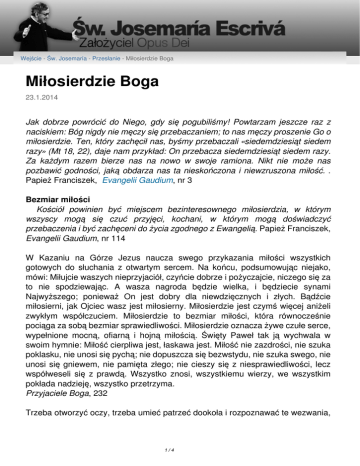 Wejście - Św. Josemaría - Przesłanie - Miłosierdzie Boga Miłosierdzie Boga 23.1.2014 Jak dobrze powrócić do Niego, gdy się pogubiliśmy! Powtarzam jeszcze raz z naciskiem: Bóg nigdy nie męczy się przebaczaniem; to nas męczy proszenie Go o miłosierdzie. Ten, który zachęcił nas, byśmy przebaczali «siedemdziesiąt siedem razy» (Mt 18, 22), daje nam przykład: On przebacza siedemdziesiąt siedem razy. Za każdym razem bierze nas na nowo w swoje ramiona. Nikt nie może nas pozbawić godności, jaką obdarza nas ta nieskończona i niewzruszona miłość. . Papież Franciszek, Evangelii Gaudium, nr 3 Bezmiar miłości Kościół powinien być miejscem bezinteresownego miłosierdzia, w którym wszyscy mogą się czuć przyjęci, kochani, w którym mogą doświadczyć przebaczenia i być zachęceni do życia zgodnego z Ewangelią. Papież Franciszek, Evangelii Gaudium, nr 114 W Kazaniu na Górze Jezus naucza swego przykazania miłości wszystkich gotowych do słuchania z otwartym sercem. Na końcu, podsumowując niejako, mówi: Miłujcie waszych nieprzyjaciół, czyńcie dobrze i pożyczajcie, niczego się za to nie spodziewając. A wasza nagroda będzie wielka, i będziecie synami Najwyższego; ponieważ On jest dobry dla niewdzięcznych i złych. Bądźcie miłosierni, jak Ojciec wasz jest miłosierny. Miłosierdzie jest czymś więcej aniżeli zwykłym współczuciem. Miłosierdzie to bezmiar miłości, która równocześnie pociąga za sobą bezmiar sprawiedliwości. Miłosierdzie oznacza żywe czułe serce, wypełnione mocną, ofiarną i hojną miłością. Święty Paweł tak ją wychwala w swoim hymnie: Miłość cierpliwa jest, łaskawa jest. Miłość nie zazdrości, nie szuka poklasku, nie unosi się pychą; nie dopuszcza się bezwstydu, nie szuka swego, nie unosi się gniewem, nie pamięta złego; nie cieszy się z niesprawiedliwości, lecz współweseli się z prawdą. Wszystko znosi, wszystkiemu wierzy, we wszystkim pokłada nadzieję, wszystko przetrzyma. Przyjaciele Boga, 232 Trzeba otworzyć oczy, trzeba umieć patrzeć dookoła i rozpoznawać te wezwania, 1/4 które kieruje do nas Bóg poprzez tych, którzy nas otaczają. Nie możemy żyć odwróceni plecami do tłumu, zamknięci w swoim małym świecie. Nie tak żył Jezus. Ewangelie mówią nam wielokrotnie o Jego miłosierdziu, o Jego umiejętności współczucia innym w ich cierpieniu i potrzebach: lituje się nad wdową z Nain, płacze z powodu śmierci Łazarza, troszczy się o tłumy, które idą za Nim i nie mają co jeść, lituje się też przede wszystkim nad grzesznikami, którzy idą przez świat, nie znając światła ani prawdy: Gdy Jezus wysiadł, ujrzał wielki tłum. Zlitował się nad nimi, byli bowiem jak owce nie mające pasterza. I zaczął ich nauczać. Będąc prawdziwymi dziećmi Maryi, rozumiemy tę postawę Pana, tak iż nasze serce się powiększa i napełnia się miłosierdziem. Bolą nas wówczas cierpienia, nędze, błędy, samotność, smutek, ból innych ludzi, naszych braci. Czujemy się przynagleni do pomagania im w ich potrzebach i do mówienia im o Bogu, żeby umieli obcować z Nim po synowsku i mogli poznać matczyną troskę Maryi. To Chrystus przechodzi, 146. Miłość, która nie zawodzi Jakże piękną rzeczą jest wiara w to w naszym życiu: miłosierdzie Boga! Tak wielka miłość, tak głęboka miłość Boga do nas, miłość, która nie zawodzi, zawsze bierze nas za rękę i podtrzymuje, podnosi, prowadzi.. Papież Franciszek, homilia 7-4-2013 Jeśli przejrzycie Pismo Święte, odkryjecie w każdym miejscu obecność miłosierdzia Bożego: napełnia ziemię; rozciąga się na wszystkie Jego dzieci, super omnem carnem; ogarnia nas; wychodzi nam naprzeciw; otacza nas, by nam pomagać i nieustannie jest potwierdzane. Bóg, troszcząc się o nas jak kochający Ojciec, patrzy na nas w swoim miłosierdziu: miłosierdziu łaskawym, pięknym jak chmury deszczowe w czasie posuchy. Pan Jezus podsumowuje i streszcza całą tę historię miłosierdzia Bożego: Błogosławieni miłosierni, albowiem oni miłosierdzia dostąpią. A innym razem: Bądźcie miłosierni, jak Ojciec wasz jest miłosierny. Pośród tylu scen Ewangelii wyryła się nam również mocno w pamięci łaskawość wobec jawnogrzesznicy, przypowieść o synu marnotrawnym, o zaginionej owcy, o dłużniku, któremu darowano dług, wskrzeszenie syna wdowy z Nain. Ileż racji wynikających ze sprawiedliwości tłumaczy ten wielki cud! Umarł jedyny syn owej ubogiej wdowy, syn, który nadawał sens jej życiu, który w starości mógł jej służyć pomocą. Jednak Chrystus nie dokonuje cudu z powodu sprawiedliwości; robi to ze współczucia, gdyż w swoim wnętrzu wzrusza się na widok ludzkiego bólu. To Chrystus przechodzi, 7 Nasz Pan, Jezus Chrystus, jakby jeszcze nie wystarczały wszystkie inne dowody 2/4 Jego miłosierdzia, ustanawia Eucharystię, żebyśmy mogli mieć Go zawsze blisko, a także dlatego, że - o ile możemy to pojąć - Ten, który niczego nie potrzebuje, poruszony swoją Miłością, nie chce obyć się bez nas. Trójca zakochała się w człowieku wyniesionym do porządku łaski i uczynionym na Jej obraz i podobieństwo; odkupiła go z grzechu - z grzechu Adama, który spadł na całe jego potomstwo, oraz z osobistych grzechów każdego człowieka - i gorąco pragnie zamieszkiwać w naszej duszy: Jeśli Mnie kto miłuje, będzie zachowywał moją naukę, a Ojciec mój umiłuje go, i przyjdziemy do Niego, i będziemy u niego przebywać. To Chrystus przechodzi, 84 Bóg nigdy nie męczy się przebaczaniem Powtarzam jeszcze raz z naciskiem: Bóg nigdy nie męczy się przebaczaniem; to nas męczy proszenie Go o miłosierdzie . Papież Franciszek, Evangelii Gaudium, n.3 Jeszcze jeden upadek... i to jaki upadek!... Więc co, masz wpadać w rozpacz? Nigdy! Upokórz się i zwróć do Maryi, twojej Matki, do Miłości miłosiernej Jezusa. Zmów jedno miserere i w górę serce! — Rozpocznij na now
