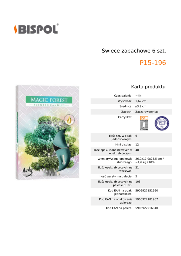 Świece zapachowe 6 szt. P15-196 Karta produktu Czas palenia: ~4h Wysokość: 1,62 cm Średnica: ø3,9 cm Zapach: Zaczarowany las Certyfikat: Ilość szt. w opak. jednostkowym: Mini display: 12 Ilość opak. jednostkowych w opak. zbiorczym: 48 Wymiary/Waga opakowia zbiorczego: 26,0x17,0x23,5 cm / ~4,6 kg±10% Ilość opak. zbiorczych na warstwie: 21 Ilość warstw na palecie: Ilość opak. zbiorczych na palecie EURO: Powered by TCPDF (www.tcpdf.org) 6 5 105 Kod EAN na opak. jednostkowe: 5906927151960 Kod EAN na opakowanie zbiorcze: 5906927181967 Kod EAN na palete: 5906927916040