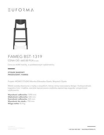 FAMEG BST-1319 CENA OD: 660.00 PLN brutto Cena za stołek twardy, w podstawowym wybarwieniu. STOŁEK BAROWY PRODUCENT: FAMEG Projekt: MOWO STUDIO Monika Elikowska-Opala, Wojciech Opala Meble zostały stworzone z myślą o wszystkich, którzy cenią nowoczesny design i funkcjonalność. Łagodne linie i miękkie, szerokie tapicerowane siedziska zapewniają wygodę i przyjemność użytkowania. Wysokość całkowita: 1090 mm Głębokość całkowita: 540 mm Szerokość całkowita: 505 mm Wysokość do siedz.: 750 mm Waga netto: 8,4 kg Powered by TCPDF (www.tcpdf.org)
