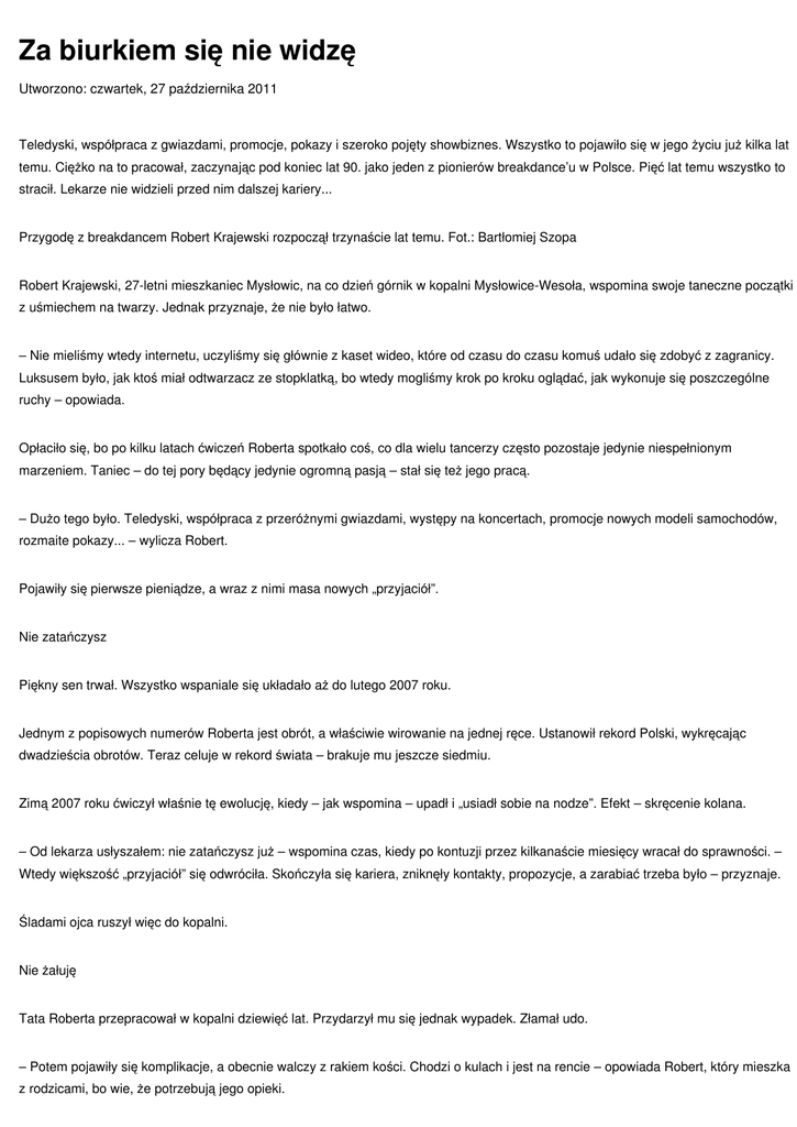 Za biurkiem się nie widzę Utworzono: czwartek, 27 października 2011 Teledyski, współpraca z gwiazdami, promocje, pokazy i szeroko pojęty showbiznes. Wszystko to pojawiło się w jego życiu już kilka lat temu. Ciężko na to pracował, zaczynając pod koniec lat 90. jako jeden z pionierów breakdance’u w Polsce. Pięć lat temu wszystko to stracił. Lekarze nie widzieli przed nim dalszej kariery... Przygodę z breakdancem Robert Krajewski rozpoczął trzynaście lat temu. Fot.: Bartłomiej Szopa Robert Krajewski, 27-letni mieszkaniec Mysłowic, na co dzień górnik w kopalni Mysłowice-Wesoła, wspomina swoje taneczne początki z uśmiechem na twarzy. Jednak przyznaje, że nie było łatwo. – Nie mieliśmy wtedy internetu, uczyliśmy się głównie z kaset wideo, które od czasu do czasu komuś udało się zdobyć z zagranicy. Luksusem było, jak ktoś miał odtwarzacz ze stopklatką, bo wtedy mogliśmy krok po kroku oglądać, jak wykonuje się poszczególne ruchy – opowiada. Opłaciło się, bo po kilku latach ćwiczeń Roberta spotkało coś, co dla wielu tancerzy często pozostaje jedynie niespełnionym marzeniem. Taniec – do tej pory będący jedynie ogromną pasją – stał się też jego pracą. – Dużo tego było. Teledyski, współpraca z przeróżnymi gwiazdami, występy na koncertach, promocje nowych modeli samochodów, rozmaite pokazy... – wylicza Robert. Pojawiły się pierwsze pieniądze, a wraz z nimi masa nowych „przyjaciół”. Nie zatańczysz Piękny sen trwał. Wszystko wspaniale się układało aż do lutego 2007 roku. Jednym z popisowych numerów Roberta jest obrót, a właściwie wirowanie na jednej ręce. Ustanowił rekord Polski, wykręcając dwadzieścia obrotów. Teraz celuje w rekord świata – brakuje mu jeszcze siedmiu. Zimą 2007 roku ćwiczył właśnie tę ewolucję, kiedy – jak wspomina – upadł i „usiadł sobie na nodze”. Efekt – skręcenie kolana. – Od lekarza usłyszałem: nie zatańczysz już – wspomina czas, kiedy po kontuzji przez kilkanaście miesięcy wracał do sprawności. – Wtedy większość „przyjaciół” się odwróciła. Skończyła się kariera, zniknęły kontakty, propozycje, a zarabiać trzeba było – przyznaje. Śladami ojca ruszył więc do kopalni. Nie żałuję Tata Roberta przepracował w kopalni dziewięć lat. Przydarzył mu się jednak wypadek. Złamał udo. – Potem pojawiły się komplikacje, a obecnie walczy z rakiem kości. Chodzi o kulach i jest na rencie – opowiada Robert, który mieszka z rodzicami, bo wie, że potrzebują jego opieki. – Nie żałuję, że trafiłem do kopalni. Lubię to. Pracuję w przodku, więc praca jest ciężka, ale jakoś nie widzę się za biurkiem – stwierdza z uśmiechem. W międzyczasie wrócił do intensywnych treningów. Z radością opowiada o wsparciu, które ma ze strony kolegów z pracy. – Mówią: jesteśmy z tobą, trzymamy kciuki, walcz, bo możesz osiągnąć znacznie więcej niż pracą na dole – relacjonuje. Tylko taniec Na horyzoncie pojawiła się kolejna szansa. Robert trafił bowiem – za namową dziewczyny – do telewizyjnego programu „Got To Dance – Tylko Taniec”, gdzie swoim tanecznym popisem zachwycił wszystkich jurorów, którzy nie dowierzali, słuchając o tym, że jest górnikiem. Dzień po programie z gratulacjami zadzwonił nawet dyrektor kopalni. To nie pierwsza przygoda Roberta z telewizją. Brał już udział w „You can dance”, z którego odpadł, gdyż Michał Piróg stwierdził, że b-boy nie poradzi sobie w programie, w którym trzeba być wszechstronnym tancerzem. – Tańczyłem w życiu między innymi salsę, jazz, balet właśnie po to, by przygotować się do „YCD”, no ale Michał był „na nie”. Reszta jurorów była za mną, ale on się sprzeciwił, wstał, wyszedł ze studia. W telewizji tego nie pokazali – wyznaje Robert. Show, w którym startuje teraz, nie zakłada mu jednak kajdanek w postaci stylów, w których nie czuje się mocny. Tu może pokazać dokładnie to, co w nim gra, czyli breakdance. Konwencja programu zakłada, że każdy prezentuje taki styl, jaki chce. Mogą występować duety, grupy, tancerze indywidualni – tacy jak Robert. – W zagranicznych edycjach zdarzało się, że wygrywali soliści – tłumaczy. Programy takie jak ten mają jednak to do siebie, że losy zawodników zależą od sms-ów, więc wszystko może się zdarzyć. – Ja już wygrałem – podsumowuje Robert, pozostawiając domysłom to, czy ma na myśli program, czy to, że ciągle tańczy, emanuje radością życia i wciąż podąża ścieżką, z której życie tyle razy chciało go zepchnąć. Bartłomiej Szopa