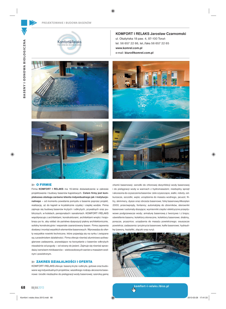 PROJEKTOWANIE I BUDOWA BASENÓW KOMFORT I RELAKS Jarosław Czarnomski BASE NY I O D N OWA BI O LO G I C Z N A ul. Olsztyńska 18 paw. 4, 87-100 Toruń tel. 56 657 22 66, tel./faks 56 657 22 65 www.komrel.com.pl e-mail: [email protected] O FIRMIE chemii basenowej: oerodki do chlorowej dezynfekcji wody basenowej Firma KOMFORT I RELAKS ma 16-letnie doświadczenie w zakresie i do pielęgnacji wody w wannach z hydromasażem; niezbędny sprzęt projektowania i budowy basenów kąpielowych. Celem firmy jest kom- i akcesoria do czyszczenia basenów: żele czyszczące, siatki, roboty, od- pleksowa obsługa zarówno klienta indywidualnego jak i instytucjo- kurzacze, szczotki, węże; urządzenia do masażu wodnego, jacuzzi; fil- nalnego – od momentu powstania pomysłu o basenie poprzez projekt, try, skimmery, dysze oraz obrzeża basenowe; folię basenową Alkorplan realizację, aż do kąpieli w krystalicznie czystej i ciepłej wodzie. Firma 2000; przeciwprądy, fontanny; automatykę do zbiorników, sterowniki zajmuje się budową basenów krytych i odkrytych, prywatnych oraz pu- basenowe i automaty dozujące; wymienniki ciepła i elektryczne przepły- blicznych, w hotelach, pensjonatach i sanatoriach. KOMFORT I RELAKS wowe podgrzewacze wody; armaturę basenową z tworzywa i z brązu; współpracuje z architektami, konstruktorami, architektami wnętrz i krajo- oświetlenie basenu; kolektory słoneczne, kolektory basenowe; drabiny, brazu po to, aby oddać do państwa dyspozycji piękny architektonicznie, poręcze, prysznice; urządzenia do masażu powietrznego; osuszacze solidny konstrukcyjnie i wspaniale zaaranżowany basen. Firma zapewnia powietrza; zadaszenia i przykrycia basenowe; kafle basenowe; hydrauli- dostawy i montaż wszelkich elementów basenowych. Wprowadza do ofer- kę (zawory, kształtki, złączki oraz rury). ty wszystkie nowinki techniczne, które pojawiają się na rynku i związane są z przedmiotem działalności. Firma oferuje również aluminiowo-poliwęglanowe zadaszenia, pozwalające na korzystanie z basenów odkrytych niezależnie od pogody – od wiosny do jesieni. Zajmuje się również sprzedażą i serwisem minibasenów – wieloosobowych wanien z masażem wodnym i powietrznym. ZAKRES DZIAŁALNOŚCI I OFERTA KOMFORT I RELAKS oferuje: baseny kryte i odkryte, gotowe oraz budowane wg indywidualnych projektów; wszelkiego rodzaju akcesoria basenowe i środki niezbędne do pielęgnacji wody basenowej; szeroką gamę 68 2013 Komfort i relaks ibiss 2013.indd 68 komfort-i-relaks.ibiss.pl 2013-03-28 17:41:33