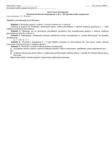 Nazwisko i imię .................................... Kierunek studiów/grupa (semestr 4) .................................... ............. 06 czerwca 2007 r. TEST NAUCZYCIELSKI Metodyka kształcenia integrującego w kl. I – III (egzamin studia stacjonarne) Czas wykonania 75 - 90 minut. Pamiętać o powoływaniu się na literaturę. Zadanie 1. RozróŜnij pojęcia :zadanie i sytuacja zadaniowa w edukacji. Zilustruj te pojęcia na konkretnie określonym (przez siebie) przykładzie z zakresu edukacji językowej ( i – lub) edukacji matematycznej dziecka. Zadanie 2. Opierając się na dowolnym przykładzie przedstaw fazy kształtowania pojęcia z zakresu edukacji przyrodniczej dziecka w klasie I. Zadanie 3. Zaproponuj i zinterpretuj sytuację zadaniową o treści zaczerpniętej ze „świata dziecięcego” do formuły działaniowej: a) 1 + 24 : 6 · 2 = Zadanie 4. Wymień i zinterpretuj 2 – 3 typy błędów związane ze stosowaniem tzw. kart pracy wobec załoŜeń nauczania czynnościowego w edukacji dziecka. Zadanie 5. Przedstaw zwięźle wedle procedury ewaluacyjnej a) szczególne sukcesy własne z zakresu edukacji dziecka i dalsze zamierzenia (publikacje, praca dyplomowa itp.) lub b) trudności odczuwane przez siebie w studiowaniu problematyki edukacji dzieci i wnioski do własnej dalszej pracy nad sobą. Odpowiedzi naleŜy równieŜ poprzeć znajomością adekwatnej literatury.