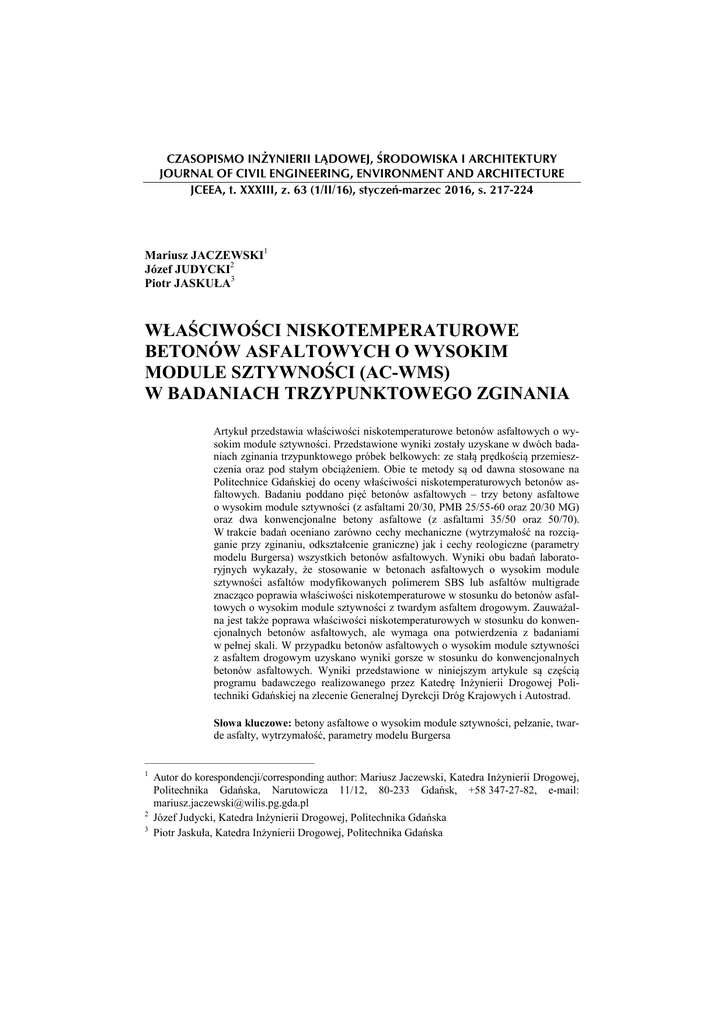 CZASOPISMO INŻYNIERII LĄDOWEJ, ŚRODOWISKA I ARCHITEKTURY JOURNAL OF CIVIL ENGINEERING, ENVIRONMENT AND ARCHITECTURE JCEEA, t. XXXIII, z. 63 (1/II/16), styczeń-marzec 2016, s. 217-224 Mariusz JACZEWSKI1 Józef JUDYCKI2 Piotr JASKUŁA3 WŁAŚCIWOŚCI NISKOTEMPERATUROWE BETONÓW ASFALTOWYCH O WYSOKIM MODULE SZTYWNOŚCI (AC-WMS) W BADANIACH TRZYPUNKTOWEGO ZGINANIA Artykuł przedstawia właściwości niskotemperaturowe betonów asfaltowych o wysokim module sztywności. Przedstawione wyniki zostały uzyskane w dwóch badaniach zginania trzypunktowego próbek belkowych: ze stałą prędkością przemieszczenia oraz pod stałym obciążeniem. Obie te metody są od dawna stosowane na Politechnice Gdańskiej do oceny właściwości niskotemperaturowych betonów asfaltowych. Badaniu poddano pięć betonów asfaltowych – trzy betony asfaltowe o wysokim module sztywności (z asfaltami 20/30, PMB 25/55-60 oraz 20/30 MG) oraz dwa konwencjonalne betony asfaltowe (z asfaltami 35/50 oraz 50/70). W trakcie badań oceniano zarówno cechy mechaniczne (wytrzymałość na rozciąganie przy zginaniu, odkształcenie graniczne) jak i cechy reologiczne (parametry modelu Burgersa) wszystkich betonów asfaltowych. Wyniki obu badań laboratoryjnych wykazały, że stosowanie w betonach asfaltowych o wysokim module sztywności asfaltów modyfikowanych polimerem SBS lub asfaltów multigrade znacząco poprawia właściwości niskotemperaturowe w stosunku do betonów asfaltowych o wysokim module sztywności z twardym asfaltem drogowym. Zauważalna jest także poprawa właściwości niskotemperaturowych w stosunku do konwencjonalnych betonów asfaltowych, ale wymaga ona potwierdzenia z badaniami w pełnej skali. W przypadku betonów asfaltowych o wysokim module sztywności z asfaltem drogowym uzyskano wyniki gorsze w stosunku do konwencjonalnych betonów asfaltowych. Wyniki przedstawione w niniejszym artykule są częścią programu badawczego realizowanego przez Katedrę Inżynierii Drogowej Politechniki Gdańskiej na zlecenie Generalnej Dyrekcji Dróg Krajowych i Autostrad. Słowa kluczowe: betony asfaltowe o wysokim module sztywności, pełzanie, twarde asfalty, wytrzymałość, parametry modelu Burgersa ‒‒‒‒‒‒‒‒‒‒‒‒‒‒‒‒‒‒‒‒‒‒‒‒‒‒‒‒‒‒‒ 1 Autor do korespondencji/corresponding author: Mariusz Jaczewski, Katedra Inżynierii Drogowej, Politechnika Gdańska, Narutowicza 11/12, 80-233 Gdańsk, +58 347-27-82, e-mail: [email protected] 2 Józef Judycki, Katedra Inżynierii Drogowej, Politechnika Gdańska 3 Piotr Jaskuła, Katedra Inżynierii Drogowej, Politechnika Gdańska 218 M. Jaczewski, J. Judycki, P. Jaskuła 1. Wprowadzenie Stosowanie betonów asfaltowych o wysokim module sztywności w Polsce było jednym z rozwiązań przeciwdziałania nadmiernym deformacjom plastycznym nawierzchni, które występowały powszechnie na przełomie lat 1990/2000. Po okresie pojedynczych prób mieszanki AC WMS zostały one powszechnie wprowadzone do stosowania w latach 2008-2012 na większości budowanych dróg ekspresowych i autostrad. Wątpliwości w sprawie stosowania tego typu mieszanek pojawiły się po zimie 2012 roku, gdy na większości budowanych jeszcze odcinków dróg wystąpiły poprzeczne spękania termiczne. Technologia betonów asfaltowych o wysokim module sztywności pochodzi z Francji, gdzie jest powszechnie stosowana do podbudów i warstw wiążących od lat 80-tych XX wieku z dość dużym powodzeniem. Charakteryzuje się zwiększoną w stosunku do konwencjonalnych betonów asfaltowych zawartością asfaltu i uziarnieniem zbliżonym do uziarnienia warstw ścieralnych. Dodatkowo, by uzyskać wysoki moduł sztywności w mieszankach tych stosowane są asfalty twarde o penetracji rzędu 10-25 jednostek. O ile w polskiej modyfikacji betonów asfaltowych o wysokim module sztywności zastosowano asfalty bardziej miękkie (penetracja 20-30 jednostek), a także ograniczono moduł sztywności, to nadal pozostaje pytanie o ryzyko powstania spękań termicznych nawierzchni. Niniejszy artykuł przedstawia wyniki dwóch badań laboratoryjnych wykonywanych w ramach pracy badawczej dotyczącej możliwości stosowania betonów asfaltowych o wysokim module sztywności w Polsce wykonanej przez Katedrę Inżynierii Drogowej Politechniki Gdańskiej na zlecenie Generalnej Dyrekcji Dróg krajowych i Autostrad [4]. Są także elementem pracy doktorskiej autora [1]. 2. Badane materiały Badaniu poddano pięć mieszanek mineralno-asfaltowych do warstwy wiążącej: trzy betony asfaltowe o wysokim module sztywności (z asfaltem zwykłym 20/30, modyfikowanym 25/55-60 oraz multigrade 20/30) oraz dwa konwencjonalne betony asfaltowe (z asfaltami zwykłymi 35/50 oraz 50/70). Wszystkie badane mieszanki miały uziarnienie do 16 mm. Mieszanki zostały zaprojektowane w oparciu o wymagania techniczne WT-2 z roku 2010. Szczegółowe informacje dotyczące badanych mieszanek mineralno-asfaltowych przedstawiono w [1] oraz [5]. 3. Metody badań Do oceny właściwości niskotemperaturowych wykorzystano dwa badania zginania belek w schemacie trzypunktowym. Oba testy różniły się tylko sposobem obciążenia: w pierwszym przypadku obciążenie przykładano poprzez stałą prędkość przesuwania się tłoka obciążającego próbkę belkową (stała prędkość Właściwości niskotemperaturowe betonów asfaltowych o wysokim module… 219 wynosząca 1,25 mm/min); w drugim przypadku przykładano stałe obciążenie o wartości około 30% wytrzymałości na rozciąganie przy zginaniu. Pozostała metodyka wykonywania badań, tj. sposób przygotowania oraz rozmiar próbek, schemat badania oraz sposób pomiaru odkształceń były identyczne. Obie metody zostały opracowane przez Judyckiego [2, 3] i później zmodyfikowane przez Judyckiego, Pszczołę i Jaskułę [4]. Schemat badania przedstawiono na rysunku 1. Szczegółowe informacje dotyczące metodyki badań przedstawione zostały w przywołanych pub