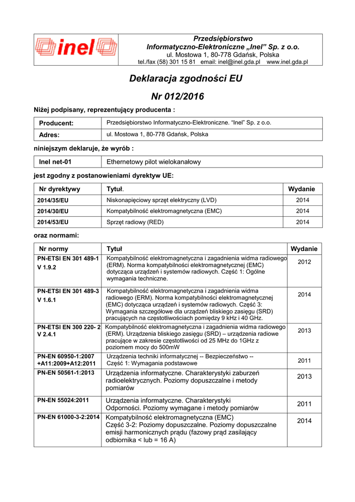 Przedsiębiorstwo Informatyczno-Elektroniczne „Inel” Sp. z o.o. ul. Mostowa 1, 80-778 Gdańsk, Polska tel./fax (58) 301 15 81 email: [email protected] www.inel.gda.pl Deklaracja zgodności EU Nr 012/2016 Niżej podpisany, reprezentujący producenta : Producent: Przedsiębiorstwo Informatyczno-Elektroniczne. “Inel” Sp. z o.o. Adres: ul. Mostowa 1, 80-778 Gdańsk, Polska niniejszym deklaruje, że wyrób : Inel net-01 Ethernetowy pilot wielokanałowy jest zgodny z postanowieniami dyrektyw UE: Nr dyrektywy Tytuł. Wydanie 2014/35/EU Niskonapięciowy sprzęt elektryczny (LVD) 2014 2014/30/EU Kompatybilność elektromagnetyczna (EMC) 2014 2014/53/EU Sprzęt radiowy (RED) 2014 oraz normami: Nr normy Tytuł PN-ETSI EN 301 489-1 V 1.9.2 Kompatybilność elektromagnetyczna i zagadnienia widma radiowego (ERM). Norma kompatybilności elektromagnetycznej (EMC) dotycząca urządzeń i systemów radiowych. Część 1: Ogólne wymagania techniczne. Kompatybilność elektromagnetyczna i zagadnienia widma radiowego (ERM). Norma kompatybilności elektromagnetycznej (EMC) dotycząca urządzeń i systemów radiowych. Część 3: Wymagania szczegółowe dla urządzeń bliskiego zasięgu (SRD) pracujących na częstotliwościach pomiędzy 9 kHz i 40 GHz. Kompatybilność elektromagnetyczna i zagadnienia widma radiowego PN-ETSI EN 300 220- 2 (ERM). Urządzenia bliskiego zasięgu (SRD) – urządzenia radiowe V 2.4.1 pracujące w zakresie częstotliwości od 25 MHz do 1GHz z poziomem mocy do 500mW PN-ETSI EN 301 489-3 V 1.6.1 PN-EN 60950-1:2007 +A11:2009+A12:2011 Urządzenia techniki informatycznej -- Bezpieczeństwo -Część 1: Wymagania podstawowe PN-EN 50561-1:2013 Urządzenia informatyczne. Charakterystyki zaburzeń radioelektrycznych. Poziomy dopuszczalne i metody pomiarów Urządzenia informatyczne. Charakterystyki Odporności. Poziomy wymagane i metody pomiarów PN-EN 61000-3-2:2014 Kompatybilność elektromagnetyczna (EMC) Część 3-2: Poziomy dopuszczalne. Poziomy dopuszczalne emisji harmonicznych prądu (fazowy prąd zasilający odbiornika < lub = 16 A) PN-EN 55024:2011 Wydanie 2012 2014 2013 2011 2013 2011 2014 Nr normy EN 61000-3-3:2013 Tytuł Wydanie Kompatybilność elektromagnetyczna (EMC) 2013 Część 3-3: Poziomy dopuszczalne. Ograniczanie zmian napięcia, wahań napięcia i migotania światła w publicznych sieciach zasilających niskiego napięcia, powodowanych przez odbiorniki o fazowym prądzie znamionowym < lub = 16 A przyłączone bezwarunkowo. Miejscowość : Gdańsk, dnia 25 maja 2016 roku Ryszard Sternicki - Członek Zarządu