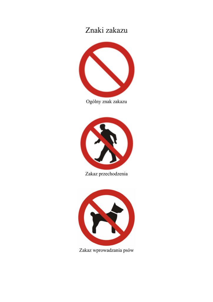 Znaki zakazu Ogólny znak zakazu Zakaz przechodzenia Zakaz wprowadzania psów Nieupoważnionym wstęp wzbroniony Zakaz włączania maszyny Nie dotykać