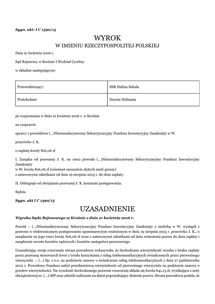 Sygn. akt: I C 1390/15 WYROK W IMIENIU RZECZYPOSPOLITEJ POLSKIEJ Dnia 21 kwietnia 2016 r. Sąd Rejonowy w Krośnie I Wydział Cywilny w składzie następującym: Przewodniczący: SSR Halina Sekuła Protokolant: Dorota Delimata po rozpoznaniu w dniu 21 kwietnia 2016 r. w Krośnie na rozprawie sprawy z powództwa (...)Niestandaryzowany Sekurytyzacyjny Fundusz Inwestycyjny Zamknięty w W. przeciwko J. K. o zapłatę kwoty 816,06 zł I. Zasądza od pozwanej J. K. na rzecz powoda (...)Niestandaryzowany Sekurytyzacyjny Fundusz Inwestycyjny Zamknięty w W. kwotę 816,06 zł (osiemset szesnaście złotych sześć groszy) z ustawowymi odsetkami od dnia 19 sierpnia 2015 r. do dnia zapłaty. II. Odstępuje od obciążania pozwanej J. K. kosztami postępowania. Sędzia Sygn. akt I C 1390/15 UZASADNIENIE Wyroku Sądu Rejonowego w Krośnie z dnia 21 kwietnia 2016 r. Powód – (...)Niestandaryzowany Sekurytyzacyjny Fundusz Inwestycyjny Zamknięty z siedzibą w W. wystąpił z pozwem w elektronicznym postępowaniu upominawczym wniesionym w dniu 19 sierpnia 2015 r. przeciwko J. K., o zasądzenie na jego rzecz kwoty 816,06 zł wraz z ustawowymi odsetkami od dnia wniesienia pozwu do dnia zapłaty i zasądzenie zwrotu kosztów sądowych i kosztów zastępstwa procesowego. Uzasadniając swoje roszczenie strona powodowa wskazywała, że dochodzona wierzytelność wynika z braku zapłaty przez pozwaną stosownych kwot z tytułu korzystania z usług telekomunikacyjnych świadczonych przez pierwotnego wierzyciela – (...) Sp. z o.o. na podstawie umowy o świadczenie usług telekomunikacyjnych z dnia 27 października 2012 r. Powodowy Fundusz nabył przedmiotową wierzytelność od pierwotnego wierzyciela na podstawie umowy o przelew wierzytelności. Na wysokość dochodzonego pozwem roszczenia składa się kwota 641,13 zł, wynikająca z noty obciążeniowej nr (...)-MP oraz odsetki naliczone na dzień poprzedzający złożenie pozwu. Strona powodowa podała, że zawiadomiła pozwaną o dokonaniu cesji wierzytelności i wezwała ją do dobrowolnej zapłaty należności w terminie 7 dni. J. K. w żaden sposób nie ustosunkowała się jednak do rzeczonego zawiadomienia, wobec czego strona powodowa wystąpiła z niniejszym pozwem. W następstwie powyższej czynności strony powodowej w dniu 22 września 2015 r. Sąd Rejonowy Lublin-Zachód w Lublinie wydał nakaz zapłaty, od którego pozwana w dniu 8 października 2015 r. skutecznie złożyła sprzeciw, w którym domagała się oddalenia powództwa w całości i orzeczenia o kosztach według norm przepisanych. Uzasadniając swoje stanowisko J. K. podniosła zarzut przedawnienia dochodzonego roszczenia. Nadto przyznała, iż zawarła umowę o świadczenie usług telekomunikacyjnych, jednakże faktycznie z nich nie korzystała, bowiem przekazała telefon wnuczce i w związku z tym nie czuje się zobowiązana do dokonania zapłaty. Na skutek złożenia przez pozwaną sprzeciwu w dniu 19 października 2015 r. zostało wydane postanowienie, mocą którego niniejsza sprawa została przekazana do rozpoznania Sądowi Rejonowemu w Krośnie. Sąd ustalił następujący stan faktyczny: W dniu 28 września 2012 r. w K. pomiędzy (...) Sp. z o.o. z siedzibą w W. a pozwaną J. K. doszło do zawarcia umowy o świadczenie usług telekomunikacyjnych w sieci (...) nr (...). Zgodnie z jej treścią pozwana była zobowiązana do dokonywania obowiązkowych zasileń konta, każdorazowo na minimalną kwotę w wysokości 30,00 zł. W związku z brakiem realizacji tego obowiązku w dniu 28 marca 2013 r. doszło do rozwiązania przedmiotowej umowy oraz naliczenia kary umownej w wysokości 641,13 zł zgodnie z § 6 ust. 11 Regulaminu świadczenia usług telekomunikacyjnych przez (...) Sp. z o.o. Dodatkowo za okres od 13 kwietnia 2013 r. do 18 sierpnia 2015 r. obciążono pozwaną kwotą należnych odsetek w wysokości 174,93 zł (dowód: odpis umowy o świadczenie usług telekomunikacyjnych z dnia 28.09.2012 r. nr (...) – k.68-70, odpis noty obciążeniowej nr (...)-MP z dnia 28.03.2013 r. – k.48, odpis powiadomienia o rozwiązaniu umowy wraz z wezwaniem do zapłaty z dnia 28.03.2013 r. – k.49, wyliczenie odsetek należnych na dzień 18.08.2015 r. – k.50, odpis regulaminu świadczenia usług telekomunikacyjnych przez (...) Sp. z o.o. – k.55-56). W dniu 30 października 2014 r. pomiędzy (...) Sp. z o.o. z siedzibą w W. a stroną powodową – (...)Niestandaryzowany Sekurytyzacyjny Fundusz Inwestycyjny Zamknięty z siedzibą w W. doszło do zawarcia umowy sprzedaży wierzytelności przysługującej w stosunku do pozwanej ( dowód: odpis umowy sprzedaży wierzytelności z dnia 30.10.2014 r. – k.35, załącznik nr 1 do umowy sprzedaży wierzytelności z dnia 30.10.2014 r. – k.37-40). Pismem z dnia 30 października 2014 r. powodowy Fundusz zawiadomił pozwaną o przelewie wierzytelności, natomiast pismem z dnia 29 grudnia 2014 r. wezwał J. K. do zapłaty długu, stanowiącego na dzień 5 stycznia 2015 r. kwotę 785,90 zł. Pozwana nie zadośćuczyniła powyższemu żądaniu (dowód: odpis zawiadomienia z dnia 30.10.2014 r. – k.46, wezwanie do zapłaty z dnia 29.12.2014 r. – k.47). Sąd zważył co następuje: Powództwo zasługuje na uwzględnienie. W niniejszej sprawie stan faktyczny nie budził wątpliwości i nie był sporny pomiędzy stronami. Został on ustalony w oparciu o dowody z dokumentów, przy czym Sąd nie znalazł podstaw do powzięcia wątpliwości dotyczących ich wiarygodności, albowiem w szczególności strony nie kwestionowały autentyczności czy rzetelności tych dokumentów. Tym niemniej należy mieć na uwadze, iż były to dokumenty prywatne, które zgodnie z art. 245 k.p.c. stanowią dowód tego, że osoba, która je podpisała, złożyła oświadczenie w nich zawarte. Nadto na rozprawie w dniu 21 kwietnia 2016 r. pozwana przyznała, iż zawarła umowę o świadczenie usług telekomunikacyjnych, a następnie oddała telefon wnuczce i nie miała d