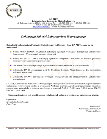LP-MET LP-MET Laboratorium Pomiarów Metrologicznych ul. Dobrego Pasterza 106; 31-416 Kraków. Tel: (+48) 507 929 409; (+48) 788 652 233 NIP: 945-113-56-17; REGON: 120808812 http://www.lpmet.pl e-mail: [email protected] Deklaracja Jakości Laboratorium Wzorcującego Działalność Laboratorium Pomiarów Metrologicznych Długości i Kąta LP- MET opiera się na wytycznych : Normy PN-EN ISO/IEC 17025:2005 dotyczącej ogólnych wymagań i kompetencji Laboratoriów Badawczych i Wzorcujących (norma systemowa). Normy PN-EN ISO 10012 dotyczącej systemów zarządzania pomiarami w zakresie procesów pomiarowych i wyposażenia pomiarowego. Dokumentu EA-4/02 dotyczącego wyrażania niepewności pomiarów przy wzorcowaniu. Dokumentu DA-06 dotyczącego polityki Polskiego Centrum Akredytacyjnego dla zapewnienia spójności pomiarowej. Dokumentu DAP-04 dotyczącego wymagań szczegółowych dla akredytowanych Laboratoriów wzorcujących. LP MET, Laboratorium Pomiarów Metrologicznych sporządza Świadectwo wzorcowania na potwierdzenie wykonanego wzorcowania zgodnie z wymogami Polskiego Centrum Akredytacyjnego, którego zawartość merytoryczna odpowiada przepisom określonym w punktach:5.6.2.1.1;5.10.2 oraz 5.10.4 normy PN-EN ISO/IEC 17025:2005. Naszym priorytetem jest wysoki poziom świadczonych usług, a przez to pełne zadowolenie klienta. Opracował: Specjalista ds. metrologii Piotr Tynor Zatwierdził: Kierownik Laboratorium Wojciech Klimek Firma LP - MET wpisana jest do Rejestru Instytucji Szkoleniowych Wojewódzkiego Urzędu Pracy w Krakowie pod numerem: 2.12/00199/2016 ZAKRES WYKONYWANYCH USŁUG Wzorcowanie: -Wzorcowanie pierścieni wzorcowych i sprawdzianów specjalnych, -Wzorcowanie pierścieni wzorcowych w zakresie od 0,5 - 300mm. -Wzorcowanie sprawdzianów specjalnych wykonywanych według dokumentacji wewnętrznej firm, -Wzorcowanie sprawdzianów gwintowych -wzorcowanie sprawdzianów gwintowych-trzpieniowych -wzorcowanie sprawdzianów gwintowych-pierścieniowych metrycznych (M; GR; IR) -wzorcowanie sprawdzianów gwintowych-calowych (R; G; UN; UNF; UNEF; UNC; UNS; NPSF; NPT; NPTF i innych) -wzorcowanie sprawdzianów gwintowych Trapezowych (Tr) -wzorcowanie sprawdzianów gwintowych stożkowych -wzorcowanie sprawdzianów gwintowych z gwintem Edisona -wzorcowanie sprawdzianów gwintowych Pg, Whithworta, i innych -wzorcowanie sprawdzianów tłoczkowych-do wałków i otworów -wzorcowanie sprawdzianów łopatkowych -wzorcowanie wzorców łuków kołowych metrycznych, calowych -wzorcowanie wzorców zarysu gwintu metrycznych, calowych -wzorcowanie wzorców do noży do gwintów -Wzorcowanie suwmiarek, wzorcowanie przyrządów suwmiarkowych: - Suwmiarki uniwersalne; suwmiarki modułowe; głębokościomierze; wysokościomierze; suwmiarki specjalne oraz z odczytem noniuszowym, zegarowym i cyfrowym, -wzorcowanie aparatury kontrolno-pomiarowej -wzorcowanie mikroskopów pomiarowych -wzorcowanie długościomierzy -wzorcowanie optimetrów, wzorcowanie ultraoptimetrów -wzorcowanie komparatorów -wzorcowanie projektorów pomiarowych -Wzorcowanie mikrometrów, wzorcowanie przyrządów mikrometrycznych: mikrometry do pomiarów zewnętrznych, wewnętrznych; wzorcowanie głębokościomierzy i wysokościomierzy mikrometrycznych; Wzorcowanie głowic mikrometrycznych; wzorcowanie mikrometrów specjalnych także z odczytem cyfrowym; wzorcowanie średnicówek mikrometrycznych-wszystkie typy; wzorcowanie średnicówek trójpunktowych -Wzorcowanie płytek wzorcowych długości o stopniowaniu mikronowym; dziesiętnym; komplety od 0,5-100mm oraz od 125-500mm, -Wzorcowanie czujników zegarowych. Czujniki zębate zegarowe i dźwigniowo-zębate, mikrokatory metryczne i calowe; z działką elementarną 0,1mm; 0,01mm; 0,001mm; 0,002mm; Wzorcowanie ściankomierzy czujnikowych, wzorcowanie średnicówek z czujnikiem zegarowym, wzorcowanie transametrów, wzorcowanie mikrometrów z czujnikiem -Wzorcowanie poziomnic: budowlanych, liniałowych, ramowych, kątowych, -Wzorcowanie Kątomierzy uniwersalnych, optycznych, poziomnicowych, -Wzorcowanie trzpieni kontrolnych prostych, Morse`a -Wzorcowanie pryzm wielościenne, innych, -Wzorcowanie liniałów krawędziowych -Wzorcowanie liniałów powierzchniowych, kreskowych sztywnych, półsztywnych, -Wzorcowanie przymiarów zwijanych -Wzorcowanie szczelinomierzy płytkowych, wałeczkowych, -Wzorcowanie wałeczków pomiarowych do gwintów (do pomiarów średnicy podziałowej gwintów) -Wzorcowanie przymiarów zwijanych od 1000mm do 20000mm, -Wzorcowanie wzorców nastawczych do mikrometrów -Wzorcowanie Kątowników stalowych 90 powierzchniowe, krawędziowe, -Wzorcowanie płyt pomiarowych: żeliwnych, stalowych, granitowych, -Wzorcowanie folii wzorcowych, Firma LP - MET wpisana jest do Rejestru Instytucji Szkoleniowych Wojewódzkiego Urzędu Pracy w Krakowie pod numerem: 2.12/00199/2016 -Wzorcowanie grubościomierzy ultradźwiękowych, -Wzorcowanie kluczy dynamometrycznych, -Wzorcowanie multimetrów, -Wzorcowanie przyrządów pomiarowych stosowanych w kolejnictwie, -Wzorcowanie toromierzy, -Wzorcowanie (pomiary)geometrii obrabiarek tokarek, frezarek, szlifierek, centrów obróbczych, dłutownic, honownic, centrów obróbczych, honownic, itp. -Wzorcowanie narzędzi skrawających pomiary rozwiertaków, pomiary frezów, pomiary stożków o zbieżności 7:24 -Wzorcowanie kluczy dynamometrycznych Pomiary i kontrola jakości: -pomiary warsztatowe w zakresie kontroli jakości: dostaw, międzyoperacyjnej i ostatecznej (odbiory na wydziałach produkcyjnych) -pomiary części maszyn, pomiary detali produkcyjnych -poziomowanie linii produkcyjnych -obliczenia wymiarów i tolerancji sprawdzianów gwintowych, do wałków i otworów, itp. -ekspertyzy metrologiczne, ekspertyzy pomiarowe, audyty kontroli jakości -opracowania technologii produkcji na podstawie dokumentacji technicznej, rysunku i wymagań klienta. Badania: wykonujemy badania z udziałem innych laboratoriów (kooperacja) -badania składu chemic