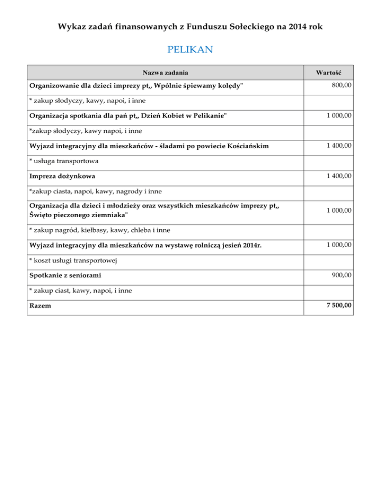 Wykaz zadań finansowanych z Funduszu Sołeckiego na 2014 rok PELIKAN Nazwa zadania Organizowanie dla dzieci imprezy pt,, Wpólnie śpiewamy kolędy" Wartość 800,00 * zakup słodyczy, kawy, napoi, i inne Organizacja spotkania dla pań pt,, Dzień Kobiet w Pelikanie" 1 000,00 *zakup słodyczy, kawy napoi, i inne Wyjazd integracyjny dla mieszkańców - śladami po powiecie Kościańskim 1 400,00 * usługa transportowa Impreza dożynkowa 1 400,00 *zakup ciasta, napoi, kawy, nagrody i inne Organizacja dla dzieci i młodzieży oraz wszystkich mieszkańców imprezy pt,, Święto pieczonego ziemniaka" 1 000,00 * zakup nagród, kiełbasy, kawy, chleba i inne Wyjazd integracyjny dla mieszkańców na wystawę rolniczą jesień 2014r. 1 000,00 * koszt usługi transportowej Spotkanie z seniorami 900,00 * zakup ciast, kawy, napoi, i inne Razem 7 500,00