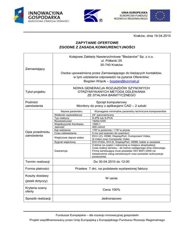Kraków, dnia 19.04.2010 ZAPYTANIE OFERTOWE ZGODNE Z ZASADĄ KONKURENCYJNOŚCI Kolejowe Zakłady Nawierzchniowe "Bieżanów" Sp. z o.o. ul. Półłanki 25 30-740 Kraków Zamawiający Osoba upoważniona przez Zamawiającego do bieżących kontaktów, w tym udzielania odpowiedzi na pytania Oferentów: Bogdan Wójcik – [email protected] NOWA GENERACJA ROZJAZDÓW SZYNOWYCH OTRZYMYWANYCH METODĄ ODLEWANIA ZE STALIWA BAINITYCZNEGO Tytuł projektu Podmiot zamówienia Opis przedmiotu zamówienia Sprzęt komputerowy Monitory do pracy z aplikacjami CAD – 2 sztuki Nazwa parametru Wielkość wyświetlacza Typ matrycy Rozdzielczość Współczynnik Kontrastu Jasność Kąt widzienia Czas odświeżania Wejściowe złącze wideo Sygnał wejściowy Gwarancja Wymagane minimalne parametry techniczne komponentów 24” panoramiczny S-IPS lub S-PVA 1920x1200 1000:1 400 cd/m2 178° w poziomie / 178° w pionie 5 ms (od szarości do szarości) DVI-I (2), HDMI, DisplayPort, Component Video, S-Video oraz Composite Video DVI-I/VGA, DVI-D, DisplayPort, HDMI, kable w zestawie 2-letnia na części i robociznę w miejscu eksploatacji. Czas reakcji serwisu - do końca następnego dnia roboczego. Firma serwisująca musi posiadać ISO 9001:2000 na świadczenie usług serwisowych oraz posiadać autoryzacje producenta. Termin realizacji Do 30.04.2010 do 12:00 Forma płatności Przelew 7 dni, na podstawie wystawionej faktury Koszty dostawy (jeżeli dotyczy) Kryteria oceny oferty Sposób realizacji W cenie Cena 100% Jednorazowo Fundusze Europejskie – dla rozwoju innowacyjnej gospodarki Projekt współfinansowany przez Unię Europejską z Europejskiego Funduszu Rozwoju Regionalnego Termin składania oferty 22.04.2010 do godziny 15:00 Sposób składania oferty Osobiście lub pocztą elektroniczną na adres: [email protected] Sposób przygotowania oferty W języku polskim, formie pisemnej lub dokumentu elektronicznego DOC lub PDF. Oferta powinna być złożona w walucie PLN w wartościach netto. Oferta powinna być sporządzona zgodnie ze wzorem formularza ofertowego (w załączniku). Fundusze Europejskie – dla rozwoju innowacyjnej gospodarki Projekt współfinansowany przez Unię Europejską z Europejskiego Funduszu Rozwoju Regionalnego