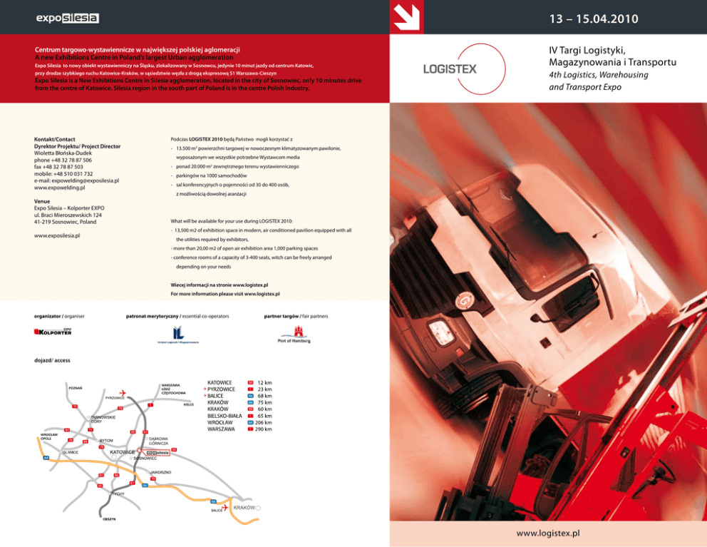 13 – 15.04.2010 Centrum targowo-wystawiennicze w największej polskiej aglomeracji A new Exhibitions Centre in Poland’s largest Urban agglomeration Expo Silesia to nowy obiekt wystawienniczy na Śląsku, zlokalizowany w Sosnowcu, jedynie 10 minut jazdy od centrum Katowic, przy drodze szybkiego ruchu Katowice-Kraków, w sąsiedztwie węzła z drogą ekspresową S1 Warszawa-Cieszyn Expo Silesia is a New Exhibitions Centre in Silesia agglomeration, located in the city of Sosnowiec, only 10 minutes drive from the centre of Katowice. Silesia region in the south part of Poland is in the centre Polish industry. Kontakt/Contact Dyrektor Projektu/ Project Director Wioletta Błońska-Dudek phone +48 32 78 87 506 fax +48 32 78 87 503 mobile: +48 510 031 732 e-mail: [email protected] www.expowelding.pl Venue Expo Silesia – Kolporter EXPO ul. Braci Mieroszewskich 124 41-219 Sosnowiec, Poland www.exposilesia.pl IV Targi Logistyki, Magazynowania i Transportu 4th Logistics, Warehousing and Transport Expo Podczas LOGISTEX 2010 będą Państwo mogli korzystać z - 13.500 m2 powierzchni targowej w nowoczesnym klimatyzowanym pawilonie, wyposażonym we wszystkie potrzebne Wystawcom media - ponad 20.000 m2 zewnętrznego terenu wystawienniczego - parkingów na 1000 samochodów - sal konferencyjnych o pojemności od 30 do 400 osób, z możliwością dowolnej aranżacji What will be available for your use during LOGISTEX 2010: - 13,500 m2 of exhibition space in modern, air conditioned pavilion equipped with all the utilities required by exhibitors, - more than 20,00 m2 of open air exhibition area 1,000 parking spaces - conference rooms of a capacity of 3-400 seats, witch can be freely arranged depending on your needs Wiecej informacji na stronie www.logistex.pl For more information please visit www.logistex.pl organizator / organiser patronat merytoryczny / essential co-operators partner targów / fair partners dojazd/ access www.logistex.pl Targi LOGISTEX to: The LOGISTEX Fair is all about: konsolidacja i integracja środowiska branży związanej z logistyką, magazynowaniem i transportem prezentacja ofert i osiągnięć firm działających w branży logistycznej szeroki wachlarz imprez towarzyszących, w tym: konferencje naukowe, seminaria branżowe, prezentacje własne firm, pokazy dynamiczne organizowane przez wystawców the consolidation and integration of circles related to the logistics, warehousing and transport industries presenting the offers and achievements of companies from the logistics industry a large selection of accompanying events, including: scientific conferences, industry specific seminars, companies’ presentations, dynamic demonstrations organized by the exhibitors Poprzednia edycja Last edition Do sosnowieckiego Centrum Targowo-Wystawienniczego przyjechało ponad 60 przedstawicieli firm logistycznych, dystrybucyjnych, transportowo-spedycyjnych, centrów logistycznych i dystrybucyjnych, biur doradczych, wydawnictw specjalistycznych, nie tylko z Polski, ale też Czech, Holandii i Niemiec. The Fair-Exhibition Center in Sosnowiec attracted over 60 representatives of logistics, distribution and transport and forwarding companies, logistics and distribution centers, consultancies and trade publications from Poland as well as the Czech Republic, the Netherlands and Germany. Do hali wjechały ciężarówki oraz samochody dostawcze. Wśród stoisk można było m.in. zobaczyć wózki widłowe, które są podwieszane do pojazdów. Zwiedzający Targi mieli również możliwość zapoznania się z oprogramowaniem komputerowym, które ułatwia pracę firmom transportowym, nowoczesnym wyposażeniem magazynów do składowania, urządzeniami magazynowymi, systemami utrzymania czystości czy systemami automatycznej identyfikacji danych. Zakres tematyczny targów: Sprzęt i urządzenia gospodarki magazynowej Sprzęt i urządzenia transportu wewnętrznego Sprzęt i wyposażenie transportu zewnętrznego Sprzęt do przetwarzania informacji logistycznej Komponenty, części zamienne, akcesoria, materiały eksploatacyjne Informatyka w logistyce Usługi telekomunikacyjne Usługi transportowe, magazynowe i spedycyjne Usługi naukowo-badawcze związane z logistyką Usługi szkoleniowe, bankowe, ubezpieczeniowe, audytorskie, certyfikacyjne Instytucje branżowe Wydawnictwa specjalistyczne www.logistex.pl Exhibited products and services: Warehouse management equipment Internal transport equipment External transport equipment Logistics information processing hardware Components, spare parts, accessories, maintenance materials IT systems in logistics Telecommunications services Transport, warehouse and forwarding services Logistics research and development services Training, finance, insurance, audits, certification Trade institutions Trade publications Among the vehicles displayed in the hall and among the stands were trucks, delivery vehicles and truck mounted fork-lifts. Visitors to the fair also had the opportunity to familiarize themselves with computer software which facilitates the work of transport companies, as well as modern storage equipment, warehouse equipment, cleaning systems and automatic data identification systems.