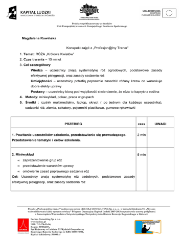 Projekt współfinansowany ze środków Unii Europejskiej w ramach Europejskiego Funduszu Społecznego Magdalena Rowińska Konspekt zajęć z „Profesjon@lny Trener” 1. Temat: RÓŻA „Królowa Kwiatów” 2. Czas trwania – 15 minut 3. Cel szczegółowy Wiedza – uczestnicy znają systematykę róż ogrodowych, podstawowe zasady efektywnej pielęgnacji, oraz zasady sadzenia róż Umiejętności – uczestnicy potrafią poprawnie zasadzić różany krzew co warunkuje dobre efekty uprawy Postawy – uczestnicy biorą pod wątpliwość stwierdzenie, że róża to kapryśna roślina 4. Metody: miniwykład, pokaz, praca w grupach 5. Środki : rzutnik multimedialny, laptop, skrypt ( po jednym dla każdego uczestnika), sadzonki róż, ziemia, sekatory, pojemniki plastikowe, gumowe rękawiczki PRZEBIEG 1. Powitanie uczestników szkolenia, przedstawienie się prowadzącego. czas UWAGI 2 min Przedstawienie tematyki i celów szkolenia. 2. Miniwykład • zaprezentowanie grup róż • przedstawienie warunków uprawy • omówienie zasad poprawnego sadzenia róż 5 min Cel: Uczestnicy znają systematykę róż ozdobnych, podstawowe zasady efektywnej pielęgnacji, oraz zasady sadzenia róż Projekt „Profesjon@lny trener” realizowany przez LECHAA CONSULTING Sp. z o. o. w ramach Działania 9.4 „Wysoko wykwalifikowane kadry systemu oświaty” Program Operacyjny Kapitał Ludzki 2007-2013 na podstawie umowy podpisanej z Samorządem Województwa Świętokrzyskiego/Świętokrzyskim Biurem Rozwoju Regionalnego w Kielcach Lechaa Consulting Sp. z o.o. www.lechaa.pl NIP: 712-278-35-96, Regon: 004182334, Sąd Rejonowy w Lublinie XI Wydział Gospodarczy Krajowego Rejestru Sadowego nr KRS: 0000173751, Kapitał zakładowy: 50.000 zł Projekt współfinansowany ze środków Unii Europejskiej w ramach Europejskiego Funduszu Społecznego Jeśli grupa 3. Ćwiczenie – praca w grupach (sadzenie róż) • podzielenie grupy na trzyosobowe zespoły • rozdanie akcesoriów do sadzenia roślin, (dla każdej grupy po jednym 6 min odmówi udziału w ćwiczeniach praktycznych, poprosić pojemniku, sekatorze, sadzonce, oraz rękawiczki dla wszystkich) ochotnika o Cel: Uczestnicy potrafią poprawnie zasadzić różany krzew co warunkuje dobre zaprezentowanie efekty uprawy. prawidłowego sadzenia. 2 min 4. Podsumowanie • nagrodzenie najlepszej drużyny • odpowiedź na pytania do prowadzącego Cel: Refleksja na temat wymagań uprawowych róż. Projekt „Profesjon@lny trener” realizowany przez LECHAA CONSULTING Sp. z o. o. w ramach Działania 9.4 „Wysoko wykwalifikowane kadry systemu oświaty” Program Operacyjny Kapitał Ludzki 2007-2013 na podstawie umowy podpisanej z Samorządem Województwa Świętokrzyskiego/Świętokrzyskim Biurem Rozwoju Regionalnego w Kielcach Lechaa Consulting Sp. z o.o. www.lechaa.pl NIP: 712-278-35-96, Regon: 004182334, Sąd Rejonowy w Lublinie XI Wydział Gospodarczy Krajowego Rejestru Sadowego nr KRS: 0000173751, Kapitał zakładowy: 50.000 zł