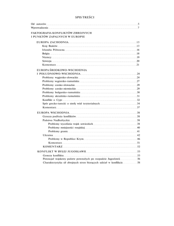 SPIS TREŚCI Od autorów Wprowadzenie 5 7 FAKTOGRAFIA KONFLIKTÓW ZBROJNYCH I PUNKTÓW ZAPALNYCH W EUROPIE EUROPA ZACHODNIA Kraj Basków Irlandia Północna Belgia Niemcy Szwecja Komentarz EUROPA ŚRODKOWO-WSCHODNIA I POŁUDNIOWO-WSCHODNIA Problemy węgjersko-słowackie Problemy węgiersko-rumuńskie Problemy Problemy Problemy Problemy czesko-słowackie czesko-niemieckie bułgarsko-rumuńskie ukraińsko-rumuńskie 13 13 16 18 19 20 21 24 24 27 29 29 30 31 Konflikt o Cypr Spór grecko-turecki o strefę wód terytorialnych 32 34 Komentarz 37 EUROPA WSCHODNIA Geneza podłoża konfliktów 38 38 Państwa Nadbałtyckie Problemy wycofania wojsk sowieckich Problemy mniejszości rosyjskiej Problemy granic 38 38 40 41 Ukraina Problemy w Republice Krym 42 46 Komentarz 51 KOMENTARZ 52 KONFLIKT W BYŁEJ JUGOSŁAWII Geneza konfliktu Potencjał wojskowy państw powstałych po rozpadzie Jugosławii Charakterystyka sił zbrojnych stron biorących udział w konflikcie 53 53 56 58 Walki w Słowenii Walki w Chorwacji Problem Sławonii Sytuacja w Macedonii Sytuacja w Kosowie i Matochii Walki w Bośni i Hercegowinie Komentarz 59 61 64 66 69 73 112 KONFLIKTY ZBROJNE I PUNKTY ZAPALNE NA BLISKIM WSCHODZIE PUNKTY ZAPALNE W WYBRANYCH PAŃSTWACH Iran Irak Problem Kurdystanu 115 115 118 123 Liban Jordania Syria Izrael Jemen Katar i Arabia Saudyjska Spór o wyspę Abu-Musa 130 133 134 136 148 151 152 KONFLIKT W KUWEJCIE Geneza konfliktu Konflikt kuwejcko-iracki Operacja „Pustynna Tarcza" 153 153 158 160 Operacja „Pustynna Burza" Operacja „Pustynny Miecz" Komentarz KOMENTARZ 169 176 181 184 WNIOSKI I UOGÓLNIENIA Z ANALIZY KONFLIKTÓW ZBROJNYCH I PUNKTÓW ZAPALNYCH BADANIA ILOŚCIOWE Intensywność konfliktów Wielkość strat ludzkich 185 186 187 CELE KONFLIKTÓW Problemy etniczno-narodowościowe Problemy kulturowo-religijne Problemy terytorialno-graniczne 188 188 190 191 Problemy przejęcia władzy 192 WŁAŚCIOWOŚCI KONFLIKTÓW 193 KOMENTARZ 197 ZAŁĄCZNIKI 205