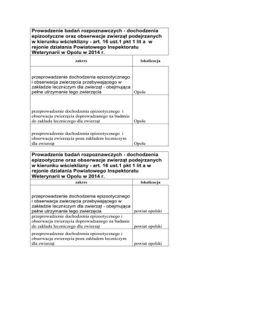 Prowadzenie badań rozpoznawczych - dochodzenia epizootyczne oraz obserwacje zwierząt podejrzanych w kierunku wścieklizny - art. 16 ust.1 pkt 1 lit a w rejonie działania Powiatowego Inspektoratu Weterynarii w Opolu w 2014 r. zakres lokalizacja przeprowadzenie dochodzenia epizootycznego i obserwacja zwierzęcia przebywającego w zakładzie leczniczym dla zwierząt - obejmująca Opole pełne utrzymanie tego zwierzęcia przeprowadzenie dochodzenia epizootycznego i obserwacja zwierzęcia doprowadzanego na badania do zakładu leczniczego dla zwierząt Opole przeprowadzenie dochodzenia epizootycznego i obserwacja zwierzęcia poza zakładem leczniczym dla zwierząt Opole Prowadzenie badań rozpoznawczych - dochodzenia epizootyczne oraz obserwacje zwierząt podejrzanych w kierunku wścieklizny - art. 16 ust.1 pkt 1 lit a w rejonie działania Powiatowego Inspektoratu Weterynarii w Opolu w 2014 r. zakres lokalizacja przeprowadzenie dochodzenia epizootycznego i obserwacja zwierzęcia przebywającego w zakładzie leczniczym dla zwierząt - obejmująca powiat opolski pełne utrzymanie tego zwierzęcia przeprowadzenie dochodzenia epizootycznego i obserwacja zwierzęcia doprowadzanego na badania do zakładu leczniczego dla zwierząt powiat opolski przeprowadzenie dochodzenia epizootycznego i obserwacja zwierzęcia poza zakładem leczniczym dla zwierząt powiat opolski