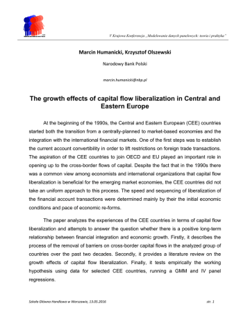 V Krajowa Konferencja „Modelowanie danych panelowych: teoria i praktyka” Marcin Humanicki, Krzysztof Olszewski Narodowy Bank Polski [email protected] The growth effects of capital flow liberalization in Central and Eastern Europe At the beginning of the 1990s, the Central and Eastern European (CEE) countries started both the transition from a centrally-planned to market-based economies and the integration with the international financial markets. One of the first steps was to establish the current account convertibility in order to lift restrictions on foreign trade transactions. The aspiration of the CEE countries to join OECD and EU played an important role in opening up to the cross-border flows of capital. Despite the fact that in the 1990s there was a common view among economists and international organizations that capital flow liberalization is beneficial for the emerging market economies, the CEE countries did not take an uniform approach to this process. The speed and sequencing of liberalization of the financial account transactions were determined mainly by their the initial economic conditions and pace of economic re-forms. The paper analyzes the experiences of the CEE countries in terms of capital flow liberalization and attempts to answer the question whether there is a positive long-term relationship between financial integration and economic growth. Firstly, it describes the process of the removal of barriers on cross-border capital flows in the analyzed group of countries over the past two decades. Secondly, it provides a literature review on the growth effects of capital flow liberalization. Finally, it tests empirically the working hypothesis using data for selected CEE countries, running a GMM and IV panel regressions. Szkoła Główna Handlowa w Warszawie, 13.05.2016 str. 1 V Krajowa Konferencja „Modelowanie danych panelowych: teoria i praktyka” JEL codes: C23, C26, E44, F21, F30, F43, O1. Keywords: capital flows, capital flow liberalization, Central and Eastern Europe, economic growth, panel data regressions Szkoła Główna Handlowa w Warszawie, 13.05.2016 str. 2