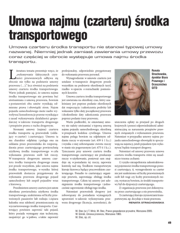 Umowa najmu (czarteru) środka transportowego Umowa czarteru środka transportu nie stanowi typowej umowy nazwanej. Niemniej jednak zamiast zawierania umowy przewozu coraz częściej w obrocie występuje umowa najmu środka transportu. L iteratura tematu prezentuje wręcz, że „wykonywanie faktycznych czynności przewozowych odbywa się obecnie nie tylko na podstawie umowy przewozu (…),” lecz również na podstawie umowy czarteru środka transportowego. Warto jednak pamiętać, że umowa najmu środka transportowego nie powinna być utożsamiana z umową przewozu, bowiem z postanowień obu umów wynikają odmienne prawa i obowiązki stron. Najem pojazdu samochodowego może nadto wywoływać konsekwencje prawne wynikające z zasad wykonywania działalności gospodarczej w zakresie transportu drogowego i przepisów prawa o ruchu drogowym. Stronami umowy (najmu) czarteru środka transportu są przewoźnik (oddający w czarter) i czarterujący. Umowa ta ma charakter odpłatny i polega ona na oddaniu przez przewoźnika do rozporządzenia przez czarterującego powierzchnię użytkową środka transportowego w celu wykonania przewozu osób lub rzeczy. W transporcie drogowym umowa czarteru środka transportu drogowego znana jest przede wszystkim, jako umowa najmu środka transportowego, w wyniku której przewoźnik dostarcza przygotowany do wykonania przewozu drogowego pojazd samochodowy lub zespół pojazdów wraz z kierowcą. Przedmiotem umowy czarteru jest zatem określona powierzchnia użytkowa środka transportowego, uzależniona od liczby przewożonych pasażerów lub rodzaju i ciężaru ładunku oraz zdolność przemieszczania się wyczarterowanego środka transportu. Czarterujący powinien zapewnić taki pojazd, który posiada wymagany stan techniczny, zaopatrzyć go w paliwo, a także zapewnić profesjonalny, odpowiednio przygotowany do wykonania przewozu personel. Wynagrodzenie w umowie czarteru jest ustalane w transporcie drogowym przede wszystkim na podstawie określonych taryf, rzadko w oparciu o rozrachunki poniesionych kosztów. Umowa czarteru środka transportowego jest zawierana na określony czas, który uzależniany jest poprzez podanie określonych dat rozpoczęcia i zakończenia podróży lub wskazanie tylko daty początkowej przewozu i dookreślenie daty zakończenia przewozu poprzez podanie trasy przewozu. Warto podkreślić, że omawianej umowy nie należy utożsamiać z typową umową najmu pojazdu samochodowego, określoną w przepisach kodeksu cywilnego. Umowa najmu polega bowiem na odpłatnym oddaniu rzeczy w używanie (art. 659 § 1 k.c.) i wynika z niej zobowiązanie zwrotu rzeczy w stanie nie pogorszonym (art. 675 § 1 k.c.). Tymczasem przy umowie czarteru środka transportowego czarterujący nie przekazuje rzeczy w użytkowanie, ponieważ sam znajduje się w posiadaniu tej rzeczy, zapewnia kontrolę nad nią. Środkiem transportowym kieruje kierowca będący pracownikiem czarterującego. Ponadto to czarterujący organizuje przewóz, zapewniając obsługę środka transportowego. Celem tej umowy jest udostępnienie środka transportowego i jednocześnie zapewnienie obsługi tego środka. Natomiast przewoźnik drogowy jest zobowiązany do posiadania wymaganych uprawnień w zakresie wykonywania przewozu drogowego (licencja, zezwolenie), do Renata Strachowska, dyrektor Biura Prawnego i Orzecznictwa GITD uiszczenia opłaty za przejazd po drogach krajowych i ponosi odpowiedzialność administracyjną za naruszenia przepisów prawnych związanych z wykonaniem przewozu. Natomiast w przypadku umowy najmu pojazdu samochodowego obowiązki te spoczywają na najemcy, jeżeli pojazdem tym wykonywać będzie transport drogowy. Natomiast od umowy przewozu umowa czarteru środka transportu różni się zasadniczo trzema cechami: 1) ryzyko niezapełnienia zakontraktowanej pojemności środka transportowego ponosi czarterujący, tj. wynagrodzenie za czarter nie jest uzależnione od liczby przewiezionych osób lub wagi czy liczby przewożonych rzeczy, wystarczy bowiem, że środek transportowy był do dyspozycji czarterującego, 2) organizacja przewozu jest dokonywana przez czarterującego a nie przewoźnika, 3) czarterujący kieruje czynnościami transportowymi, np. decyduje o trasie przewozu. Renata Strachowska M. Stec (w:) T. Mróz, M. Stec, Prawo gospodarcze prywatne, Warszawa 2005. W. Górski, Umowa przewozu, Warszawa 1983. M. Stec, op. cit. 49