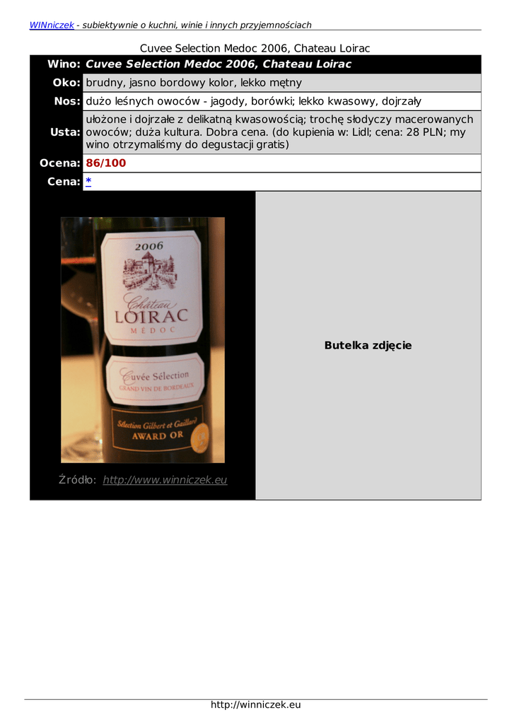 WINniczek - subiektywnie o kuchni, winie i innych przyjemnościach Cuvee Selection Medoc 2006, Chateau Loirac Wino: Cuvee Selection Medoc 2006, Chateau Loirac Oko: brudny, jasno bordowy kolor, lekko mętny Nos: dużo leśnych owoców - jagody, borówki; lekko kwasowy, dojrzały ułożone i dojrzałe z delikatną kwasowością; trochę słodyczy macerowanych Usta: owoców; duża kultura. Dobra cena. (do kupienia w: Lidl; cena: 28 PLN; my wino otrzymaliśmy do degustacji gratis) Ocena: 86/100 Cena: * Butelka zdjęcie Źródło: http://www.winniczek.eu http://winniczek.eu