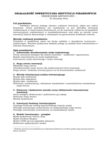 DZIAŁALNOŚĆ INWESTYCYJNA INSTYTUCJI FINANSOWYCH - PRZEWODNIK METODYCZNY – - Dr Krystian Pera Cel przedmiotu: Przedmiot dotyczy jednego obszaru realizacji inwestycji, jakim jest sektor finansowy. Celem przedmiotu jest wyjaśnienie co jest specyfiką inwestycji realizowanych w instytucjach finansowych, na ile inwestycje róŜnią się od projektów inwestycyjnych realizowanych w przedsiębiorstwach oraz jakie są metody oceny inwestycji sektora finansowego w nawiązaniu do generowania moŜliwości wzrostu Metody realizacji przedmiotu Przedmiot w zasadniczej części ma formę wykładu o charakterze teoretyczno praktycznym. Warstwa praktyczna wykładu polega na analizie form inwestowania w sektorze finansowym. Opis przedmiotu1 1. Inwestorska charakterystyka rynku kapitałowego Formy inwestycji dostępne dla sektora finansów – moŜliwości i ograniczenia Ryzyko inwestowania na rynku kapitałowym Instrumenty rynku pierwotnego i rynku wtórnego 2. Stopa zwrotu inwestycji Składniki stopy zwrotu Charakterystyka stopy zwrotu dla zróŜnicowanych form inwestycji Stopy zwrotu funduszy inwestycyjnych na tle benchmarków rynkowych 3. Metody statystycznej analizy inwestycyjnego Ryzyko jako zmienność Ryzyko jako zagroŜenie Ryzyko jako wraŜliwość Wariancja, semiwariancja, odchylenie standardowe i semiodchylenie standardowe stopy zwrotu 4. Statyczne i dyskontowe metody oceny efektywności ekonomicznej inwestycji Istota kategorii efektywności i podstawowe jej rodzaje Statyczne stopy zwrotu Metody dyskontowe 5. Inwestycje funduszy inwestycyjnych Typologia funduszy według dopuszczalnego stopnia ryzyka Strategie inwestycyjne zorientowane na maksymalizaję stopy zwrotu Strategie inwestycyjne zorientowane na minimalizację ryzyka 6. Modele inwestycyjne – przegląd Model dyskontowy wyceny akcji Model Gordona-Shapiro Model CAPM wyceny kapitałów własnych MoŜliwości aplikacyjności modeli 1 Struktura merytoryczna przedmiotu jest uzaleŜniona kaŜdorazowo od ilości godzin zajęć przeznaczonych w danym semestrze. I 7. Elementy analizy portfelowej Istota portfela inwestycyjnego Ryzyko portfela i korelacja składników Stopa zwrotu portfela aktywów finansowych Analiza portfela dwuskładnikowego 8. Inwestowanie w derywaty Istota hedgingu i spekulacji Kontrakty futers – krótka charakterystyka Opcje na rynku papierów wartościowych, profile wypłaty Transakcje swapowe instytucji finansowych KONSPEKT WAśNIEJSZYCH ZAGADNIEŃ Decyzja w procesie inwestycyjnym i proste (statyczne) mierniki efektywności Inwestując bezpośrednio przedsiębiorcy oceniają projekt z uwzględnieniem głównie czynników dotyczących samej produkcji, rentowności sprzedaŜy i innych czynników na które mogą mieć bezpośredni wpływ. MoŜna tego dokonywać stosując przedstawione w rozdziałach kolejnych metody statyczne i dynamiczne oceny projektów inwestycyjnych, które nawet ze względu na swoją metodologię nie nastręczają większych trudności. TakŜe stopień niepewności towarzyszący inwestycjom bezpośrednim jest nieporównywalnie mniejszy, aniŜeli w przypadku inwestycji drugiego rodzaju. Dlatego teŜ ze szczególną uwagą naleŜałoby się zająć problemem decyzji w aspekcie inwestycji rynkowych, kapitałowych. Inwestowanie, czy to w papiery wartościowe, czy we wszelkiego rodzaju instrumenty finansowe sprawia, Ŝe inwestor podejmuje decyzje w warunkach szczególnego ryzyka. Dotyczą bowiem przyszłości, której nie da się w 100% przewidzieć. W ostatecznym rozrachunku inwestora giełdowego interesuje stopa zysku, którą otrzyma z zaangaŜowanego kapitału. O ile ustalenie zysku ex post jest rzeczą względnie prostą, o tyle przewidywanie jej wysokości w przyszłości ex ante nastręcza duŜo trudności i dodatkowo nie daje pewności o takim właśnie wnioskowaniu. Stopa zysku moŜe przyjmować w przyszłości róŜne wartości z przypisanym tym poziomom róŜnym prawdopodobieństwem, które zaleŜeć moŜe od wielu czynników. Niektóre z tych czynników w Ŝaden sposób nie dadzą się wyskalować, przez co uwzględnianie ich w analizie numerycznej jest wykluczone. Pomimo wielu skal pomiaru dostępnych na poziomie nowoczesnej statystyki trudno jest np. zmierzyć i przyjąć do analizy sytuację polityczną na świecie lub teŜ sytuację gospodarczą (co jest znacznie łatwiejsze od pierwszego przykładu). Powstaje zatem pytanie, w jaki sposób prognozować, na podstawie róŜnych stóp zysku, by w stopniu jak największym zbliŜyć się do stanu natury, jaki nastąpi w przyszłości. Określenie bowiem stopy zysku z zainwestowanego kapitału staje się podstawą podejmowania decyzji inwestycyjnych. Decyzje dotyczące projektów inwestycyjnych bezpośrednich są łatwiejsze z reguły, aniŜeli decyzje dotyczące pośrednich projektów inwestycyjnych, czyli inwestycji na rynkach kapitałowych. Przyczyną takiego stanu rzeczy jest fakt, Ŝe inwestowanie na giełdzie wiąŜe się z istnieniem zwiększonego ryzyka. Proces decyzyjny w takim przypadku to rozwiązywanie równania co najmniej z trzema zmiennymi (niewiadomymi) magiczny trójkąt inwestora na rynku finansowym: • Rentowność: - okresowe płatności pienięŜne, - zysk kapitałowy. 2 I • Kontrolowanie ryzyka: - ryzyko, - łatwa zbywalność instrumentu. • Płynność finansowa: - bezpieczeństwo, - niskie koszty transakcyjne. Ogólnie rzecz biorąc w przypadku inwestycji stajemy przed wyborem: kupna większego ryzyka ale i większej spodziewanej stopy zysku, czy teŜ ograniczenia się do zadawalającej nas stopy zysku, przy ponoszeniu minimalnego ryzyka. Statyczne metody oceny efektywności Realizacja przedsięwzięć rozwojowych wymaga uprzedniego poniesienia nakładów inwestycyjnych, co ma na celu osiągnięcie zamierzonej nadwyŜki finansowej w przyszłości. Tak więc, zarówno w fazie realizacji inwestycji, jak teŜ w okresie jej eksploatacji ma miejsce rozłoŜony w czasie, przepływ środków pienięŜnych, czyli tzw.: c