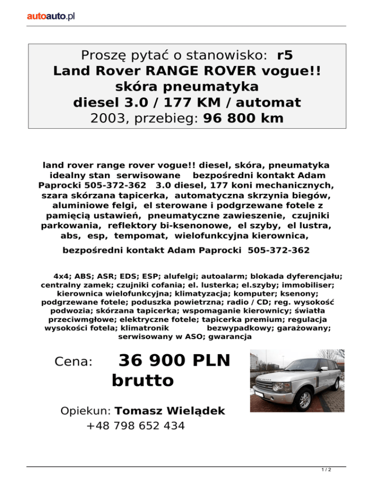 Proszę pytać o stanowisko: r5 Land Rover RANGE ROVER vogue!! skóra pneumatyka diesel 3.0 / 177 KM / automat 2003, przebieg: 96 800 km land rover range rover vogue!! diesel, skóra, pneumatyka idealny stan serwisowane bezpośredni kontakt Adam Paprocki 505-372-362 3.0 diesel, 177 koni mechanicznych, szara skórzana tapicerka, automatyczna skrzynia biegów, aluminiowe felgi, el sterowane i podgrzewane fotele z pamięcią ustawień, pneumatyczne zawieszenie, czujniki parkowania, reflektory bi-ksenonowe, el szyby, el lustra, abs, esp, tempomat, wielofunkcyjna kierownica, bezpośredni kontakt Adam Paprocki 505-372-362 4x4; ABS; ASR; EDS; ESP; alufelgi; autoalarm; blokada dyferencjału; centralny zamek; czujniki cofania; el. lusterka; el.szyby; immobiliser; kierownica wielofunkcyjna; klimatyzacja; komputer; ksenony; podgrzewane fotele; poduszka powietrzna; radio / CD; reg. wysokość podwozia; skórzana tapicerka; wspomaganie kierownicy; światła przeciwmgłowe; elektryczne fotele; tapicerka premium; regulacja wysokości fotela; klimatronik bezwypadkowy; garażowany; serwisowany w ASO; gwarancja Cena: 36 900 PLN brutto Opiekun: Tomasz Wielądek +48 798 652 434 1/2 Al. Krakowska 178, Punkt D 2/2