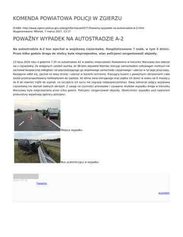 KOMENDA POWIATOWA POLICJI W ZGIERZU Źródło: http://www.zgierz.policja.gov.pl/ezg/informacje/4277,Powazny-wypadek-na-autostradzie-A-2.html Wygenerowano: Wtorek, 7 marca 2017, 13:17 POWAŻNY WYPADEK NA AUTOSTRADZIE A-2 Na autostradzie A-2 bus wjechał w wojskową ciężarówkę. Hospitalizowano 7 osób, w tym 5 dzieci. Przez kilka godzin droga do stolicy była nieprzejezdna, więc policjanci zorganizowali objazdy. 13 lipca 2016 roku o godzinie 7.25 na autostradzie A2 w pobliżu miejscowości Kowalewice w kierunku Warszawy bus zderzył się z ciężarówką. Ze wstępnych ustaleń wynika, że 38-letni obywatel Niemiec kierując samochodem volkswagen multivan nie zachował bezpiecznej odległości od poprzedzającego go wojskowego samochodu ciężarowego i uderzył w tył jego przyczepy. Następnie odbił się, zjechał na lewą stronę i uderzył w barierki ochronne. Kierujący busem z poważnymi obrażeniami ciała został przetransportowany helikopterem do szpitala. 42-letnia żona kierującego oraz piątka ich dzieci w wieku od 9 miesięcy do 8 lat również trafili do szpitali, na szczęście ich życiu nie zagraża niebezpieczeństwo. Dwaj żołnierze jadący wojskową ciężarówką nie doznali żadnych obrażeń. Z uwagi na czynności procesowe i usuwanie skutków wypadku droga w kierunku Warszawy była nieprzejezdna przez kilka godzin. Policjanci zorganizowali objazdy. Okoliczności wypadku pod nadzorem prokuratury wyjaśniają zgierscy policjanci. Miejsce wypadku Bus uczestniczący w wypadku Ocena: 0/5 (0) Tweetnij wypadek