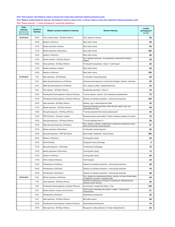 Pole "Data imprezy" dla kolejnych imprez w danym dniu można (dla czytelności tabeli) pozostawić puste Pole "Miejsce przeprowadzenia imprezy" dla kolejnych imprez w danym dniu i w danym miejscu można (dla czytelności tabeli) pozostawić puste Pola "Nazwa imprezy" i "Liczba startujących" muszą być wypełnione Data imprezy [dd-mm-rrrr] [rrrr-mm-dd] 26.05.2013 27.05.2013 28.05.2013 Godzina imprezy Miejsce przeprowadzenia imprezy Nazwa imprezy Liczba startujących [liczba] 10:00 Teren wokół szkoły - ZS Stary Wiśnicz Gry i zabawy w terenie 20 10:00 Stadion w Wiśniczu Mecz piłki nożnej 40 11:00 Boisko sportowe w Kobylu Mecz piłki nożnej 40 11:30 Boisko sportowe w Muchówce Mecz piłki nożnej 160 14:00 Stadion w Wiśniczu Mecz piłki nożnej 40 14:00 Boisko szkolne - ZS Stary Wiśnicz Gry i zabawy terenowe - tor przeszkód z elementami skoków i biegów 20 15:00 Hala sportowa - ZS Stary Wiśnicz Turniej piłki koszykowej - klasa I i II gimnazjum 20 17:00 Boisko sportowe w Kobylu Mecz piłki nożnej 40 18:00 Stadion w Wiśniczu Mecz piłki nożnej 150 7:30 Hala sportowa - ZS Królówka Turniej piłki nożnej dziewcząt 26 8:30 Mała sala gimnastyczna w Królówce Ćwiczenia gimnastyczne z elementami biegów, skoków i siłowania 20 9:30 Mała sala gimnastyczna w Królówce Gry i zabawy z piłką - współzawodnictwo 23 9:00 Plac szkolny - ZS Stary Wiśnicz Rywalizacja sportowa - klasy IV 32 10:00 Przedszkole Samorządowe w Starym Wiśniczu "Lubimy zabawy i sporty". Gry zespołowe przedszkolaka 33 10:00 Przedszkole Samorządowe w Nowym Wiśniczu Zabawy na świeżym powietrzu - konkurencje sportowe 10:00 Hala sportowa - ZS Stary Wiśnicz Zabawy i gry z wykorzystaniem piłek 32 11:00 Boisko sportowe - ZS Stary Wiśnicz Klasowa olimpiada sportowa: skoki obunóż, skoki w dal, rzut woreczkiem do celu 40 13:00 Sala gimnastyczna - ZS Nowy Wiśnicz "Turniej koszykówli dla szkoły podstawowej" 24 13:00 PSP Chronów - Chronów i okolice Wycieczk piesza pod hasłem "Cudze chwalimy sewego nie znamy" 10 13:00 Sala gimnastyczna - ZS Nowy Wiśnicz "Turniej siatkówki klas VI" 36 10:30 Mała sala gimnastyczna w Królówce Gry i zabawy z piłkami, skakankami i przyborami wybranymi przez dzieci-prezentacje sprawnościowe 51 14:00 Boisko sportowe w Muchówce Turniej piłki nożnej chłopców 40 16:00 Sala gimnastyczna - PSP Muchówka Dzień Matki. Akademia - tańce ludowe 16:00 Stadion w Wiśniczu Trening piłki nożnej 18:00 Orlik Królówka Rozgrywki tenisa ziemnego 17:00 Sala gimnastyczna - ZS Kobyle Turniej tenisa stołowego 16 17:00 Boisko sportowe w Muchówce Trening piłki nożnej 13 17:00 Stadion w Wiśniczu Trening piłki nożnej 20 11:00 Orlik w Starym Wiśniczu Test Coopera 24 10:00 Przedszkole w Królówce Zabawy na świeżym powietrzu - konkurencje sportowe 46 10:00 Przedszkole w Olchawie Zabawy na świeżym powietrzu - konkurencje sportowe 18 10:00 Przedszkole w Muchówce Zabawy na świeżym powietrzu - konkurencje sportowe 28 Gry i zabawy ze wspózawodnictwem, zabawy ruchowe doskonalące umiejętność rzucania i chwytania piłki Sportowa rywalizacja w minigrach zespołowych. Międzyklasowe zawody w piłce ręcznej 125 100 30 4 44 8:30 Boisko sportowe w Królówce 7:30 Hala sportowa - ZS Stary Wiśnicz 9:00 Przedszkole Samorządowe w Nowym Wiśniczu Uroczystość z okazji Dnia Mamy i Taty 9:00 Boisko szkolne i boisko Gryf Chronów Dzień sportu szkolnego dla dużych i małych - konkurencje indywidualne 21 9:00 Przedszkole w Królówce Dyskoteka przedszkolna 42 9:10 Hala sportowa - ZS Stary Wiśnicz Mini piłka ręczna 20 10:00 Przedszkole Samorządowe w Starym Wiśniczu Spartakiada przedszkolna 14 10:00 Hala sportowa - ZS Stary Wiśnicz Rozgrywki w piłkę siatkową. Turnieje międzyklasowe 24 24 130 29.05.2013 9:30 Boisko sportowe w Królówce Gry i zabawy ze wspózawodnictwem, zabawy ruchowe doskonalące umiejętność rzucania i chwytania piłki 50 10:45 Plac wokół szkoły - ZS Stary Wiśnicz Pokonywanie naturalnego toru przeszkód 24 10:45 Plac wokół szkoły - ZS Stary Wiśnicz Bieg z przeszkodami w terenie 24 10:50 Las przy szkole - ZS Stary Wiśnicz Bieg na orientację 23 11:00 Sala gimnastyczna - PSP Muchówka Turniej siatkówki dziewcząt i chłopców 48 12:50 Teren przed szkołą - ZS Królówka Test Coopera 25 13:30 Sala gimnastyczna - ZS Nowy Wiśnicz "Halowy Turniej Piłki Nożnej dla klas gimnazjalnych" 28 9:00 Orlik BKS Bochnia Turniej o puchar Tymbarku-zawody powiatowe w mini piłce nożnej chłopców 70 15:00 Sala gimnastyczna - ZS Nowy Wiśnicz "Halowy Turniej Piłki Nożnej dla szkoły podstawowej" 25 13:00 Orlik Królówka Rozgrywki w piłce nożnej 23 18:00 Boisko sportowe w Kobylu Trening piłki nożnej 18 18:00 Stadion w Wiśniczu Trening piłki nożnej 20 9:00 Przedszkole w Olchawie Dyskoteka przedszkolna 19 9:00 Przedszkole w Muchówce Dyskoteka przedszkolna 26 15:00 Orlik w Królówce Rozgrywki w piłce siatkowej 14 9:00 Przedszkole Samorządowe w Nowym Wiśniczu Zabawy ruchowe w ogrodzie przedszkolnym 122 8:00 Stadion sportowy "Dzień Sportu" - szkoła podstawowa i gimnazjum 374 8:30 Boisko sportowe w Królówce Ćwiczenia gimnastyczne z elementami biegów, skoków i siłowania 48 9:00 Przedszkole Samorządowe w Starym Wiśniczu O/Kobyle Gry i zabawy sportowe 26 9:00 PSP Muchówka "Dzień bez tytoniu" - przedstawienie, konkurs plastyczny 60 9:10 Sale lekcyjne - ZS Stary Wiśnicz Zabawy z wykorzystaniem gier planszowych 23 10:00 Przedszkole Samorządowe w Starym Wiśniczu O/Nowy Wiśnicz Gry i zabawy zespołowe 22 10:00 Plac wokół szkoły - ZS Stary Wiśnicz Zabawy z elementami szukania 30 10:00 Plac przy szkole - ZS Stary Wiśnicz Zabawy i gry z pokonywaniem przeszkód 30 10:50 Boisko szkolne - ZS Stary Wiśnicz Rozgrywki piłki nożnej dla gimnazjum 30 11:00 PSP Muchówka "Konkurs piosenki o niepaleniu" 40 11:00 Boisko szkolne - ZS Stary Wiśnicz Rozgrywki piłki nożnej dla szkoły podstawowej 23 11:00 Plac zabaw w Starym Wiśniczu Gry i zabawy ruc