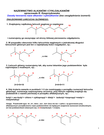NAZEWNICTWO ALKANÓW I CYKLOALKANÓW opracowała R. Kasprzykowska Zasady tworzenia nazw alkanów i cykloalkanów (bez uwzględniania izomerii): ZNAJDOWANIE ŁAŃCUCHA GŁÓWNEGO: 1. Znajdujemy najdłuższy łańcuch węglowy w cząsteczce 2 4 6 8 3 5 1 10 9 7 i numerujemy go zaczynając od strony bliższej pierwszemu odgałęzieniu. 2. W przypadku obecności kilku łańcuchów węglowych o jednakowej długości łańcuchem głównym jest ten o największej ilości rozgałęzień, np.: 4 6 4 3 2 6 3 1 5 5 , a nie: 2 1 3. Łańcuch główny numerujemy tak, aby suma lokantów jego podstawników była najmniejsza z możliwych, np.: 3 2 3 6 4 5 , a nie: 1 1 2 4 5 6 2+3+5=10 2+4+5=11 4. Gdy kryteria zawarte w punktach 1-3 nie rozstrzygają o porządku numeracji łańcucha głównego, numerację rozpoczynamy od końca, przy którym najbliżej znajduje się podstawnik o nazwie pierwszej w porządku alfabetycznym, np.: butyl > sec-butyl > chloro > cyklopropyl > dietyl > izobutyl >izopropyl >metyl > metyloheksyl Uwaga. Przedrostki typu: di-, tri-, tetra-, sec-, tert- (lecz nie izo- i cyklo-) są ignorowane przy alfabetycznym porządkowaniu nazw podstawników nie będących wzajemnie izomerami strukturalnymi, ani też podstawnikami złożonymi (np. 2-dimetylobutylo < 2-etylo). 2 1 4 3 6 5 6 7 7 4 5 3 2 1 , a nie: 1 TWORZENIE NAZWY: 5. Tworzymy nazwę jako jedno słowo, ustawiając podstawniki w porządku alfabetycznym określając ich ilość (przy pomocy przedimków di-, tri- itp...) i położenie przy łańcuchu głównym, np.: Br Br 1 2 4 nazwa: 3,5-dibromo-2-metyloheksan 5 3 6 CH3 wszystkie lokanty nazwa podstawnika podstawników -Br ilość podstawnazwa łańcucha głównego ników -Br 6. Nazwy systematyczne podstawników rozgałęzionych tworzymy numerując ich najdłuższy łańcuch węglowy, zaczynając od strony połączenia z łańcuchem głównym związku, np.: 3 nazwa: 2,2-dimetylo-5-(2-metylopropylo)dekan 2 1 10 9 8 7 6 1 5 4 3 cała nazwa podstawnika złożonego w nawiasie 2 (lub inna nazwa: 5-izobutylo-2,2-dimetylodekan) 7. Niektóre prostsze alkile rozgałęzione posiadają nazwy zwyczajowe, które mogą być stosowane na równi z nazwami systematycznymi: H3C CH3 CH izopropyl H2 C H3C CH H3C CH3 CH3 sec-butyl CH H2 C izobutyl H3C CH H2 C CH3 izopentyl (izoamyl) H3C H3C C CH3 tert-butyl H2 H3C C CH2 H3C C CH3 CH3 tert-pentyl (tert-amyl) H3C C H2 C CH3 neopentyl 2 TWORZENIE NAZW CYKLOALKANÓW 8. Nazwy cykloalkanów zawierają przedrostek "cyklo" przed nazwą łańcucha głównego. 9. Pierścień cykloalkanów nieskondensowanych numeruje się a) zaczynając od at. węgla, przy którym znajduje się podstawnik pierwszy alfabetycznie oraz b) w kierunku takim, aby suma lokantów wszystkich podstawników pierścienia była jak najmniejsza. Cl 7 CH3 1 2 3 6 5 4 nazwa: 1-chloro-5-etylo-2-metylocykloheptan H3C-H2C 10. W cykloalkanach o dwóch pierścieniach skondensowanych a) numerację rozpoczynamy od atomu wspólnego, należącego do mostka najdłuższego b) suma lokantów podstawników tego mostka musi być najmniejsza; c) numerowanie drugiego i następnych mostków kontynuujemy w kolejności ich malejącej długości i już niezależnie od położenia i pierwszeństwa podstawników; 8 5 6 H3C nazwa: 3-etylo-2,7-dimetylo-bicyklo[3.2.1]oktan 4 2 1 7 CH2-CH3 H3C 3 d) gdy istnieje kilka najdłuższych mostków o jednakowym rozmiarze, to (wg malejącej hierarchi kryteriów): - bardziej rozgałęzione mają pierwszeństwo w numeracji przed mniej rozgałęzionymi; - suma lokantów ich podstawników musi być jak najmniejsza; - podstawniki pierwsze alfabetycznie mają niższe numery lokantów. Cl 2 Cl nazwa: H3C 1 3 6 7 Cl 8 4 Cl 5 2,2,5,8-tetrachloro-5,7-dimetylobicyklo[2.2.2]oktan CH3 e) tworząc nazwę, określamy ilość pierścieni w związku przez użycie przedrostków "bicyklo", " tricyklo" itp...; f) w nazwie definiujemy rozmiary mostków (bez atomów wspólnych) w nawiasach kwadratowych, bezpośrednio przed nazwą łańcucha głównego. 3