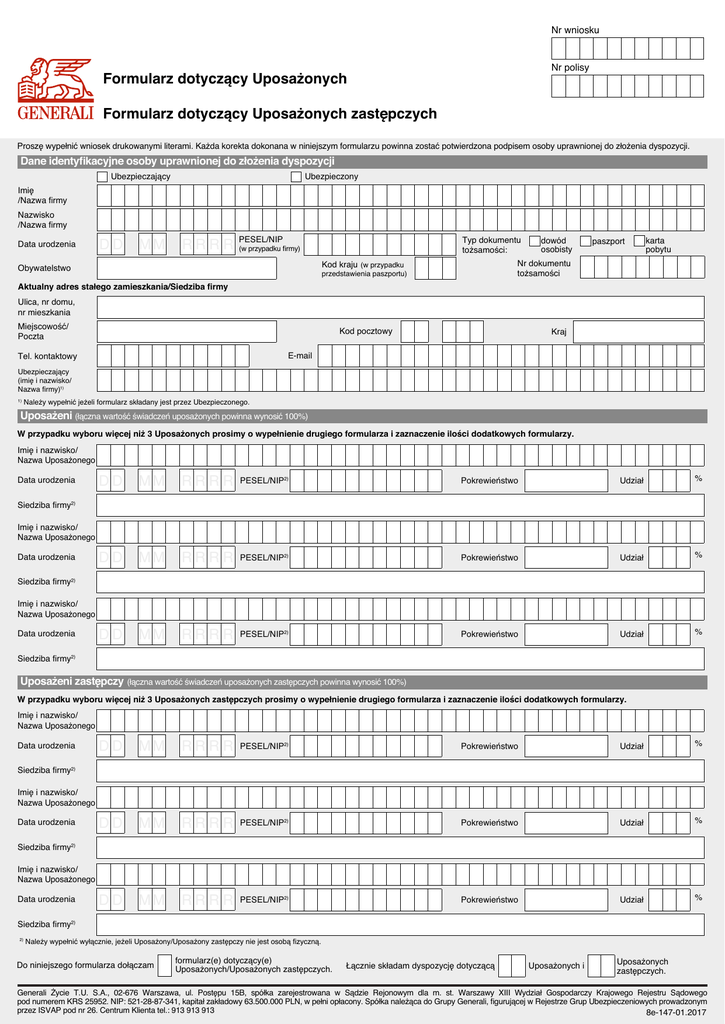 Nr wniosku Nr polisy Formularz dotyczący Uposażonych Formularz dotyczący Uposażonych zastępczych Proszę wypełnić wniosek drukowanymi literami. Każda korekta dokonana w niniejszym formularzu powinna zostać potwierdzona podpisem osoby uprawnionej do złożenia dyspozycji. Dane identyfikacyjne osoby uprawnionej do złożenia dyspozycji Ubezpieczający Ubezpieczony Imię /Nazwa firmy Nazwisko /Nazwa firmy Data urodzenia DD MM RRRR PESEL/NIP Typ dokumentu tożsamości: (w przypadku firmy) paszport karta pobytu Nr dokumentu tożsamości Kod kraju (w przypadku Obywatelstwo dowód osobisty przedstawienia paszportu) Aktualny adres stałego zamieszkania/Siedziba firmy Ulica, nr domu, nr mieszkania Miejscowość/ Poczta Kod pocztowy Kraj E-mail Tel. kontaktowy Ubezpieczający (imię i nazwisko/ Nazwa firmy)1) 1) Należy wypełnić jeżeli formularz składany jest przez Ubezpieczonego. Uposażeni (łączna wartość świadczeń uposażonych powinna wynosić 100%) W przypadku wyboru więcej niż 3 Uposażonych prosimy o wypełnienie drugiego formularza i zaznaczenie ilości dodatkowych formularzy. Imię i nazwisko/ Nazwa Uposażonego Data urodzenia DD MM RRRR PESEL/NIP2) Pokrewieństwo Udział % DD MM RRRR PESEL/NIP2) Pokrewieństwo Udział % DD MM RRRR PESEL/NIP2) Pokrewieństwo Udział % Siedziba firmy2) Imię i nazwisko/ Nazwa Uposażonego Data urodzenia Siedziba firmy2) Imię i nazwisko/ Nazwa Uposażonego Data urodzenia Siedziba firmy2) Uposażeni zastępczy (łączna wartość świadczeń uposażonych zastępczych powinna wynosić 100%) W przypadku wyboru więcej niż 3 Uposażonych zastępczych prosimy o wypełnienie drugiego formularza i zaznaczenie ilości dodatkowych formularzy. Imię i nazwisko/ Nazwa Uposażonego Data urodzenia DD MM RRRR PESEL/NIP2) Pokrewieństwo Udział % DD MM RRRR PESEL/NIP2) Pokrewieństwo Udział % DD MM RRRR PESEL/NIP2) Pokrewieństwo Udział % Siedziba firmy2) Imię i nazwisko/ Nazwa Uposażonego Data urodzenia Siedziba firmy2) Imię i nazwisko/ Nazwa Uposażonego Data urodzenia Siedziba firmy2) 2) Należy wypełnić wyłącznie, jeżeli Uposażony/Uposażony zastępczy nie jest osobą fizyczną. Do niniejszego formularza dołączam formularz(e) dotyczący(e) Uposażonych/Uposażonych zastępczych. Łącznie składam dyspozycję dotyczącą Uposażonych i Uposażonych zastępczych. Generali Życie T.U. S.A., 02-676 Warszawa, ul. Postępu 15B, spółka zarejestrowana w Sądzie Rejonowym dla m. st. Warszawy XIII Wydział Gospodarczy Krajowego Rejestru Sądowego pod numerem KRS 25952. NIP: 521-28-87-341, kapitał zakładowy 63.500.000 PLN, w pełni opłacony. Spółka należąca do Grupy Generali, figurującej w Rejestrze Grup Ubezpieczeniowych prowadzonym przez ISVAP pod nr 26. Centrum Klienta tel.: 913 913 913 8e-147-01.2017 Uwagi i komentarze Podpisy Oświadczenie (czytelnie podpisane przez osobę upoważnioną do potwierdzania własnoręczności podpisu oraz tożsamości osoby składającej dyspozycję) Na podstawie okazanego dokumentu tożsamości, którego dane identyfikacyjne wypełnione zostały w części „Dane identyfikacyjne osoby uprawnionej do złożenia dyspozycji” w niniejszym formularzu, potwierdzono tożsamość osoby składającej dyspozycję oraz zgodność danych zamieszczonych w formularzu z danymi zawartymi w dokumencie tożsamości. Podpis Ubezpieczającego 3) Imię i nazwisko Podpis Podpis osoby upoważnionej do potwierdzania tożsamości 4) Imię i nazwisko Podpis Podpis Ubezpieczonego (wymagany również w przypadku złożenia dyspozycji przez Ubezpieczającego) Imię i nazwisko Podpis Nr rozliczeniowy Pośrednika Tel. kontaktowy Pośrednika Miejscowość Dnia 3) W przypadku, gdy Ubezpieczającym jest firma, wymagana jest pieczęć i podpis osoby upoważnionej do składania dyspozycji oraz dokument potwierdzający jej uprawnienia w tym zakresie. 4) Osobami upoważnionymi do potwierdzania własnoręczności podpisu oraz tożsamości osoby składającej dyspozycję są Pośrednicy ubezpieczeniowi posiadający ważną umowę o współpracy z Generali Finance Sp. z o.o. lub Generali Życie T.U. S.A. oraz notariusz. Dopuszcza się możliwość potwierdzania własnoręczności podpisu przez osoby zatrudnione w Generali Finance Sp. z o.o. lub Generali Życie T.U. S.A. np. Dyrektorów Oddziałów, pracowników etatowych. Generali Życie T.U. S.A., 02-676 Warszawa, ul. Postępu 15B, spółka zarejestrowana w Sądzie Rejonowym dla m. st. Warszawy XIII Wydział Gospodarczy Krajowego Rejestru Sądowego pod numerem KRS 25952. NIP: 521-28-87-341, kapitał zakładowy 63.500.000 PLN, w pełni opłacony. Spółka należąca do Grupy Generali, figurującej w Rejestrze Grup Ubezpieczeniowych prowadzonym przez ISVAP pod nr 26. Centrum Klienta tel.: 913 913 913