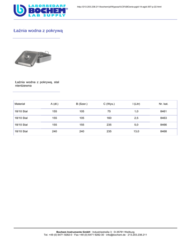 http://213.203.238.211/bochem/pl/Wyposa%C5%BCenie-pgid-14-agid-357-p-22.html Łaźnia�wodna�z�pokrywą Łaźnia� wodna� z� pokrywą,� stal nierdzewna Materiał A�(dł.) B�(Szer.) C�(Wys.) l�(Litr) Nr.�kat. 18/10�Stal 155 105 75 1,0 8461 18/10�Stal 155 105 160 2,5 8463 18/10�Stal 155 155 235 5,0 8466 18/10�Stal 240 240 235 13,0 8468 Bochem Instrumente GmbH · Industriestraße 3 · D-35781 Weilburg Tel. +49 (0) 6471 9282-0 · Fax +49 (0) 6471 9282-30 · [email protected] · 213.203.238.211
