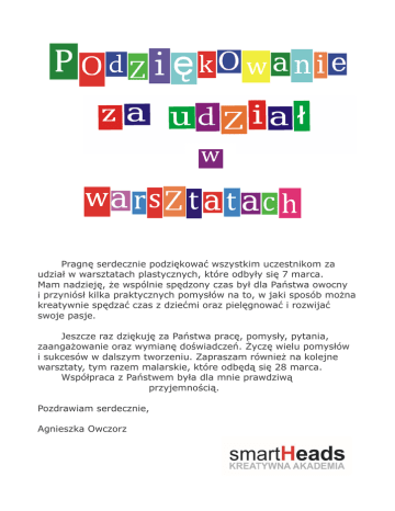 Pragnę serdecznie podziękować wszystkim uczestnikom za udział w warsztatach plastycznych, które odbyły się 7 marca. Mam nadzieję, że wspólnie spędzony czas był dla Państwa owocny i przyniósł kilka praktycznych pomysłów na to, w jaki sposób można kreatywnie spędzać czas z dziećmi oraz pielęgnować i rozwijać swoje pasje. Jeszcze raz dziękuję za Państwa pracę, pomysły, pytania, zaangażowanie oraz wymianę doświadczeń. Życzę wielu pomysłów i sukcesów w dalszym tworzeniu. Zapraszam również na kolejne warsztaty, tym razem malarskie, które odbędą się 28 marca. Współpraca z Państwem była dla mnie prawdziwą przyjemnością. Pozdrawiam serdecznie, Agnieszka Owczorz