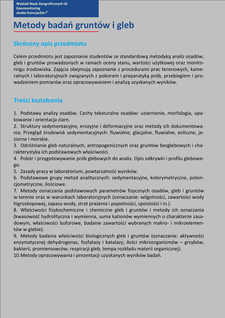 Wydział Nauk Geograficznych UŁ Geomonitoring o studia licencjackie I Metody badań gruntów i gleb Skrócony opis przedmiotu Celem przedmiotu jest zapoznanie studentów ze standardową metodyką analiz osadów, gleb i gruntów prowadzonych w ramach oceny stanu, wartości użytkowej oraz monitoringu środowiska. Zajęcia obejmują zapoznanie z procedurami prac terenowych, kameralnych i laboratoryjnych związanych z poborem i preparatyką prób, przebiegiem i prowadzeniem pomiarów oraz opracowywaniem i analizą uzyskanych wyników. Treści kształcenia 1. Podstawy analizy osadów. Cechy teksturalne osadów: uziarnienie, morfologia, upakowanie i orientacja ziarn. 2. Struktury sedymentacyjne, erozyjne i deformacyjne oraz metody ich dokumentowania. Przegląd środowisk sedymentacyjnych: fluwialne, glacjalne, fluwialne, eoliczne, jeziorne i morskie. 3. Odróżnianie gleb naturalnych, antropogenicznych oraz gruntów bezglebowych i charakterystyka ich podstawowych właściwości. 4. Pobór i przygotowywanie prób glebowych do analiz. Opis odkrywki i profilu glebowego. 5. Zasady pracy w laboratorium, powtarzalność wyników. 6. Podstawowe grupy metod analitycznych: sedymentacyjne, kolorymetryczne, potencjometryczne, ilościowe. 7. Metody oznaczania podstawowych parametrów fizycznych osadów, gleb i gruntów w terenie oraz w warunkach laboratoryjnych (oznaczanie: wilgotności, zawartości wody higroskopowej, zapasu wody, strat prażenia i popielności, spoistości i in.). 8. Właściwości fizykochemiczne i chemiczne gleb i gruntów i metody ich oznaczania (kwasowość hydrolityczna i wymienna, suma kationów wymiennych o charakterze zasadowym, właściwości buforowe, badanie zawartości wybranych makro- i mikroelementów w glebie). 9. Metody badania właściwości biologicznych gleb i gruntów (oznaczanie: aktywności enzymatycznej dehydrogenaz, fosfatazy i katalazy; ilości mikroorganizmów – grzybów, bakterii, promieniowców; respiracji gleb, tempa rozkładu materii organicznej). 10.Metody opracowywania i prezentacji uzyskanych wyników badań.