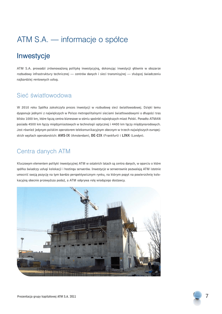 ATM S.A. — informacje o spółce Inwestycje ATM S.A. prowadzi zrównoważoną politykę inwestycyjną, dokonując inwestycji głównie w obszarze rozbudowy infrastruktury technicznej — centrów danych i sieci transmisyjnej — służącej świadczeniu najbardziej rentownych usług. Sieć światłowodowa W 2010 roku Spółka zakończyła proces inwestycji w rozbudowę sieci światłowodowej. Dzięki temu dysponuje jednymi z największych w Polsce metropolitalnymi sieciami światłowodowymi o długości tras blisko 1000 km, które łączą centra biznesowe w ośmiu spośród największych miast Polski. Ponadto ATMAN posiada 4500 km łączy międzymiastowych w technologii optycznej i 4400 km łączy międzynarodowych. Jest również jedynym polskim operatorem telekomunikacyjnym obecnym w trzech największych europejskich węzłach operatorskich: AMS-IX (Amsterdam), DE-CIX (Frankfurt) i LINX (Londyn). Centra danych ATM Kluczowym elementem polityki inwestycyjnej ATM w ostatnich latach są centra danych, w oparciu o które spółka świadczy usługi kolokacji i hostingu serwerów. Inwestycje w serwerownie pozwalają ATM istotnie umocnić swoją pozycję na tym bardzo perspektywicznym rynku, na którym popyt na powierzchnię kolokacyjną obecnie przewyższa podaż, a ATM odgrywa rolę wiodącego dostawcy. Prezentacja grupy kapitałowej ATM S.A. 2011 7 W IV kwartale 2010 roku rozpoczęta została budowa nowego budynku serwerowni F3 w kampusie ATMAN-Grochowska w ramach projektu Centrum Innowacji ATM, współfinansowanego przez Unię Europejską ze środków Europejskiego Funduszu Rozwoju Regionalnego w ramach Programu Operacyjnego Innowacyjna Gospodarka, 2007-2013. Mający ponad 2200 m2 powierzchni brutto obiekt pomieści jedne z najnowocześniejszych serwerowni w Polsce, sukcesywnie wyposażane dla nowych klientów. Obiekt F3 zostanie oddany do użytku już w III kwartale 2011 roku. W planach na 2011 rok jest także oddawanie do użytku klientów kolejnych modułów pozostałych dwóch centrów danych. Posiadanie przez ATM dwóch niezależnych centrów danych w Warszawie pozwala oferować klientom usługi zapewniające dodatkowe bezpieczeństwo związane z instalacją sprzętu teleinformatycznego w dwóch oddalonych od siebie lokalizacjach. Przeprowadzenie planowanych na 2011 rok inwestycji powiększy powierzchnię w serwerowniach ATM do 8300 m2 brutto, co stanowi wzrost o ponad 150% w stosunku do powierzchni aktualnie wykorzystywanej. Dzięki temu ATM stanie się liderem polskiego rynku usług kolokacji i hostingu, a także jednym z największych podmiotów tego rodzaju w regionie Europy Środkowo-Wschodniej. 8