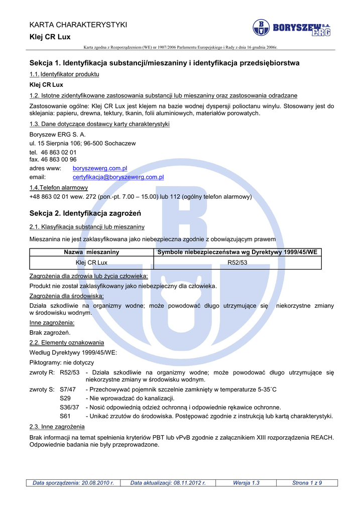 KARTA CHARAKTERYSTYKI Klej CR Lux Sekcja 1
