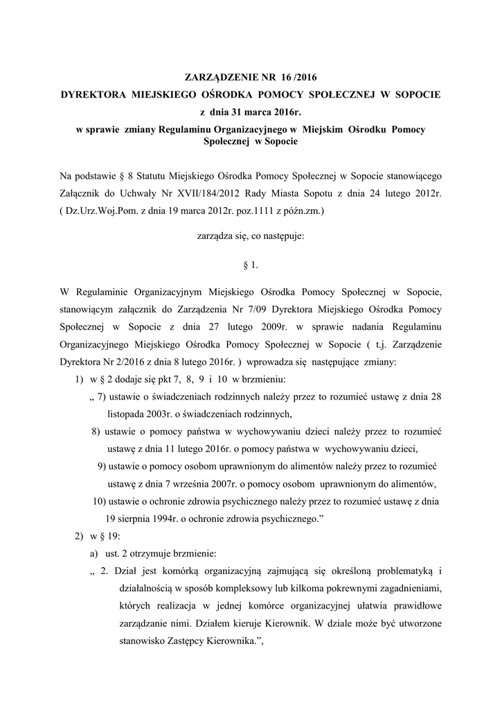 ZARZĄDZENIE NR 16 /2016 DYREKTORA MIEJSKIEGO OŚRODKA POMOCY SPOŁECZNEJ W SOPOCIE z dnia 31 marca 2016r. w sprawie zmiany Regulaminu Organizacyjnego w Miejskim Ośrodku Pomocy Społecznej w Sopocie Na podstawie § 8 Statutu Miejskiego Ośrodka Pomocy Społecznej w Sopocie stanowiącego Załącznik do Uchwały Nr XVII/184/2012 Rady Miasta Sopotu z dnia 24 lutego 2012r. ( Dz.Urz.Woj.Pom. z dnia 19 marca 2012r. poz.1111 z późn.zm.) zarządza się, co następuje: § 1. W Regulaminie Organizacyjnym Miejskiego Ośrodka Pomocy Społecznej w Sopocie, stanowiącym załącznik do Zarządzenia Nr 7/09 Dyrektora Miejskiego Ośrodka Pomocy Społecznej w Sopocie z dnia 27 lutego 2009r. w sprawie nadania Regulaminu Organizacyjnego Miejskiego Ośrodka Pomocy Społecznej w Sopocie ( t.j. Zarządzenie Dyrektora Nr 2/2016 z dnia 8 lutego 2016r. ) wprowadza się następujące zmiany: 1) w § 2 dodaje się pkt 7, 8, 9 i 10 w brzmieniu: „ 7) ustawie o świadczeniach rodzinnych należy przez to rozumieć ustawę z dnia 28 listopada 2003r. o świadczeniach rodzinnych, 8) ustawie o pomocy państwa w wychowywaniu dzieci należy przez to rozumieć ustawę z dnia 11 lutego 2016r. o pomocy państwa w wychowywaniu dzieci, 9) ustawie o pomocy osobom uprawnionym do alimentów należy przez to rozumieć ustawę z dnia 7 września 2007r. o pomocy osobom uprawnionym do alimentów, 10) ustawie o ochronie zdrowia psychicznego należy przez to rozumieć ustawę z dnia 19 sierpnia 1994r. o ochronie zdrowia psychicznego.” 2) w § 19: a) ust. 2 otrzymuje brzmienie: „ 2. Dział jest komórką organizacyjną zajmującą się określoną problematyką i działalnością w sposób kompleksowy lub kilkoma pokrewnymi zagadnieniami, których realizacja w jednej komórce organizacyjnej ułatwia prawidłowe zarządzanie nimi. Działem kieruje Kierownik. W dziale może być utworzone stanowisko Zastępcy Kierownika.”, b) ust.3 otrzymuje brzmienie: „3.Zespół jest komórką realizującą wyodrębnione zadania merytoryczne działającą w ramach Działu, którą tworzy się w wypadku konieczności organizacyjnego wyodrębnienia określonej problematyki nie wymagającej powołania większej komórki organizacyjnej. Zadaniami Zespołu kieruje Zastępca Kierownika Działu lub/oraz koordynuje, wyznaczony przez Dyrektora na wniosek Kierownika Działu, pracownik Zespołu. Zespół może też stanowić najmniejszą komórkę organizacyjną, realizującą wyodrębnione zadania merytoryczne, nie wchodzącą w skład działu, którą kieruje Kierownik.”; 3) w § 20 w pkt 7 lit a otrzymuje brzemiennie: „a) Zespół Świadczeń Rodzinnych i Wychowawczych DŚRiFA.ZŚRiW ” ; 4) w § 21 dodaje się ust.3 w brzmieniu: „ 3. Do Zastępcy Kierownika, w zakresie odpowiedzialności za realizację powierzonych zadań - kierowanie podległym Zespołem lub w przypadku nieobecności Kierownika Działu, stosuje się odpowiednio ust.2. ” ; 5) w § 22: a) akapit pierwszy oznacza się jako: „ ust. 1 ”, b) dodaje się ust.2 w brzmieniu: „ 2. Zadania określone w ust.1 stanowią zakres zadań Zastępcy Kierownika Działu w zakresie realizacji powierzonych zadań - kierowanie podległym Zespołem oraz kierowanie Działem w przypadku nieobecności Kierownika Działu.” 6) w § 33: a) ust. 1 otrzymuje brzmienie: „1. Dział realizuje zadania w zakresie ustawy o świadczeniach rodzinnych, o pomocy państwa w wychowywaniu dzieci oraz ustawy o pomocy osobom uprawnionym do alimentów. ” b) ust. 2 otrzymuje brzmienie: „ 2. Zespół Świadczeń Rodzinnych i Wychowawczych realizuje w szczególności zadania w zakresie: 1) prowadzenia postępowania w sprawach świadczeń rodzinnych i świadczenia wychowawczego administracyjnych, oraz wydawania w tych sprawach decyzji 2) prowadzenia postępowania wyjaśniającego w indywidualnych sprawach klientów, 3) prowadzenia bazy danych świadczeniobiorców rodzinnych i wychowawczych, 4) prowadzenia postępowania w sprawach nienależnie pobranych świadczeń rodzinnych i świadczenia wychowawczego, 5) koordynacji spraw objętych zabezpieczeniem społecznym na podstawie ustawy o świadczeniach rodzinnych oraz ustawy o pomocy państwa w wychowywaniu dzieci wychowawczych, 6) przygotowywania list wypłat dla świadczeniobiorców świadczeń rodzinnych i świadczenia wychowawczego, 7) przygotowywania dokumentów w zakresie postępowania egzekucyjnego, 8) opracowywania tytułów wykonawczych oraz przygotowywanie upomnień dla osób będących dłużnikami w zakresie zadań Zespołu przy współudziale komórek organizacyjnych Urzędu Miasta Sopotu, 9) realizacji rządowego programu dla rodzin wielodzietnych; 10) realizacji programu „Sopocka Karta Rodziny 3+ . ” c) w ust.3 pkt 7 otrzymuje brzmienie: „ 7) opracowywania tytułów wykonawczych oraz przygotowywanie upomnień dla osób będących dłużnikami w zakresie zadań Zespołu przy współudziale komórek organizacyjnych Urzędu Miasta Sopotu.” d) ust. 4 otrzymuje brzmienie: „ 4. W strukturze organizacyjnej Działu Świadczeń Rodzinnych i Funduszu Alimentacyjnego: 1) zadaniami Zespołu Świadczeń Rodzinnych i Wychowawczych kieruje Zastępca Kierownika przy pomocy pracownika koordynującego zadaniami z zakresu ustawy o świadczeniach rodzinnych. Pracownik koordynujący zadaniami z zakresu ustawy o świadczeniach rodzinnych podlega bezpośrednio Zastępcy Kierownika. Zastępca Kierownika podlega bezpośrednio Kierownikowi Działu, 2) zadaniami Zespołu Funduszu Alimentacyjnego koordynuje pracownik wyznaczony przez Dyrektora na wniosek Kierownika Działu. Pracownik koordynujący zadaniami Zespołu Funduszu Alimentacyjnego podlega bezpośrednio Kierownikowi Działu. ” e) ust. 5 otrzymuje brzmienie: „5. Działem kieruje Kierownik Działu Świadczeń Rodzinnych i Funduszu Alimentacyjnego oraz przy pomocy Zastępcy Kierownika, a w przypadku ich nieobecności wyznaczony pracownik. ” § 2. Zmianie ulega Schemat organizacyjny stanowiący Załącznik N