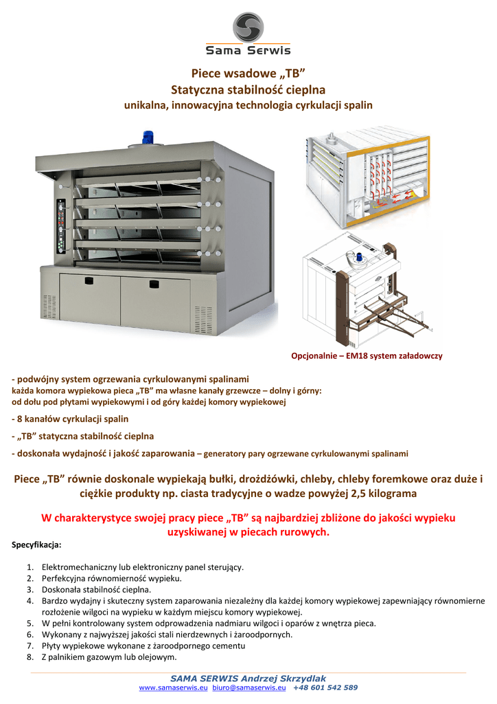 Piece wsadowe „TB” Statyczna stabilność cieplna unikalna, innowacyjna technologia cyrkulacji spalin Opcjonalnie – EM18 system załadowczy - podwójny system ogrzewania cyrkulowanymi spalinami każda komora wypiekowa pieca „TB” ma własne kanały grzewcze – dolny i górny: od dołu pod płytami wypiekowymi i od góry każdej komory wypiekowej - 8 kanałów cyrkulacji spalin - „TB” statyczna stabilność cieplna - doskonała wydajność i jakość zaparowania – generatory pary ogrzewane cyrkulowanymi spalinami Piece „TB” równie doskonale wypiekają bułki, drożdżówki, chleby, chleby foremkowe oraz duże i ciężkie produkty np. ciasta tradycyjne o wadze powyżej 2,5 kilograma W charakterystyce swojej pracy piece „TB” są najbardziej zbliżone do jakości wypieku uzyskiwanej w piecach rurowych. Specyfikacja: 1. 2. 3. 4. 5. 6. 7. 8. Elektromechaniczny lub elektroniczny panel sterujący. Perfekcyjna równomierność wypieku. Doskonała stabilność cieplna. Bardzo wydajny i skuteczny system zaparowania niezależny dla każdej komory wypiekowej zapewniający równomierne rozłożenie wilgoci na wypieku w każdym miejscu komory wypiekowej. W pełni kontrolowany system odprowadzenia nadmiaru wilgoci i oparów z wnętrza pieca. Wykonany z najwyższej jakości stali nierdzewnych i żaroodpornych. Płyty wypiekowe wykonane z żaroodpornego cementu Z palnikiem gazowym lub olejowym. ____________________________________________________________________________________________________________________________________________________________________ SAMA SERWIS Andrzej Skrzydlak www.samaserwis.eu [email protected] +48 601 542 589 Piece wsadowe „TB” Dane techniczne Moc elektryczna Moc cieplna Wymiar „B” (rys. powyżej) Waga Wymiar „D” (rys. powyżej) Wysokość komór (standard) Powierzchnia wypiekowa Wymiary komór wypiekowych kW kcal / kW cm kg cm cm m² cm TB16 4C/11m² TB20 4C/14m² TB25 4C/18m² 3 90.000kcal / 105kW 298 4.400 160 18 11,5 180 x 160 x 18h 3 95.000kcal / 110kW 348 4.800 200 18 14,4 180 x 200 x 18h 5 120.000kcal / 140kW 388 5.300 250 18 18,0 180 x 250 x 18h ____________________________________________________________________________________________________________________________________________________________________ SAMA SERWIS Andrzej Skrzydlak www.samaserwis.eu [email protected] +48 601 542 589