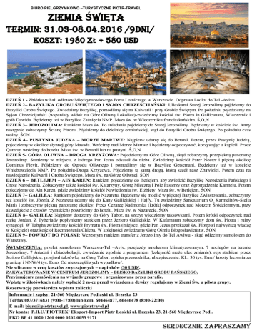 BIURO PIELGRZYMKOWO –TURYSTYCZNE PIOTR-TRAVEL ZIEMIA ŚWIĘTA TERMIN: 31.03-08.04.2016 /9dni/ KOSZT: 1980 ZŁ + 580 USD DZIEŃ 1 - Zbiórka w hali odlotów Międzynarodowego Portu Lotniczego w Warszawie. Odprawa i odlot do Tel -Avivu. DZIEŃ 2– BAZYLIKA GROBU ŚWIĘTEGO I SYJON CHRZEŚCIJAŃSKI: Uliczkami Starej Jerozolimy pójdziemy do Bazyliki Grobu Świętego. Zwiedzimy Bazylikę, pomodlimy się na Kalwarii i przy Grobie Świętym. Po południu pojedziemy na Syjon Chrześcijański (wspaniały widok na Górę Oliwną i okolice)-zwiedzimy kościół św. Piotra in Gallicanatu, Wieczernik i grób Dawida. Będziemy też w Bazylice Zaśnięcia NMP. Msza św. w Wieczerniku franciszkańskim. Ś,O,N DZIEŃ 3– JEROZOLIMA: Rankiem Msza św. Po śniadaniu pójdziemy do Starej Jerozolimy. Będziemy w kościele św. Anny następnie zobaczymy Ścianę Płaczu .Pójdziemy do dzielnicy ormiańskiej, stąd do Bazyliki Grobu Świętego. Po południu czas wolny. ŚON. DZIEŃ 4– PUSTYNIA JUDZKA – MORZE MARTWE: Najpierw udamy się do Betanii. Potem, przez Pustynię Judzką, pojedziemy w okolice słynnej góry Masada. Wrócimy nad Morze Martwe i będziemy odpoczywać, korzystając z kąpieli. Przez Qumran wrócimy do hotelu. Msza św. w Betanii lub na pustyni. Ś,O,N DZIEŃ 5- GÓRA OLIWNA – DROGA KRZYŻOWA: Pojedziemy na Górę Oliwną, skąd zobaczymy przepiękną panoramę Jerozolimy. Staniemy w miejscu, z którego Pan Jezus odszedł do nieba. Zwiedzimy kościół Pater Noster i piękną okolicę Dominus Flevit. Pójdziemy do Ogrodu Oliwnego i pomodlimy się w Bazylice Getsemani. Będziemy też w kościele Wniebowzięcia NMP. Po południu-Droga Krzyżowa. Pójdziemy tą samą drogą, którą szedł nasz Zbawiciel. Potem czas na nawiedzenie Kalwarii i Grobu Świętego. Msza św. na Górze Oliwnej. ŚON DZIEŃ 6 – BETLEJEM – AIN KAREN: Rankiem pojedziemy do Betlejem, aby zwiedzić Bazylikę Narodzenia Pańskiego i Grotę Narodzenia. Zobaczymy także kościół św. Katarzyny, Grotę Mleczną i Pole Pasterzy oraz Zgromadzenie Karmelu. Potem pojedziemy do Ain Karen, gdzie zwiedzimy kościół Nawiedzenia św. Elżbiety. Msza św. w Betlejem. ŚON DZIEŃ 7– GALILEA: Rankiem pojedziemy do Nazaretu. Będziemy się modlić w pięknej Bazylice Zwiastowania, zobaczymy też kościół św. Józefa. Z Nazaretu udamy się do Kany Galilejskiej i Hajfy. Tu zwiedzimy Sanktuarium O. Karmelitów-Stella Maris i zobaczymy piękną panoramę okolicy. Przez Cezareę Nadmorską (krótki odpoczynek nad Morzem Śródziemnym, przy akwedukcie z czasów rzymskich) powrócimy do hotelu. Msza św. w Nazarecie. ŚON DZIEŃ 8– GALILEA: Najpierw dotrzemy do Góry Tabor, na szczyt wjedziemy taksówkami. Potem krótki odpoczynek nad rzeką Jordan. Z Tyberiady popłyniemy statkiem przez Jezioro Galilejskie. W Kafarnaum zobaczymy dom św. Piotra i ruiny synagogi. W Tabgha zwiedzimy kościół Prymatu św. Piotra (miejsce, gdzie Pan Jezus przekazał św. Piotrowi najwyższą władzę w Kościele) oraz kościół Rozmnożenia Chleba. W kolejności zwiedzamy Górę Ośmiu Błogosławieństw. ŚON DZIEŃ 9– POWRÓT DO POLSKI: Wczesnym rankiem transfer z Jerozolimy do Tel Awiwu - skąd odlecimy samolotem do Warszawy. ŚWIADCZENIA: przelot samolotem Warszawa-Tel –Aviv, przejazdy autokarem klimatyzowanym, 7 noclegów na terenie Jerozolimy, 7 śniadań i obiadokolacji, zwiedzanie zgodnie z programem (kolejność może ulec zmianie), rejs statkiem przez Jezioro Galilejskie, przejazd taksówką na Górę Tabor, opieka przewodnika, ubezpieczenie: KL: 30 tys. Euro/ koszty leczenia za granicą/ i NNW/4 tys. Euro. Od nieszczęśliwych wypadków/. Nie wliczono w cenę kosztów zwyczajowych – napiwków /30 USD/. ZAKWATEROWANIE W CENTRUM JEROZOLIMY – BLISKO BAZYLIKI GROBU PAŃSKIEGO. Przyjmujemy zamówienia na wyjazdy grupowe i organizowane przez parafie. Wpłatę w Złotówkach należy wpłacić 2 m-ce przed wyjazdem a dewizy regulujemy w Ziemi Św. u pilota grupy. Rezerwację potwierdza wpłata zaliczki Informacje i zapisy: 21-560 Międzyrzec Podlaski ul. Brzeska 23 Tel/fax 083/3716831 (9:00-17:00) lub kom. 604464877, 60446478 (8:00-22:00) E mail: [email protected], www.piotrtravel.pl Nr konta: P.H.U.’PIOTREX’ Eksport-Import Piotr Łosicki ul. Brzeska 23, 21-560 Międzyrzec Podl. PKO BP 41 1020 1260 0000 0202 0053 9171 SERDECZNIE ZAPRASZAMY