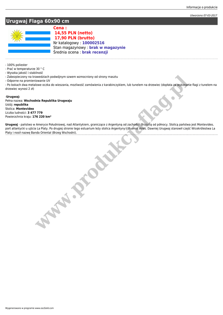 Informacje o produkcie Utworzono 07-03-2017 Urugwaj Flaga 60x90 cm Cena : 14,55 PLN (netto) 17,90 PLN (brutto) Nr katalogowy : 100002516 Stan magazynowy : brak w magazynie Średnia ocena : brak recenzji .p l - 100% poliester - Prać w temperaturze 30 ° C - Wysoka jakość i stabilność - Zabezpieczony na krawedziach podwójnym szwem wzmocniony od strony masztu - Odporne na promieniowanie UV - Po bokach dwa metalowe oczka do wieszania, mozliwość zamówienia z karabinczykiem, lub tunelem na drzewiec (dopłata za wykonanie flagi z tunelem na drzewiec wynosi 2 zł) af la g -Urugwaj: Pełna nazwa: Wschodnia Republika Urugwaju Ustój: republika Stolica: Montevideo Liczba ludności: 3 477 779 Powierzchnia kraju: 176 220 km² w w w .p ro du kc j Urugwaj - państwo w Ameryce Południowej, nad Atlantykiem, graniczące z Argentyną od zachodu i Brazylią od północy. Stolicą państwa jest Montevideo, port atlantycki u ujścia La Platy. Po drugiej stronie tego estuarium leży stolica Argentyny – Buenos Aires. Dawniej Urugwaj stanowił część Wicekrólestwa La Platy i nosił nazwę Banda Oriental (Brzeg Wschodni). Wygenerowano w programie www.oscGold.com