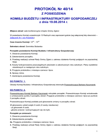 PROTOKÓŁ Nr 40/14 Z POSIEDZENIA KOMISJI BUDŻETU I INFRASTRUKTURY GOSPODARCZEJ z dnia 19.08.2014 r. Miejsce obrad: sala konferencyjna Urzędu Gminy Zgierz W posiedzeniu Komisji uczestniczyło 13 Radnych oraz zaproszeni goście (wg załączonej listy obecności – Załącznik Nr 1 do Protokółu). Czas trwania Komisji: 1200 - 1340 Sekretarz obrad: Dominika Stolarska Porządek posiedzenia Komisji Budżetu i Infrastruktury Gospodarczej: 1. Otwarcie posiedzenia Komisji. 2. Zatwierdzenie porządku. 3. Przebieg realizacji uchwał Rady Gminy Zgierz z zakresu działania Komisji podjętych na poprzedniej Sesji. 4. Koszty funkcjonowania poszczególnych placówek w zakończonym roku szkolnym. Plany wydatków oświatowych w następnym roku szkolnym. 5. Przyjęcie protokołów z miesiąca czerwca i lipca. 6. Sprawy różne. 7. Zamknięcie posiedzenia Komisji. DO PUNKTU 1. Obrady Komisji Budżetu i Infrastruktury Gospodarczej otworzyła Przewodnicząca Barbara Kaczmarek. DO PUNKTU 2. Przewodnicząca Komisji Barbara Kaczmarek odczytała porządek. Przewodnicząca Komisji wnioskowała o umieszczenie punktu 5 porządku obrad: Przyjęcie protokołów z miesiąca czerwca i lipca po punkcie 2 porządku obrad. Przewodnicząca Komisji poddała pod głosowanie zmiany w porządku obrad. W głosowaniu udział wzięło 9 osób (4 osoby nieobecne): - za głosowało 9 osób, - głosów przeciw i wstrzymujących się nie było. Porządek po zmianach: 1. Otwarcie posiedzenia Komisji. 2. Zatwierdzenie porządku. 2a. Przyjęcie protokołów z miesiąca czerwca i lipca. 3. Przebieg realizacji uchwał Rady Gminy Zgierz z zakresu działania Komisji podjętych na poprzedniej Sesji. 1 4. Koszty funkcjonowania poszczególnych placówek w zakończonym roku szkolnym. Plany wydatków oświatowych w następnym roku szkolnym. 5. Sprawy różne. 6. Zamknięcie posiedzenia Komisji. DO PUNKTU 2A. Przewodnicząca Komisji Barbara Kaczmarek poddała pod głosowanie protokół z posiedzenia Komisji z miesiąca czerwca. W głosowaniu udział wzięło 7 osób (3 osoby nie wzięły udziału w głosowaniu, 3 osoby nieobecne): - za głosowało 5 osób, - głosów przeciw nie było, - 2 osoby wstrzymały się od głosu. Kolejno Przewodnicząca Komisji poddała pod głosowanie protokół z posiedzenia Komisji z miesiąca lipca: W głosowaniu udział wzięło 8 osób (2 osoby nie wzięły udziału w głosowaniu, 3 osoby nieobecne): - za głosowało 5 osób, - głosów przeciw nie było, - 3 osoby wstrzymały się od głosu. DO PUNKTU 3. Przebieg realizacji uchwał Rady Gminy Zgierz z zakresu działania Komisji podjętych na poprzedniej Sesji (Załącznik nr 2 do Protokółu). DO PUNKTU 4. Koszty funkcjonowania poszczególnych placówek w zakończonym roku szkolnym. Plany wydatków oświatowych w następnym roku szkolnym (Załącznik Nr 3 do Protokółu). Kierownik Referatu Edukacji i Spraw Społecznych Cezary Piotrowski powiedział, że bieżące wydatki na oświatę w Gminie Zgierz w 2014 roku wyniosły około 13 100 000,- zł, z tego 9 500 000,- zł to subwencja oświatowa, środki gminne to kwota 3 600 000,- zł. 72,5% to subwencja oświatowa, a 27,5% to środki gminne na wszystkie zadania oświatowe. Dodał, że wychowanie przedszkolne to również zadanie gminne. Mówił, że wydatki związane z wychowaniem przedszkolnym dają kwotę 1 300 000,- zł. Wynika z tego, że w sumie środki gminne na szkoły to kwota 2 300 000,- zł. Powiedział, że 80% wydatków szkół pokrywa subwencja oświatowa, 20% stanowią środki gminne. Nadmienił, że proporcje te od lat są podobne. Powiedział, że subwencja nie pokrywa w 100% kosztów prowadzenia szkół. Zauważył, że większość samorządów dokłada do zadań oświatowych. Mówił, że przy tworzeniu budżetu na 2014 rok brano pod uwagę następujące rzeczy: wykonanie za 2013 rok, nagrody jubileuszowe, trzynastki, urlopy na poratowanie zdrowia. Poinformował, że zmianie uległy przepisy dotyczące liczebności oddziałów klas pierwszych. Od 2014 roku oddział nie może liczyć więcej niż 25 uczniów, w przypadku kiedy uczniów jest więcej, należy dokonać podziału. Nadmienił, że do klas pierwszych ma zostać przyjętych w Szczawinie 44 dzieci, w Słowiku 42. Wynika z tego, że powstaną dwa dodatkowe oddziały. Mówił o zabezpieczeniu środków na wynagrodzenia dla nauczycieli. Dodał, że budżety szkół to uwzględniły i nie potrzeba dodatkowych środków. Powiedział, że wydatki statutowe, inaczej środki rzeczowe, zostały zwiększone o 2,4%. Mówił, że uwzględniono również to, że od stycznia zwiększyła się płaca minimalna, z kwoty 1 600,- zł do kwoty 1 680,- zł. Przypomniał, że od tego nalicza się również dodatek mieszkaniowy dla nauczycieli, co należało również skalkulować. Dodał, że zaplanowane awanse zawodowe nauczycieli, wprowadzono również do budżetu na 2014 rok. Powiedział, że budżet całej oświaty po zmianach (dotyczy tylko szkół) wynosi 12 989 785,- zł. Na dzień 30 czerwca br. został 2 wykonany w 51,36%. Poszczególne szkoły wykonały budżet następująco: SP Dąbrówka Wielka 48,82%, SP Besiekierz Rudny 46,94%, SP Biała 50,34%, ZSG Słowik 50,68%, ZSG Grotniki 54,11%, ZSG Gieczno 50,66%, ZSG Szczawin 53,47%. Ogółem wynagrodzenia i pochodne zostały wykonane w 50,62%, a wydatki rzeczowe 54,17%. Dodał, że w wydatkach płacowych znalazła się trzynastka, była to kwota 590 626,- zł. W drugim półroczu nie będzie już takiego wydatku. Mówił, że wydatki rzeczowe to 54,17%, w tym zakładowy fundusz świadczeń socjalnych. Jest to świadczenie pieniężne, ale kwalifikowane do wydatków rzeczowych. Powiedział, że odpisano 75% do końca maja, co dało kwotę 345 810,- zł. Zauważył, że w drugim półroczu wydatki związane z eksploatacją budynków będą mniejsze. Mówił, że w drugiej połowie sierpnia uzyskano informacje o nowych urlopach dla poratowania zdrowia. Przypomniał, że Karta Nauczyciela nie została