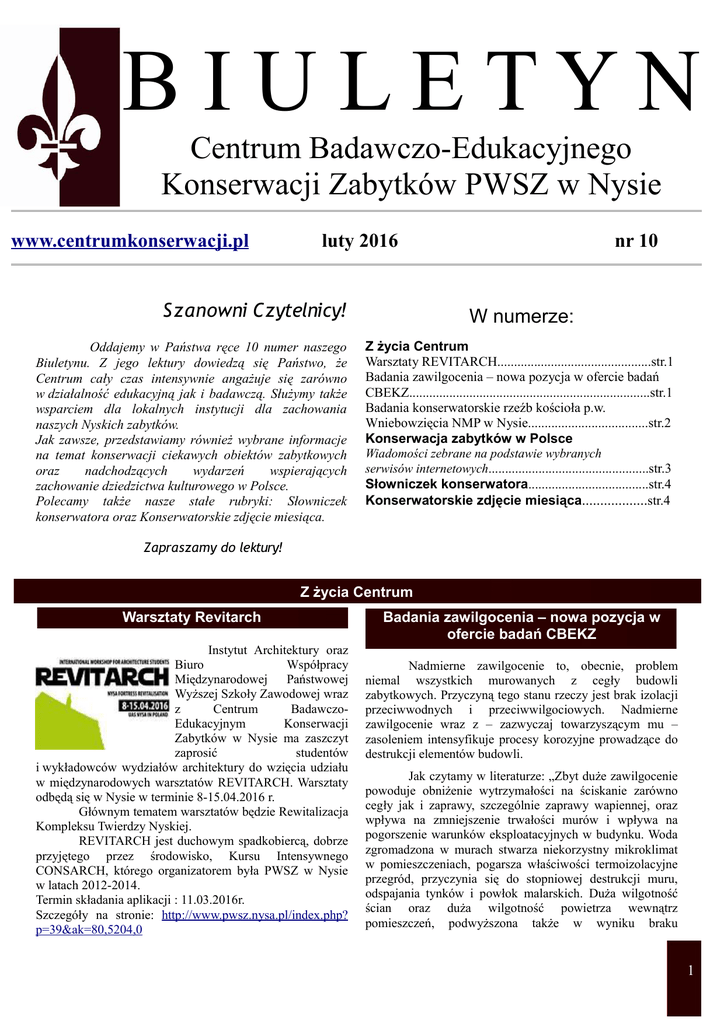 BIULETYN Centrum Badawczo-Edukacyjnego Konserwacji Zabytków PWSZ w Nysie www.centrumkonserwacji.pl luty 2016 S zanowni Czytelnicy! Oddajemy w Państwa ręce 10 numer naszego Biuletynu. Z jego lektury dowiedzą się Państwo, że Centrum cały czas intensywnie angażuje się zarówno w działalność edukacyjną jak i badawczą. Służymy także wsparciem dla lokalnych instytucji dla zachowania naszych Nyskich zabytków. Jak zawsze, przedstawiamy również wybrane informacje na temat konserwacji ciekawych obiektów zabytkowych oraz nadchodzących wydarzeń wspierających zachowanie dziedzictwa kulturowego w Polsce. Polecamy także nasze stałe rubryki: Słowniczek konserwatora oraz Konserwatorskie zdjęcie miesiąca. nr 10 W numerze: Z życia Centrum Warsztaty REVITARCH..............................................str.1 Badania zawilgocenia – nowa pozycja w ofercie badań CBEKZ........................................................................str.1 Badania konserwatorskie rzeźb kościoła p.w. Wniebowzięcia NMP w Nysie....................................str.2 Konserwacja zabytków w Polsce Wiadomości zebrane na podstawie wybranych serwisów internetowych................................................str.3 Słowniczek konserwatora....................................str.4 Konserwatorskie zdjęcie miesiąca..................str.4 Zapraszamy do lektury! Z życia Centrum Warsztaty Revitarch Instytut Architektury oraz Biuro Współpracy Międzynarodowej Państwowej Wyższej Szkoły Zawodowej wraz z Centrum BadawczoEdukacyjnym Konserwacji Zabytków w Nysie ma zaszczyt zaprosić studentów i wykładowców wydziałów architektury do wzięcia udziału w międzynarodowych warsztatów REVITARCH. Warsztaty odbędą się w Nysie w terminie 8-15.04.2016 r. Głównym tematem warsztatów będzie Rewitalizacja Kompleksu Twierdzy Nyskiej. REVITARCH jest duchowym spadkobiercą, dobrze przyjętego przez środowisko, Kursu Intensywnego CONSARCH, którego organizatorem była PWSZ w Nysie w latach 2012-2014. Termin składania aplikacji : 11.03.2016r. Szczegóły na stronie: http://www.pwsz.nysa.pl/index.php? p=39&ak=80,5204,0 Badania zawilgocenia – nowa pozycja w ofercie badań CBEKZ Nadmierne zawilgocenie to, obecnie, problem niemal wszystkich murowanych z cegły budowli zabytkowych. Przyczyną tego stanu rzeczy jest brak izolacji przeciwwodnych i przeciwwilgociowych. Nadmierne zawilgocenie wraz z – zazwyczaj towarzyszącym mu – zasoleniem intensyfikuje procesy korozyjne prowadzące do destrukcji elementów budowli. Jak czytamy w literaturze: „Zbyt duże zawilgocenie powoduje obniżenie wytrzymałości na ściskanie zarówno cegły jak i zaprawy, szczególnie zaprawy wapiennej, oraz wpływa na zmniejszenie trwałości murów i wpływa na pogorszenie warunków eksploatacyjnych w budynku. Woda zgromadzona w murach stwarza niekorzystny mikroklimat w pomieszczeniach, pogarsza właściwości termoizolacyjne przegród, przyczynia się do stopniowej destrukcji muru, odspajania tynków i powłok malarskich. Duża wilgotność ścian oraz duża wilgotność powietrza wewnątrz pomieszczeń, podwyższona także w wyniku braku 1 odpowiedniej wentylacji, sprzyja rozwojowi grzybów domowych i pleśniowych, mających negatywny wpływ na zdrowie użytkowników budynków.” 1 Aby wyjść na przeciw rosnącemu zapotrzebowaniu na tego typu badania, zostały zakupione dwa instrumenty: Wilgotnościomierz do materiałów inwazyjny Extech MO100 oraz Pirometr na podczerwień z pomiarem temperatury punktu rosy IR-SCAN-350RH. Przy pomocy pierwszego z tych urządzeń wykonywane są badania typu inwazyjnego, gdyż do dokonania pomiaru konieczne jest wkłucie dwóch końcówek pomiarowych w badany materiał. Pirometr służy, zaś, do badań nieinwazyjnych opartych na pomiarze odbitego od badanej powierzchni promieniowania podczerwonego. Rzeźby są dziełem anonimowym, datowane na przełom XVII/XVIII w. Brak jest informacji na temat ich autorstwa. Można jedynie przypuszczać, za Tadeuszem Chrzanowskim2, że autor lub autorzy wymienionych posągów pochodzą z kręgu rzeźbiarza Krzysztofa Konigera. Do badań zostały ze wszystkich rzeźb pobrane liczne próbki drewna, blach i gwoździ, warstw malarskich oraz zapraw. Ściana zachodnia rozkład zawilgocenia 200 cm 150 cm 100 cm %H2O 2-3 80 cm 1-2 0-1 40 cm Św. Ignacy Loyola Św. Franciszek Ksawery 0 cm 1 2 3 4 5 6 7 8 9 10 11 12 13 14 15 16 miejsce pobrania Przykładowa mapa rozkładu zawilgocenia Wynikiem powyższych badań może być m.in. mapa rozkładu zawilgocenia obrazująca, w którym obszarze istnieje największa kumulacja wilgoci i dzięki temu określić jej źródło, co stanowi podstawę do wydania decyzji o zakresie prac zapobiegawczych. Badania konserwatorskie rzeźb kościoła p.w. Wniebowzięcia NMP w Nysie W lipcu 2015r. zostały przeprowadzone badania konserwatorskie czterech monumentalnych rzeźb z nisz fasady głównej kościoła p.w. Wniebowzięcia NMP w Nysie. Celem tych badań była ocena stanu zachowania, analiza przyczyn zniszczeń, określenie techniki i technologii wykonania rzeźb oraz sformułowanie programu prac konserwatorskich na potrzeby planowanej ich konserwacji i restauracji. Kościół ufundowany przez Karola Ferdynanda Wazę, konsekrowany w 1692roku, jest orientowany, posiada dwuwieżową fasadę główną, skierowaną w stronę Rynku Solnego. Na osiach wież, na dwóch kondygnacjach, posadowiono w ozdobnych wnękach monumentalne drewniane posągi przedstawiające czterech świętych kościoła katolickiego. Dolne, mierzące ponad trzy metry, figury przedstawiają słynnych franciszkanów: Św. Karola Boromeusza po lewej oraz św. Ferdynanda Kastylijskiego po prawej stronie. Górna kondygnacja mieści zaś dwumetrowe rzeźby założycieli Jezuitów: św. Ignacego Loyolę po lewej oraz św. Franciszka Ksawerego po prawej. Górne rzeźby są, w przeciwieństwie do dolnych, obite blachą miedzianą. 1 Jasieńko J., Matkowski Z., Za