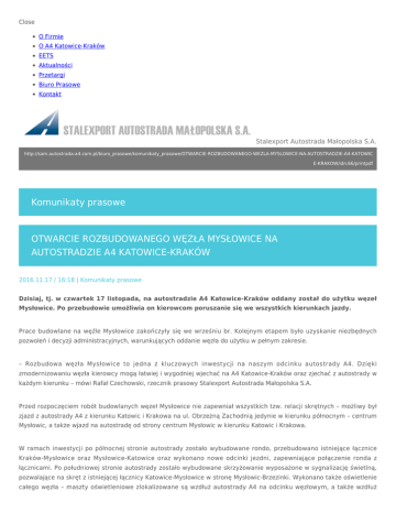 Close O Firmie O A4 Katowice-Kraków EETS Aktualności Przetargi Biuro Prasowe Kontakt Stalexport Autostrada Małopolska S.A. http://sam.autostrada-a4.com.pl/biuro_prasowe/komunikaty_prasowe/OTWARCIE-ROZBUDOWANEGO-WEZLA-MYSLOWICE-NA-AUTOSTRADZIE-A4-KATOWIC E-KRAKOW/idn:66/printpdf Komunikaty prasowe OTWARCIE ROZBUDOWANEGO WĘZŁA MYSŁOWICE NA AUTOSTRADZIE A4 KATOWICE-KRAKÓW 2016.11.17 / 16:18 | Komunikaty prasowe Dzisiaj, tj. w czwartek 17 listopada, na autostradzie A4 Katowice-Kraków oddany został do użytku węzeł Mysłowice. Po przebudowie umożliwia on kierowcom poruszanie się we wszystkich kierunkach jazdy. Prace budowlane na węźle Mysłowice zakończyły się we wrześniu br. Kolejnym etapem było uzyskanie niezbędnych pozwoleń i decyzji administracyjnych, warunkujących oddanie węzła do użytku w pełnym zakresie. – Rozbudowa węzła Mysłowice to jedna z kluczowych inwestycji na naszym odcinku autostrady A4. Dzięki zmodernizowaniu węzła kierowcy mogą łatwiej i wygodniej wjechać na A4 Katowice-Kraków oraz zjechać z autostrady w każdym kierunku – mówi Rafał Czechowski, rzecznik prasowy Stalexport Autostrada Małopolska S.A. Przed rozpoczęciem robót budowlanych węzeł Mysłowice nie zapewniał wszystkich tzw. relacji skrętnych – możliwy był zjazd z autostrady A4 z kierunku Katowic i Krakowa na ul. Obrzeżną Zachodnią jedynie w kierunku północnym – centrum Mysłowic, a także wjazd na autostradę od strony centrum Mysłowic w kierunku Katowic i Krakowa. W ramach inwestycji po północnej stronie autostrady zostało wybudowane rondo, przebudowano istniejące łącznice Kraków-Mysłowice oraz Mysłowice-Katowice oraz wykonano nowe odcinki jezdni, zapewniające połączenie ronda z łącznicami. Po południowej stronie autostrady zostało wybudowane skrzyżowanie wyposażone w sygnalizację świetlną, pozwalające na skręt z istniejącej łącznicy Katowice-Mysłowice w stronę Mysłowic-Brzezinki. Wykonano także oświetlenie całego węzła – maszty oświetleniowe zlokalizowane są wzdłuż autostrady A4 na odcinku węzłowym, a także wzdłuż łącznic węzła oraz na ul. Obrzeżnej Zachodniej. Stalexport Autostrada Małopolska S.A. przystąpił do rozbudowy Węzła Mysłowice w 2015 roku. Wartość inwestycji to 14,4 mln zł netto.