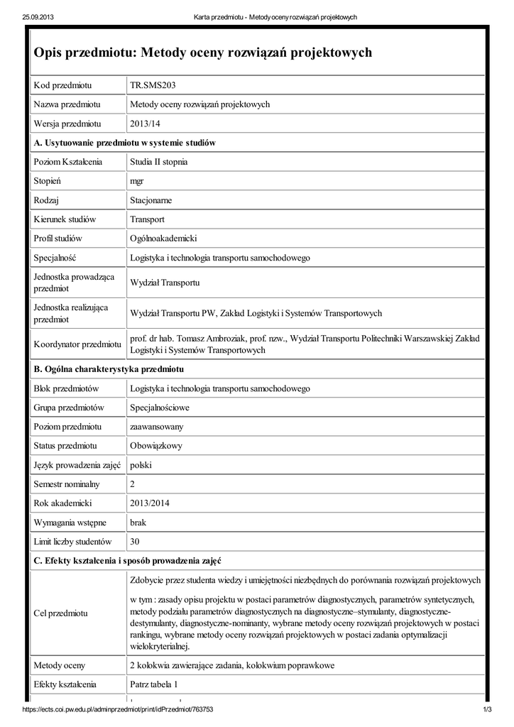 25.09.2013 Karta przedmiotu - Metody oceny rozwiązań projektowych Opis przedmiotu: Metody oceny rozwiązań projektowych Kod przedmiotu TR.SMS203 Nazwa przedmiotu Metody oceny rozwiązań projektowych Wersja przedmiotu 2013/14 A. Usytuowanie przedmiotu w systemie studiów Poziom Kształcenia Studia II stopnia Stopień mgr Rodzaj Stacjonarne Kierunek studiów Transport Profil studiów Ogólnoakademicki Specjalność Logistyka i technologia transportu samochodowego Jednostka prowadząca przedmiot Wydział Transportu Jednostka realizująca przedmiot Wydział Transportu PW, Zakład Logistyki i Systemów Transportowych Koordynator przedmiotu prof. dr hab. Tomasz Ambroziak, prof. nzw., Wydział Transportu Politechniki Warszawskiej Zakład Logistyki i Systemów Transportowych B. Ogólna charakterystyka przedmiotu Blok przedmiotów Logistyka i technologia transportu samochodowego Grupa przedmiotów Specjalnościowe Poziom przedmiotu zaawansowany Status przedmiotu Obowiązkowy Język prowadzenia zajęć polski Semestr nominalny 2 Rok akademicki 2013/2014 Wymagania wstępne brak Limit liczby studentów 30 C. Efekty kształcenia i sposób prowadzenia zajęć Zdobycie przez studenta wiedzy i umiejętności niezbędnych do porównania rozwiązań projektowych Cel przedmiotu w tym : zasady opisu projektu w postaci parametrów diagnostycznych, parametrów syntetycznych, metody podziału parametrów diagnostycznych na diagnostyczne–stymulanty, diagnostycznedestymulanty, diagnostyczne-nominanty, wybrane metody oceny rozwiązań projektowych w postaci rankingu, wybrane metody oceny rozwiązań projektowych w postaci zadania optymalizacji wielokryterialnej. Metody oceny 2 kolokwia zawierające zadania, kolokwium poprawkowe Efekty kształcenia Patrz tabela 1 https://ects.coi.pw.edu.pl/adminprzedmiot/print/idPrzedmiot/763753 1/3 25.09.2013 Karta przedmiotu - Metody oceny rozwiązań projektowych 0 Ćwiczenia 1 Forma zajęć dydaktycznych i ich wymiar tygodniowy Wykład Laboratoria 0 Projekty 0 Treści kształcenia Treść ćwiczeń audytoryjnych: Metody opisu projektu w postaci parametrów diagnostycznych, parametrów syntetycznych. Metody rozpoznania i ujednolicenia charakteru parametrów. Wybrane metody normowania zmiennych diagnostycznych. Wybrane metody transformacji parametrów do postaci znormalizowanej. Wybrane metody budowy rankingu projektów uwzględniającego oceny wielokryterialne. Metoda wielokryterialnej oceny rozwiązań projektowych opartych na formule przewyższania. Metody sprawdzenia efektów kształcenia Patrz tabela 1 Egzamin nie Literatura Literatura podstawowa: 1. Chudy M.: Wybrane metody optymalizacji. Dom Wydawniczy Bellona, Warszawa 2001 2. Jacyna M. : Modelowanie i ocena systemów transportowych, Oficyna Wydawnicza Politechniki Warszawskiej, Warszawa 2009. 3. Kukuła K. : Badania operacyjne w przykładach i zadaniach. PWN Warszawa, 2001 4. Ignasiak E.: Badania operacyjne PWE, Warszawa,2001 Literatura uzupełniająca: 1. Siudak M.: Badania operacyjne, Oficyna Wydawnicza Politechniki Warszawskiej, Warszawa 1989. Witryna www przedmiotu www.wt.pw.edu.pl D. Nakład pracy studenta Liczba punktów ECTS 1 Liczba godzin pracy studenta związanych z osiągnięciem efektów kształcenia(opis): Ćwiczenia 15 h Zapoznanie się ze wskazaną literaturą 4 h Konsultacje 3 h Przygotowanie do kolokwiów 8 h Razem 30 godz. = 1 ECTS Liczba punktów ECTS na zajęciach wymagających bezpośredniego udziału Ćwiczenia 15 h Konsultacje 3 h Razem 18 godz. = 1 ECTS nauczycieli akademickich: Liczba punktów ECTS, którą student uzyskuje w 0 ramach zajęć o charakterze praktycznym E. Informacje dodatkowe Uwagi Data ostatniej aktualizacji 2013-09-25 14:46:50 Tabela 1: Profil Ogólnoakademicki Efekty przedmiotowe https://ects.coi.pw.edu.pl/adminprzedmiot/print/idPrzedmiot/763753 Efekty kierunkowe Efekty obszarowe 2/3 25.09.2013 Karta przedmiotu - Metody oceny rozwiązań projektowych Wiedza Efekt: Posiada wiedzę teoretyczną z zakresu teorii opisu projektu w postaci parametrów diagnostycznych w odniesieniu do sfery transportowej Kod efektu: W01 Tr2A_W02 T2A_W01 Weryfikacja: Ćwiczenia: kolokwium zawierające zadania rachunkowe Efekt: Posiada wiedzę teoretyczną z zakresu podziału parametrów diagnostycznych w odniesieniu do sfery transportowej Tr2A_W06 T2A_W04 Kod efektu: W02 Tr2A_W02 T2A_W01 Tr2A_W07 T2A_W05 Weryfikacja: Ćwiczenia: kolokwium zawierające zadania rachunkowe Efekt: Posiada wiedzę teoretyczną z zakresu metod konstrukcji rankingu Kod efektu: W03 Weryfikacja: Ćwiczenia: kolokwium zawierające zadania rachunkowe Efekt: Posiada wiedzę teoretyczną z zakresu optymalizacji wielokryterialnej w odniesieniu do zagadnień transportowych Tr2A_W09 Kod efektu: W04 Tr2A_W08 T2A_W07 Weryfikacja: Ćwiczenia: kolokwium zawierające zadania rachunkowe Umiejętności Efekt: Potrafi opisać projekt z wykorzystaniem parametrów diagnostycznych Kod efektu: U01 Tr2A_U01 T2A_U01 Efekt: Potrafi wykonać ranking w odniesieniu do obiektów transportowych, potrafi podejmować decyzje oceny projektów z wykorzystaniem optymalizacji wielokryterialnej Tr2A_U18 T2A_U18 Tr2A_U11 T2A_U11 Kod efektu: U02 Tr2A_U10 T2A_U10 Tr2A_U07 T2A_U09 Weryfikacja: Ćwiczenia: kolokwium zawierające zadania rachunkowe Weryfikacja: Ćwiczenia: kolokwium zawierające zadania rachunkowe Kompetencje Społeczne Profil Praktyczny Wiedza Umiejętności Kompetencje Społeczne https://ects.coi.pw.edu.pl/adminprzedmiot/print/idPrzedmiot/763753 3/3
