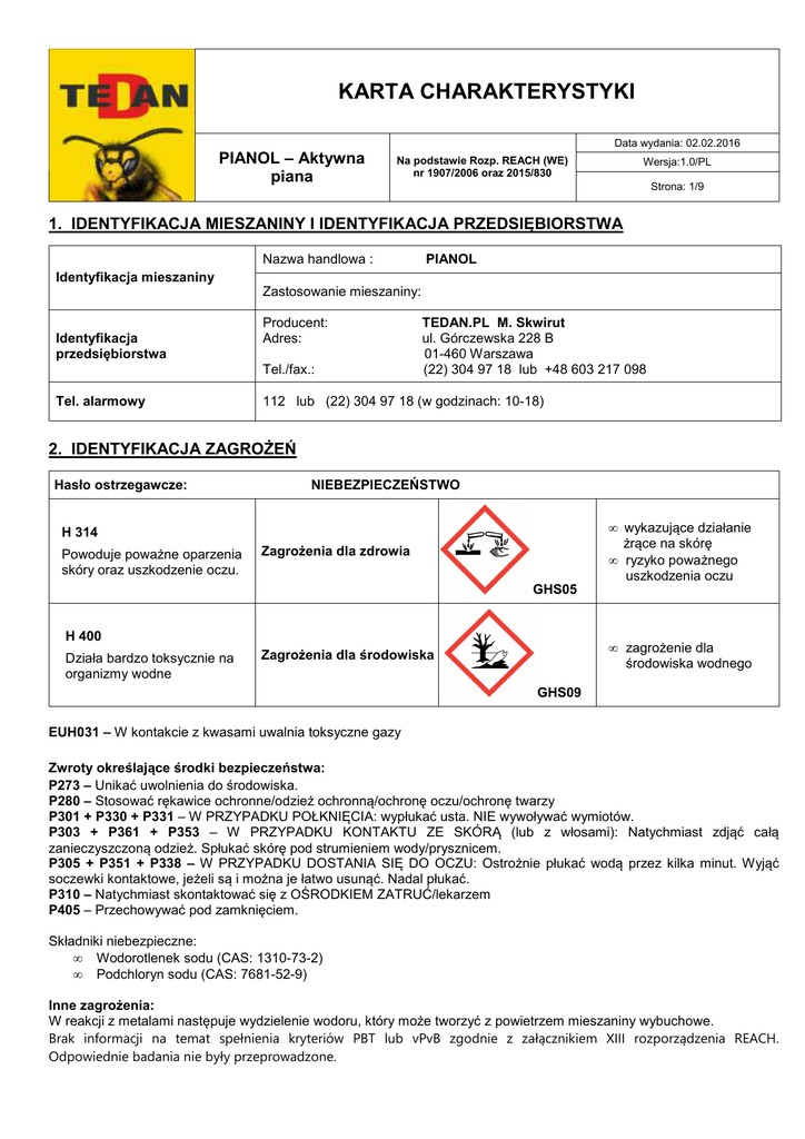 KARTA CHARAKTERYSTYKI Data wydania: 02.02.2016 PIANOL – Aktywna piana Na podstawie Rozp. REACH (WE) nr 1907/2006 oraz 2015/830 Wersja:1.0/PL Strona: 1/9 1. IDENTYFIKACJA MIESZANINY I IDENTYFIKACJA PRZEDSIĘBIORSTWA Nazwa handlowa : PIANOL Identyfikacja mieszaniny Zastosowanie mieszaniny: Identyfikacja przedsiębiorstwa Producent: Adres: Tel./fax.: Tel. alarmowy TEDAN.PL M. Skwirut ul. Górczewska 228 B 01-460 Warszawa (22) 304 97 18 lub +48 603 217 098 112 lub (22) 304 97 18 (w godzinach: 10-18) 2. IDENTYFIKACJA ZAGROŻEŃ Hasło ostrzegawcze: NIEBEZPIECZEŃSTWO • wykazujące działanie żrące na skórę • ryzyko poważnego uszkodzenia oczu H 314 Powoduje poważne oparzenia skóry oraz uszkodzenie oczu. Zagrożenia dla zdrowia GHS05 H 400 Działa bardzo toksycznie na organizmy wodne • zagrożenie dla środowiska wodnego Zagrożenia dla środowiska GHS09 EUH031 – W kontakcie z kwasami uwalnia toksyczne gazy Zwroty określające środki bezpieczeństwa: P273 – Unikać uwolnienia do środowiska. P280 – Stosować rękawice ochronne/odzież ochronną/ochronę oczu/ochronę twarzy P301 + P330 + P331 – W PRZYPADKU POŁKNIĘCIA: wypłukać usta. NIE wywoływać wymiotów. P303 + P361 + P353 – W PRZYPADKU KONTAKTU ZE SKÓRĄ (lub z włosami): Natychmiast zdjąć całą zanieczyszczoną odzież. Spłukać skórę pod strumieniem wody/prysznicem. P305 + P351 + P338 – W PRZYPADKU DOSTANIA SIĘ DO OCZU: Ostrożnie płukać wodą przez kilka minut. Wyjąć soczewki kontaktowe, jeżeli są i można je łatwo usunąć. Nadal płukać. P310 – Natychmiast skontaktować się z OŚRODKIEM ZATRUĆ/lekarzem P405 – Przechowywać pod zamknięciem. Składniki niebezpieczne: • Wodorotlenek sodu (CAS: 1310-73-2) • Podchloryn sodu (CAS: 7681-52-9) Inne zagrożenia: W reakcji z metalami następuje wydzielenie wodoru, który może tworzyć z powietrzem mieszaniny wybuchowe. Brak informacji na temat spełnienia kryteriów PBT lub vPvB zgodnie z załącznikiem XIII rozporządzenia REACH. Odpowiednie badania nie były przeprowadzone. KARTA CHARAKTERYSTYKI PIANOL – Aktywna piana Data wydania: 02.02.2016 Na podstawie Rozp. REACH (WE) nr 1907/2006 oraz 2015/830 Wersja:1.0/PL Strona: 2/9 3. SKŁAD I INFORMACJA O SKŁADNIKACH Klasyfikacja CLP Nazwa niebezpiecznego składnika Podchloryn sodu Nr indeksowy: 017-011-00-1 Nr REACH: substancja podlega przepisom okresu przejściowego Wodorotlenek sodu Nr indeksowy: 011-002-00-6 Nr REACH: substancja podlega przepisom okresu przejściowego % Numer CAS Numer WE 30-35 7681-52-9 231-668-3 Skin Corr. 1B Aquatic Acute 1 12-15 1310-73-2 215-185-5 Skin Corr. 1A Klasa zagrożenia i kody kategorii Zwroty zagrożenia* H 314; H 400 H 314 *Pełne znaczenie zwrotów zagrożenia ujęto w punkcie 16 Uwaga: Zwroty zagrożenia H/EUH odnoszą się do substancji 100 % a nie do jej stężenia w preparacie. 4. PIERWSZA POMOC Uwagi ogólne • • Należy bezwzględnie przestrzegać uwag dotyczących bezpieczeństwa i użytkowania zamieszczonych na etykiecie. Przy wystąpieniu niepokojących objawów lub w wypadkach wątpliwych zasięgnąć rady lekarza. W razie kontaktu ze skórą • Zdjąć zanieczyszczone ubranie. Zanieczyszczoną powierzchnię ciała przemyć obficie bieżącą wodą, a następnie zastosować krem ochronny. • Istnieje prawdopodobieństwo wystąpienia podrażnienia skóry. Wówczas należy zapewnić konsultację dermatologa. W razie kontaktu z oczami • Przemywać zanieczyszczone oczy (przy wywiniętych powiekach) przez co najmniej 10 minut, większą ilością bieżącej wody. Wyjąć szkła kontaktowe. • Jeżeli podrażnienie nie przeminie, przykryć oczy gaza i niezwłocznie skonsultować się z lekarzem okulistą. W razie spożycia • • Przepłukać usta wodą, a następnie podać poszkodowanemu do wypicia duże ilości wody. Nie prowokować wymiotów. Zasięgnąć porady lekarza, pokazać opakowanie lub etykietę. W razie narażenia dróg oddechowych • W przypadku narażenia wyprowadzić poszkodowanego na świeże powietrze. Zapewnić ciepło i spokój, ograniczyć wysiłek fizyczny. • Wezwać lekarza, podać informacje z karty charakterystyki. Najważniejsze ostre i opóźnione objawy oraz skutki narażenia: Układ oddechowy. Przy wdychaniu dużych bezpośrednich stężeń mogą pojawić się podrażnienia błon śluzowych układu oddechowego, kaszel, bóle głowy. Podrażnienie gardła, problemy z właściwym oddychaniem. Przewód pokarmowy. Spożycie wywołuje poparzenia chemiczne jamy ustnej, gardła i dalszych odcinków przewodu pokarmowego, może prowadzić do martwicy przewodu pokarmowego, perforacji przełyku lub żołądka, po absorpcji może wywołać bóle brzucha, zawroty głowy. Zatrucie ostre może prowadzić do niewydolności wątroby i nerek. Kontakt z oczami. Może powodować poparzenia chemiczne śluzówki, zaczerwienienie i oparzenie rogówki wraz z trwałym, nieodwracalnym uszkodzeniem. Kontakt ze skórą. Powoduje poparzenia chemiczne skóry – pojawia się zaczerwienieni, obrzęk, rumienie, bąble, rany pooparzeniowe. KARTA CHARAKTERYSTYKI PIANOL – Aktywna piana Data wydania: 02.02.2016 Na podstawie Rozp. REACH (WE) nr 1907/2006 oraz 2015/830 Wersja:1.0/PL Strona: 3/9 5. POSTĘPOWANIE W PRZYPADKU POŻARU Właściwe środki gaśnicze • Piana alkoholoodporna lub suche proszki gaśnicze, dwutlenek węgla (gaśnica śniegowa), mgła wodna. Stosować metody gaśnicze odpowiednie do warunków otoczenia. Niewłaściwe środki gaśnicze • Silny strumień wody. Niebezpieczne produkty rozkładu • W wyniku spalania mogą tworzyć się tlenki węgla, chlor, dwutlenek chloru. Może wydzielać się tlen w wyniku rozpadu podchlorynu sodu, podtrzymujący palenie. Uwagi dodatkowe • • • Pojemniki znajdujące się w strefie pożaru chłodzić rozproszonym strumieniem wody, o ile jest to możliwe usunąć ze strefy zagrożenia. Należy stosować środki ochrony ogólnej typowe w przypadku pożaru. Nie należy przebywać 