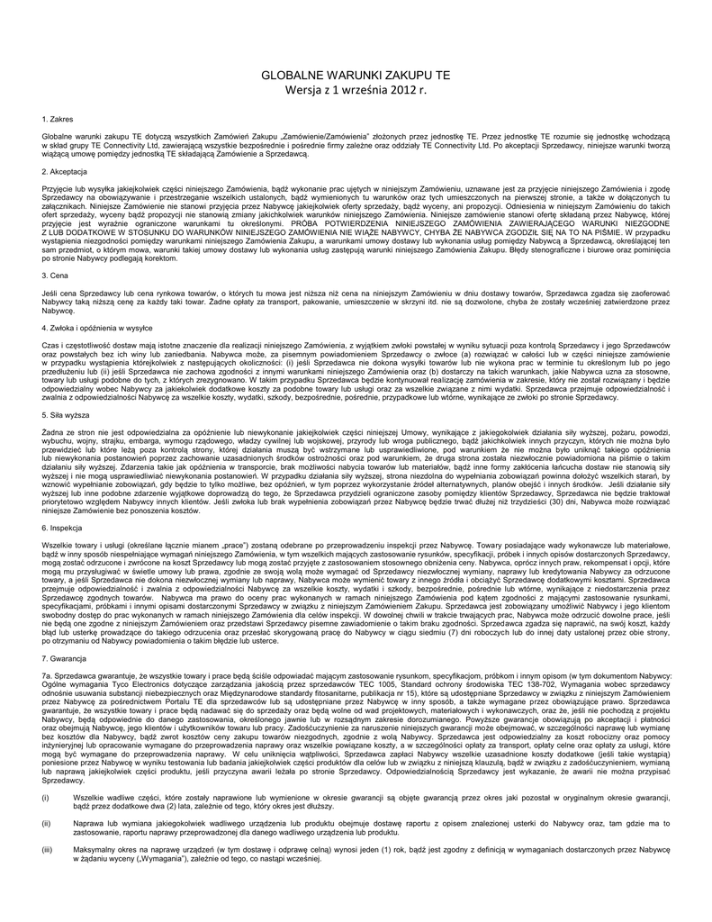 GLOBALNE WARUNKI ZAKUPU TE Wersja z 1 września 2012 r. 1. Zakres Globalne warunki zakupu TE dotyczą wszystkich Zamówień Zakupu „Zamówienie/Zamówienia” złożonych przez jednostkę TE. Przez jednostkę TE rozumie się jednostkę wchodzącą w skład grupy TE Connectivity Ltd, zawierającą wszystkie bezpośrednie i pośrednie firmy zależne oraz oddziały TE Connectivity Ltd. Po akceptacji Sprzedawcy, niniejsze warunki tworzą wiążącą umowę pomiędzy jednostką TE składającą Zamówienie a Sprzedawcą. 2. Akceptacja Przyjęcie lub wysyłka jakiejkolwiek części niniejszego Zamówienia, bądź wykonanie prac ujętych w niniejszym Zamówieniu, uznawane jest za przyjęcie niniejszego Zamówienia i zgodę Sprzedawcy na obowiązywanie i przestrzeganie wszelkich ustalonych, bądź wymienionych tu warunków oraz tych umieszczonych na pierwszej stronie, a także w dołączonych tu załącznikach. Niniejsze Zamówienie nie stanowi przyjęcia przez Nabywcę jakiejkolwiek oferty sprzedaży, bądź wyceny, ani propozycji. Odniesienia w niniejszym Zamówieniu do takich ofert sprzedaży, wyceny bądź propozycji nie stanowią zmiany jakichkolwiek warunków niniejszego Zamówienia. Niniejsze zamówienie stanowi ofertę składaną przez Nabywcę, której przyjęcie jest wyraźnie ograniczone warunkami tu określonymi. PRÓBA POTWIERDZENIA NINIEJSZEGO ZAMÓWIENIA ZAWIERAJĄCEGO WARUNKI NIEZGODNE Z LUB DODATKOWE W STOSUNKU DO WARUNKÓW NINIEJSZEGO ZAMÓWIENIA NIE WIĄŻE NABYWCY, CHYBA ŻE NABYWCA ZGODZIŁ SIĘ NA TO NA PIŚMIE. W przypadku wystąpienia niezgodności pomiędzy warunkami niniejszego Zamówienia Zakupu, a warunkami umowy dostawy lub wykonania usług pomiędzy Nabywcą a Sprzedawcą, określającej ten sam przedmiot, o którym mowa, warunki takiej umowy dostawy lub wykonania usług zastępują warunki niniejszego Zamówienia Zakupu. Błędy stenograficzne i biurowe oraz pominięcia po stronie Nabywcy podlegają korektom. 3. Cena Jeśli cena Sprzedawcy lub cena rynkowa towarów, o których tu mowa jest niższa niż cena na niniejszym Zamówieniu w dniu dostawy towarów, Sprzedawca zgadza się zaoferować Nabywcy taką niższą cenę za każdy taki towar. Żadne opłaty za transport, pakowanie, umieszczenie w skrzyni itd. nie są dozwolone, chyba że zostały wcześniej zatwierdzone przez Nabywcę. 4. Zwłoka i opóźnienia w wysyłce Czas i częstotliwość dostaw mają istotne znaczenie dla realizacji niniejszego Zamówienia, z wyjątkiem zwłoki powstałej w wyniku sytuacji poza kontrolą Sprzedawcy i jego Sprzedawców oraz powstałych bez ich winy lub zaniedbania. Nabywca może, za pisemnym powiadomieniem Sprzedawcy o zwłoce (a) rozwiązać w całości lub w części niniejsze zamówienie w przypadku wystąpienia którejkolwiek z następujących okoliczności: (i) jeśli Sprzedawca nie dokona wysyłki towarów lub nie wykona prac w terminie tu określonym lub po jego przedłużeniu lub (ii) jeśli Sprzedawca nie zachowa zgodności z innymi warunkami niniejszego Zamówienia oraz (b) dostarczy na takich warunkach, jakie Nabywca uzna za stosowne, towary lub usługi podobne do tych, z których zrezygnowano. W takim przypadku Sprzedawca będzie kontynuował realizację zamówienia w zakresie, który nie został rozwiązany i będzie odpowiedzialny wobec Nabywcy za jakiekolwiek dodatkowe koszty za podobne towary lub usługi oraz za wszelkie związane z nimi wydatki. Sprzedawca przejmuje odpowiedzialność i zwalnia z odpowiedzialności Nabywcę za wszelkie koszty, wydatki, szkody, bezpośrednie, pośrednie, przypadkowe lub wtórne, wynikające ze zwłoki po stronie Sprzedawcy. 5. Siła wyższa Żadna ze stron nie jest odpowiedzialna za opóźnienie lub niewykonanie jakiejkolwiek części niniejszej Umowy, wynikające z jakiegokolwiek działania siły wyższej, pożaru, powodzi, wybuchu, wojny, strajku, embarga, wymogu rządowego, władzy cywilnej lub wojskowej, przyrody lub wroga publicznego, bądź jakichkolwiek innych przyczyn, których nie można było przewidzieć lub które leżą poza kontrolą strony, której działania muszą być wstrzymane lub usprawiedliwione, pod warunkiem że nie można było uniknąć takiego opóźnienia lub niewykonania postanowień poprzez zachowanie uzasadnionych środków ostrożności oraz pod warunkiem, że druga strona została niezwłocznie powiadomiona na piśmie o takim działaniu siły wyższej. Zdarzenia takie jak opóźnienia w transporcie, brak możliwości nabycia towarów lub materiałów, bądź inne formy zakłócenia łańcucha dostaw nie stanowią siły wyższej i nie mogą usprawiedliwiać niewykonania postanowień. W przypadku działania siły wyższej, strona niezdolna do wypełniania zobowiązań powinna dołożyć wszelkich starań, by wznowić wypełnianie zobowiązań, gdy będzie to tylko możliwe, bez opóźnień, w tym poprzez wykorzystanie źródeł alternatywnych, planów obejść i innych środków. Jeśli działanie siły wyższej lub inne podobne zdarzenie wyjątkowe doprowadzą do tego, że Sprzedawca przydzieli ograniczone zasoby pomiędzy klientów Sprzedawcy, Sprzedawca nie będzie traktował priorytetowo względem Nabywcy innych klientów. Jeśli zwłoka lub brak wypełnienia zobowiązań przez Nabywcę będzie trwać dłużej niż trzydzieści (30) dni, Nabywca może rozwiązać niniejsze Zamówienie bez ponoszenia kosztów. 6. Inspekcja Wszelkie towary i usługi (określane łącznie mianem „prace”) zostaną odebrane po przeprowadzeniu inspekcji przez Nabywcę. Towary posiadające wady wykonawcze lub materiałowe, bądź w inny sposób niespełniające wymagań niniejszego Zamówienia, w tym wszelkich mających zastosowanie rysunków, specyfikacji, próbek i innych opisów dostarczonych Sprzedawcy, mogą zostać odrzucone i zwrócone na koszt Sprzedawcy lub mogą zostać przyjęte z zastosowaniem stosownego obniżenia ceny. Nabywca, oprócz innych praw, rekompensat i opcji, które mogą mu przysługiw