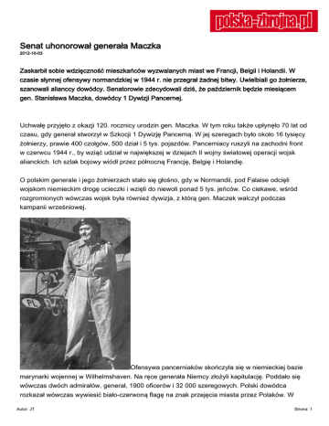 Senat uhonorował generała Maczka 2012-10-03 Zaskarbił sobie wdzięczność mieszkańców wyzwalanych miast we Francji, Belgii i Holandii. W czasie słynnej ofensywy normandzkiej w 1944 r. nie przegrał żadnej bitwy. Uwielbiali go żołnierze, szanowali alianccy dowódcy. Senatorowie zdecydowali dziś, że październik będzie miesiącem gen. Stanisława Maczka, dowódcy 1 Dywizji Pancernej. Uchwałę przyjęto z okazji 120. rocznicy urodzin gen. Maczka. W tym roku także upłynęło 70 lat od czasu, gdy generał stworzył w Szkocji 1 Dywizję Pancerną. W jej szeregach było około 16 tysięcy żołnierzy, prawie 400 czołgów, 500 dział i 5 tys. pojazdów. Pancerniacy ruszyli na zachodni front w czerwcu 1944 r., by wziąć udział w największej w dziejach II wojny światowej operacji wojsk alianckich. Ich szlak bojowy wiódł przez północną Francję, Belgię i Holandię. O polskim generale i jego żołnierzach stało się głośno, gdy w Normandii, pod Falaise odcięli wojskom niemieckim drogę ucieczki i wzięli do niewoli ponad 5 tys. jeńców. Co ciekawe, wśród rozgromionych wówczas wojsk była również dywizja, z którą gen. Maczek walczył podczas kampanii wrześniowej. Ofensywa pancerniaków skończyła się w niemieckiej bazie marynarki wojennej w Wilhelmshaven. Na ręce generała Niemcy złożyli kapitulację. Poddało się wówczas dwóch admirałów, generał, 1900 oficerów i 32 000 szeregowych. Polski dowódca rozkazał wówczas wywiesić biało-czerwoną flagę na znak przejęcia miasta przez Polaków. W Autor: JT Strona: 1 maju 1945 r. pancerniacy utworzyli polskie miasteczko. Na cześć generała nazwali je Maczków. Spędzili w nim ponad 3 lata. „To podczas ofensywy normandzkiej generał zdobył wysokie uznanie w dowództwie alianckim, zaskarbił sobie wdzięczność ludności wyzwalanych miast we Francji, Belgii i Holandii oraz wzbudził podziw i szacunek swoich żołnierzy” – czytamy w uchwale. W dokumencie senatorowie przypomnieli także powojenne losy generała, który – podobnie jak wielu żołnierzy – pozostał na emigracji w Wielkiej Brytanii. Władze PRL odebrały mu wówczas polskie obywatelstwo. Nie otrzymywał także zapomóg, które odbierali alianccy wojskowi. Słynny dowódca znalazł się w trudnej sytuacji finansowej. Utrzymywał się pracując m.in. jako barman w edynburskich hotelach. Senatorowie podkreślili, że gen. Maczek „do końca życia spędzonego na obczyźnie cieszył się szacunkiem rodaków, a zwłaszcza swoich żołnierzy i kombatantów, nie uchybiając w niczym dobremu imieniu Polaka i polskiego żołnierza”. Do Senatu z okazji przyjęcia uchwały przyjechali Tomasz Siemoniak, minister obrony narodowej, gen. dyw. Janusz Adamczak, dowódca 11 Lubuskiej Dywizji Kawalerii Pancernej, oraz kombatanci. Minister Siemoniak podziękował senatorom za uczenie pamięci wielkiego patrioty i dowódcy, którego imię i czyny budzą żołnierski szacunek. Gen. Maczek urodził się 31 marca 1892 r. na Kresach Wschodnich. Dość nietypowo jak na przyszłego oficera na lwowskim uniwersytecie studiował filozofię i literaturę. U prof. Kazimierza Twardowskiego zgłębiał tajniki psychologii uczuć. W czasie I wojny światowej został wcielony do armii austriackiej, ale zaraz po odzyskaniu przez Polskę niepodległości wstąpił do Wojska Polskiego. Zorganizował wówczas pierwszy nowoczesny oddział, zwany lotną kompanią szturmową. Jego zaletą było to, że – w przeciwieństwie do piechoty – ciężkie karabiny maszynowe przewoził wozami konnymi. Jego odziały walczyły także w czasie wojny polskobolszewickiej w 1920 r. W 1938 r. gen. Maczek został dowódcą 10 Brygady Kawalerii Zmotoryzowanej. To była pierwsza jednostka tworzących się w Polsce sił pancernych. Wraz z żołnierzami bronił Lwowa przed Niemcami. Po najeździe Armii Czerwonej gen. Maczek przedostał się do Francji, a po jej klęsce wyruszył do Wielkiej Brytanii. Generał zmarł w Edynburgu w 1994 r. Zgodnie z życzeniem został pochowany obok swoich żołnierzy w wyzwolonej przez siebie holenderskiej Bredzie. Autor: JT Strona: 2