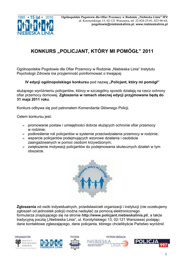 ________________________________________________________________________________ Ogólnopolskie Pogotowie dla Ofiar Przemocy w Rodzinie „Niebieska Linia” IPZ ul. Korotyńskiego 13, 02-121 Warszawa, tel. 22-824-25-01, 823-96-64, [email protected], www.niebieskalinia.pl KONKURS „POLICJANT, KTÓRY MI POMÓGŁ” 2011 Ogólnopolskie Pogotowie dla Ofiar Przemocy w Rodzinie „Niebieska Linia” Instytutu Psychologii Zdrowia ma przyjemność poinformować o trwającej IV edycji ogólnopolskiego konkursu pod nazwą „Policjant, który mi pomógł” służącego wyróżnieniu policjantów, którzy w szczególny sposób działają na rzecz ochrony ofiar przemocy domowej. Zgłoszenia w ramach obecnej edycji przyjmowane będą do 31 maja 2011 roku. Konkurs odbywa się pod patronatem Komendanta Głównego Policji. Celem konkursu jest: • • • • promowanie postaw i umiejętności dobrze służących ochronie ofiar przemocy w rodzinie; podkreślenie roli policjantów w systemie przeciwdziałania przemocy w rodzinie; wsparcie policjantów podejmujących wzorowe działania i osobiście zaangażowanych w pomoc osobom krzywdzonym; zwiększenie motywacji policjantów do podejmowania skutecznych działań w tym obszarze. Zgłoszenia od osób indywidualnych, przedstawicieli organizacji i instytucji (nie oczekujemy zgłoszeń od jednostek policji) można nadsyłać za pomocą elektronicznego formularza znajdującego się na stronie http://www.policjant.niebieskalinia.pl/, a także tradycyjną pocztą („Niebieska Linia”, ul. Korotyńskiego 13, 02-121 Warszawa) podając: dane kontaktowe zgłaszającego, dane policjanta, którego chcielibyście Państwo wyróżnić 1 ________________________________________________________________________________ Ogólnopolskie Pogotowie dla Ofiar Przemocy w Rodzinie „Niebieska Linia” IPZ ul. Korotyńskiego 13, 02-121 Warszawa, tel. 22-824-25-01, 823-96-64, [email protected], www.niebieskalinia.pl oraz uzasadnienie tego wyboru (można skorzystać z formularza zgłoszeniowego do druku dostępnego pod adresem http://www.niebieskalinia.pl/spaw/docs/formularz.doc). Kandydatury nadesłane po 31 maja 2011 r. zostaną uwzględnione w następnej edycji konkursu. Kandydatów do nagrody spośród osób zgłoszonych wyłoni kapituła złożona z pracowników Pogotowia „Niebieska Linia”, patrona konkursu i laureatów konkursu z lat poprzednich. Rozstrzygnięcie IV edycji konkursu nastąpi z końcem czerwca 2011 roku. Tradycyjnie Laureaci otrzymują nagrody z rąk Komendanta Głównego Policji oraz organizatora konkursu 23 lipca podczas obchodów Dnia Policji. 2