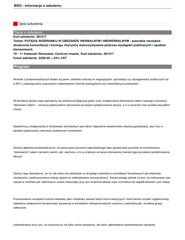 BDO - informacje o szkoleniu Opis szkolenia Dane o szkoleniu Kod szkolenia: 391317 Temat: POTĘGA WIZERUNKU W OBSZARZE WERBALNYM I NIEWERBALNYM - autorskie narzędzia skutecznej komunikacji i treningu charyzmy wykorzystywane podczas wystąpień publicznych i spotkań biznesowych 10 - 11 Kwiecień Warszawa, Centrum miasta, Kod szkolenia: 391317 Koszt szkolenia: 2290.00 + 23% VAT Program Wnioski z przeprowadzonych badań są jasne: osobiste sukcesy w negocjacjach, sprzedaży czy wystąpieniach publicznych aż w 80 % zawdzięczamy opanowaniu odpowiednich technik posługiwania się niewerbalnym przekazem. W tematyce języka ciała zajmujemy się skuteczną diagnozą gestu oraz umiejętnością sterowania ciałem naszego rozmówcy. "Sterować ciałem" - oznacza jednocześnie sterowanie procesem podejmowania decyzji, a o to przecież nam przede wszystkim chodzi. Zasadniczą umiejętnością w środowisku biznesowym jest także nabywanie świadomości własnej gestykulacji, aby móc w sposób zaplanowany sterować wywieranym wrażeniem. Żywimy głębokie przeświadczenie, że precyzyjne poznanie odpowiedniego stylu gestykulacji pozwala na kontrolowane "sterowanie" ciałem zarówno swoim, jak i partnera, a to w praktyce oznacza sterowanie również jego procesem podejmowania decyzji. Oprócz tego dowodzimy, że nic tak silnie nie oddziałuje na drugiego człowieka w kontaktach biznesowych jak właściwie zbudowane i podtrzymywane relacje oparte na oddziaływaniu emocjonalnym. Sztuka polega jednak na tym, by wykreować owe relacje w możliwie jak najkrótszym czasie stwarzając przy tym wrażenie jakoby nasz rozmówca był współkreatorem tych relacji. Prezentowane narzędzia można traktować jako unikatowy zestaw taktyk komunikacyjnych, które bardzo szybko zagwarantują radykalne zwiększenie skuteczności sprawczej w kontaktach interpersonalnych zarówno z jednostką jak i liczebną grupą odbiorców. Udowadniamy przy tym, że charyzma to nie tylko cecha wrodzona, ale zbiór odpowiednio wykreowanych nawyków. BDO - informacje o szkoleniu Piotr Tymochowicz Blok I - Umiejętność "odczytywania" i wykorzystywania komunikatów wynikających ze sfery pozawerbalnej człowieka 1. Teoria Gestów i ich umiejętne zastosowanie w praktyce - Informacyjne znaczenie postawy - Analiza postaw stojących i siedzących - Sposoby operowania gestem (gestykulacja świadoma) - Trening nawyków gestykulacyjnych - Sposoby operowania mimiką i wzrokiem 2. Style gestykulacji a oddziaływanie podprogowe (gestykulacja manipulacyjna) - Style gestykulacji jako podstawowa metoda wywierania wpływu za pomocą gestu (styl prezydencki, dynamiczny, emocjonalny, sprzeczny) - Dobór stylu gestykulacji do sytuacji komunikacyjnej - Trening aktywnego sterowania własnym ciałem 3. Sterowanie emocjami i skuteczne wywieranie wpływu w oparciu o komunikację niewerbalną - Sposoby operowania gestem (gestykulacja świadoma) - Najczęściej popełniane błędy - Spontaniczne reagowanie za pomocą gestu - Podstawowe metody wywierania wpływu za pomocą gestu - Wyprzedzanie gestem wypowiedzi słownej Blok II - Tło werbalne i emocjonalne poprawnej komunikacji 1. Znaczenie przekazu werbalnego w budowaniu relacji z jednostką/grupą - Techniki zadawania pytań - umiejętność sterowania przebiegiem rozmowy za pomocą odpowiednich pytań BDO - informacje o szkoleniu - Umiejętność skutecznego i aktywnego słuchania 2. Wykorzystywanie walorów głosowych i operowanie aparatem mowy - Poszerzenie skali i praca nad modulacją głosu - Zasady prawidłowego oddychania i wzmocnienie aparatu oddechowego - Źródło dźwięku - sposoby wzmocnienia aparatu mowy - Umiejętne wykorzystanie rezonatorów - Kształtowanie i utrwalenie prawidłowej wymowy 3. Sztuka przekonywania zamiast perswazji według I.T. - Manipulacje werbalne - sposoby modulowania tonacji i rytmu w wypowiedzi werbalnej - sztuka operowania głosem, walory głosowe - zasada współwystępowania trzech elementów operowania głosem (rytm, tonacja, siła) - schemat najskuteczniejszego wykorzystania własnego głosu jako elementu wywierania wpływu - trening zmiany rytmu, tonacji i siły głosu w trakcie wypowiedzi - symulacja wypowiedzi w trakcie procesu prezentacyjnego opartej na modulacji - Retoryka jako element wywierania wpływu na rozmówcę Blok III - Podprogowe odczytywanie intencji 1. Metoda Analizy Dominant Transakcyjnych - Błyskawiczna ocena nastawienia osoby na podstawie krótkiej obserwacji lub rozmowy - Uniwersalne schematy osobowościowe i sposoby postępowania z każdym z nich - charakterystyka gestykulacyjna wybranych typów osobowościowych - powiązanie typu osobowości z predyspozycjami interpersonalnymi - techniki diagnozy niewerbalnej w ujawnieniu dominant - symulacja dostosowania się osoby prowadzącej rozmowy do wzorca komunikacyjnego rozmówcy - Sposoby diagnozowania ze szczególnym uwzględnieniem kłopotliwych adwersarzy Blok IV - Narzędzia do błyskawicznego kreowania relacji komunikacyjnych BDO - informacje o szkoleniu 1. Teoria Osobowości Kreatora oraz żródła komunikatu relacyjnego jako wyciąg najskuteczniejszych narzędzi oddziaływania - Podstawowe techniki wywierania wpływu - Wielostopniowy model skutecznego oddziaływania na człowieka - Elementy teorii zdarzeń kreatywnych i sposoby zarządzania zdarzeniami - Techniki wiązane czyli Inteligencja emocjonalna i Inteligencja ciała 2. Właściwe otwarcie relacji jako klucz do zbudowania zaufania i wairygodnoci - Kontrolowanie emocji własnych - Emocje odbiorców i umiejętność ich właściwego odczytywania - Umiejętne przechodzenie z procesu otwierania do kreowania relacji - Wykorzystanie oczekiwań i ujawnienie intencji w procesie budowania zaufania i wiarygodności 3. Budowanie poczucia satysfakcji i dowartościowania - Sztuka dowartościowania: - bezposredniego - problemowego - w opinii - Umiejętność aktywnego słuchania i kontrolowanego umniejszania wartości własnej - Pozytywna ret
