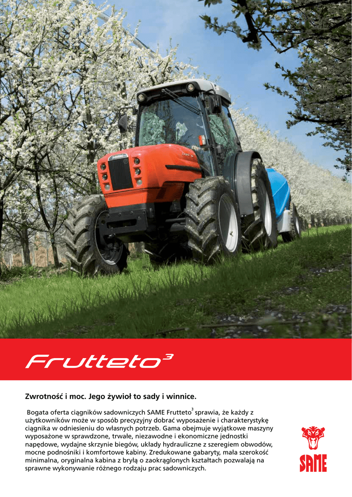 Zwrotność i moc. Jego żywioł to sady i winnice. Bogata oferta ciągników sadowniczych SAME Frutteto sprawia, że każdy z użytkowników może w sposób precyzyjny dobrać wyposażenie i charakterystykę ciągnika w odniesieniu do własnych potrzeb. Gama obejmuje wyjątkowe maszyny wyposażone w sprawdzone, trwałe, niezawodne i ekonomiczne jednostki napędowe, wydajne skrzynie biegów, układy hydrauliczne z szeregiem obwodów, mocne podnośniki i komfortowe kabiny. Zredukowane gabaryty, mała szerokość minimalna, oryginalna kabina z bryłą o zaokrąglonych kształtach pozwalają na sprawne wykonywanie różnego rodzaju prac sadowniczych. SILNIK Norma emisji spalin Producent / model silnika Cylindry / Pojemność skokowa Zasys powietrza Maks.moc homologowana (2000/25/CE) przy 2200 obr/min Maksymalny moment przy 1600 obr/min Elektroniczne sterowanie silnika Pojemność zbiornika paliwa (std+dodatkowy) REWERS KIERUNKU JAZDY Rewers mechaniczny, zsynchronizowany Rewers elektrohydrauliczny Powershuttle z funkcją Stop&Go SKRZYNIA MECHANICZNA BEZ PÓŁBIEGÓW Skrzynia 5-cio biegowa Liczba przełożeń z mini i super-reduktorem SKRZYNIA POWERSHIFT Skrzynia 5-cio biegowa Liczba przełożeń z mini i super-reduktorem Liczba półbiegów Powershift WOM TYLNY Sterowanie elektrohydrauliczne WOM 540/750 WOM 540/750/1000 WOM 540/750/synchro WOM zsynchronizowany (synchro) WOM PRZEDNI Sterowanie elektrohydrauliczne WOM 1000 OŚ PRZEDNIA I NAPĘD Napęd na cztery koła sterowany elektrohydraulicznie Blokada mech.różnicowych sterowana elektrohydraulicznie HAMULCE I UKŁAD KIEROWNICZY Hamulce tarczowe w kąpieli olejowej na cztery koła Niezależny hamulec postojowy Sterowanie hydrostatyczne Hydrostatyczny układ kierowniczy z niezależną pompą wspomagania Kąt skrętu kół przednich PODNOŚNIKI Tylny podnośnik mechaniczny MHR Tylny podnośnik elektroniczny EHR Udźwig tylnego podnośnika Podnośnik przedni Udźwig przedniego podnośnika UKŁAD HYDRAULICZNY Wydajność pompy Układ z podwójną pompą Liczba obwodów z tyłu ciągnika Liczba obwodów umieszczonych centralnie PLATFORMA Amortyzacja na Silent-block Składana rama bezpieczeństwa KABINA Amortyzacja na Silent-block Układ wentylacji i ogrzewania Układ klimatyzacji WYMIARY I WAGI Standardowe ogumienie tylne Długość maksymalna bez ramion podnośnika Szerokość min./ maks. Wysokość z ramą bezpieczeństwa Wysokość z kabiną Prześwit Rozstaw osi Rozstaw kół tylnej osi min./ maks. Rozstaw kół przedniej osi min./ maks. Promień zawracania Waga z ramą bezpieczeństwa Waga z kabiną Maksymalna masa dopuszczalna 90 Tier3 SDF / Seria 1000.3 3 / 3000 Turbo, Intercooler 60 / 82 310 • 54 + 41 Tier3 SDF / Seria 1000.4 4 / 4000 Turbo, Intercooler 63 / 85 345 • 54 + 41 • • • • • 30 + 15 • 30 + 15 • 45 + 45 3 • 45 + 45 3 • • • • • • • • • • • • • • 60° • • • • 60° • • kg 2800 2800 kg 1500 1500 54 33 + 25 3 2 54 33 + 25 3 2 • • • • • • • • 360/70R24 3186 1443 / 2012 2228 2248 225 1990 1242 / 1442 1139 / 1637 3600 2630 2850 5000 380/70R24 3338 1478 / 1988 2380 2380 225 2120 1282 / 1442 1277 / 1589 3700 2780 3000 5000 il./cm kW/KM Nm litry l/min l/min mm mm mm mm mm mm mm mm mm kg kg kg • STD ○ OPC Dealer same-tractors.com Zaleca się stosowanie oryginalnych części zamiennych i płynów eksploatacyjnych SDF. SAME jest marką Dane techniczne i ilustracje mają charakter poglądowy. SAME zastrzega prawo do wprowadzania zmian bez konieczności wcześniejszego informowania. Kod. 308.8164.8.1-5 - 12/15 80 FRUTTETO³