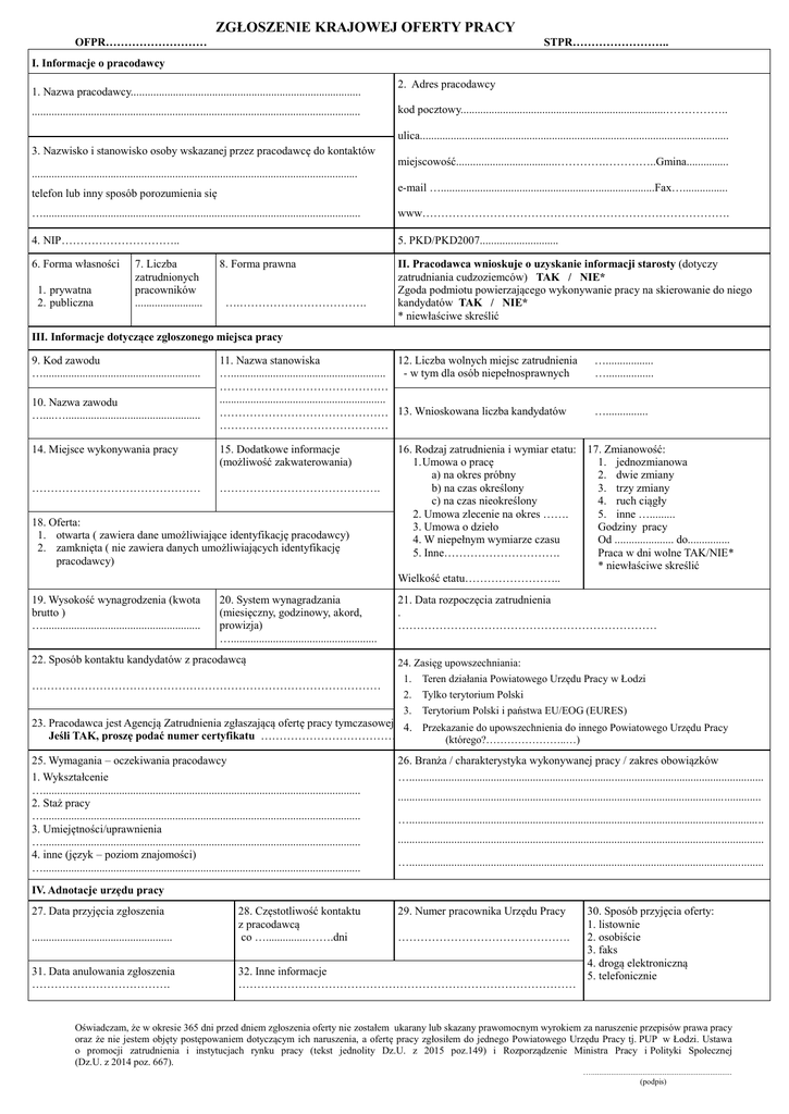 ZGŁOSZENIE KRAJOWEJ OFERTY PRACY OFPR……………………… STPR…………………….. I. Informacje o pracodawcy 1. Nazwa pracodawcy.................................................................................. ..................................................................................................................... 2. Adres pracodawcy kod pocztowy.........................................................................…………….. ulica.............................................................................................................. 3. Nazwisko i stanowisko osoby wskazanej przez pracodawcę do kontaktów miejscowość....................................………….…………..Gmina............... .................................................................................................................... e-mail …............................................................................Fax…................ telefon lub inny sposób porozumienia się …................................................................................................................. www………………………………………………………………………. 4. NIP………………………….. 5. PKD/PKD2007............................ 6. Forma własności 1. prywatna 2. publiczna 7. Liczba zatrudnionych pracowników ........................ 8. Forma prawna ….……………………………. II. Pracodawca wnioskuje o uzyskanie informacji starosty (dotyczy zatrudniania cudzoziemców) TAK / NIE* Zgoda podmiotu powierzającego wykonywanie pracy na skierowanie do niego kandydatów TAK / NIE* * niewłaściwe skreślić III. Informacje dotyczące zgłoszonego miejsca pracy 9. Kod zawodu …........................................................ 10. Nazwa zawodu …....…................................................ 11. Nazwa stanowiska 12. Liczba wolnych miejsc zatrudnienia …....................................................... - w tym dla osób niepełnosprawnych ……………………………………… ........................................................... ……………………………………… 13. Wnioskowana liczba kandydatów ……………………………………… 14. Miejsce wykonywania pracy 15. Dodatkowe informacje (możliwość zakwaterowania) ……………………………………… ……………………………………. 18. Oferta: 1. otwarta ( zawiera dane umożliwiające identyfikację pracodawcy) 2. zamknięta ( nie zawiera danych umożliwiających identyfikację pracodawcy) 19. Wysokość wynagrodzenia (kwota brutto ) …........................................................ 20. System wynagradzania (miesięczny, godzinowy, akord, prowizja) ….................................................... 22. Sposób kontaktu kandydatów z pracodawcą ………………………………………………………………………………… …................. …................. …............... 16. Rodzaj zatrudnienia i wymiar etatu: 17. Zmianowość: 1. Umowa o pracę 1. jednozmianowa a) na okres próbny 2. dwie zmiany b) na czas określony 3. trzy zmiany c) na czas nieokreślony 4. ruch ciągły 2. Umowa zlecenie na okres ……. 5. inne …......... 3. Umowa o dzieło Godziny pracy 4. W niepełnym wymiarze czasu Od ..................... do............... 5. Inne…………………………. Praca w dni wolne TAK/NIE* * niewłaściwe skreślić Wielkość etatu…………………….. 21. Data rozpoczęcia zatrudnienia . …………………………………………………………… 24. Zasięg upowszechniania: 1. 2. 3. Teren działania Powiatowego Urzędu Pracy w Łodzi Tylko terytorium Polski Terytorium Polski i państwa EU/EOG (EURES) 23. Pracodawca jest Agencją Zatrudnienia zgłaszającą ofertę pracy tymczasowej. 4. Przekazanie do upowszechnienia do innego Powiatowego Urzędu Pracy Jeśli TAK, proszę podać numer certyfikatu ……………………………… (którego?…………………..…) 25. Wymagania – oczekiwania pracodawcy 1. Wykształcenie …................................................................................................................. 2. Staż pracy …................................................................................................................. 3. Umiejętności/uprawnienia …................................................................................................................. 4. inne (język – poziom znajomości) …................................................................................................................. 26. Branża / charakterystyka wykonywanej pracy / zakres obowiązków ….............................................................................................................................. ................................................................................................................................. ….............................................................................................................................. .................................................................................................................................. ….............................................................................................................................. IV. Adnotacje urzędu pracy 27. Data przyjęcia zgłoszenia .................................................. 28. Częstotliwość kontaktu z pracodawcą co …...............…….dni 29. Numer pracownika Urzędu Pracy 31. Data anulowania zgłoszenia ………………………………. 32. Inne informacje ……………………………………………………………………………… ………………………………………. 30. Sposób przyjęcia oferty: 1. listownie 2. osobiście 3. faks 4. drogą elektroniczną 5. telefonicznie Oświad