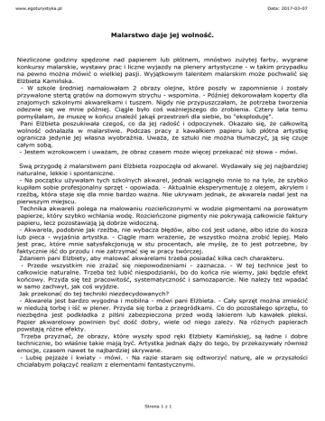 www.egoturystyka.pl Data: 2017-03-07 Malarstwo daje jej wolność. Niezliczone godziny spędzone nad papierem lub płótnem, mnóstwo zużytej farby, wygrane konkursy malarskie, wystawy prac i liczne wyjazdy na plenery artystyczne - w takim przypadku na pewno można mówić o wielkiej pasji. Wyjątkowym talentem malarskim może pochwalić się Elżbieta Kamińska. - W szkole średniej namalowałam 2 obrazy olejne, które poszły w zapomnienie i zostały przywalone stertą gratów na domowym strychu - wspomina. - Później dekorowałam koperty dla znajomych szkolnymi akwarelkami i tuszem. Nigdy nie przypuszczałam, że potrzeba tworzenia odezwie się we mnie później. Ciągle było coś ważniejszego do zrobienia. Cztery lata temu pomyślałam, że muszę w końcu znaleźć jakąś przestrzeń dla siebie, bo "eksploduję". Pani Elżbieta poszukiwała czegoś, co da jej radość i odpoczynek. Okazało się, że całkowitą wolność odnalazła w malarstwie. Podczas pracy z kawałkiem papieru lub płótna artystkę ogranicza jedynie jej własna wyobraźnia. Uważa, że sztuki nie można tłumaczyć, ją się czuje całym sobą. - Jestem wzrokowcem i uważam, że obraz czasem może więcej przekazać niż słowa - mówi. Swą przygodę z malarstwem pani Elżbieta rozpoczęła od akwarel. Wydawały się jej najbardziej naturalne, lekkie i spontaniczne. - Na początku używałam tych szkolnych akwarel, jednak wciągnęło mnie to na tyle, że szybko kupiłam sobie profesjonalny sprzęt - opowiada. - Aktualnie eksperymentuję z olejem, akrylem i rzeźbą, która staje się dla mnie bardzo ważna. Nie ukrywam jednak, że akwarela nadal jest na pierwszym miejscu. Technika akwareli polega na malowaniu rozcieńczonymi w wodzie pigmentami na porowatym papierze, który szybko wchłania wodę. Rozcieńczone pigmenty nie pokrywają całkowicie faktury papieru, lecz pozostawiają ją dobrze widoczną. - Akwarela, podobnie jak rzeźba, nie wybacza błędów, albo coś jest udane, albo idzie do kosza lub pieca - wyjaśnia artystka. - Ciągle mam wrażenie, że wszystko można zrobić lepiej. Mało jest prac, które mnie satysfakcjonują w stu procentach, ale myślę, że to jest potrzebne, by faktycznie iść do przodu i nie zatrzymać się w pracy twórczej. Zdaniem pani Elżbiety, aby malować akwarelami trzeba posiadać kilka cech charakteru. - Przede wszystkim nie zrażać się niepowodzeniami - zaznacza. - W tej technice jest to całkowicie naturalne. Trzeba też lubić niespodzianki, bo do końca nie wiemy, jaki będzie efekt końcowy. Przyda się też pracowitość, systematyczność i samozaparcie. Nie należy też wpadać w samo zachwyt, jak coś wyjdzie. Jak przekonać do tej techniki niezdecydowanych? - Akwarela jest bardzo wygodna i mobilna - mówi pani Elżbieta. - Cały sprzęt można zmieścić w niedużą torbę i iść w plener. Przyda się torba z przegródkami. Co do pozostałego sprzętu, to niezbędna jest podkładka z pilśni zabezpieczona przed wodą lakierem lub kawałek pleksi. Papier akwarelowy powinien być dość dobry, wiele od niego zależy. Na różnych papierach powstają różne efekty. Trzeba przyznać, że obrazy, które wyszły spod ręki Elżbiety Kamińskiej, są ładne i dobre technicznie, bo właśnie takie mają być. Artystka jednak dąży do tego, by przekazywały również emocje, czasem nawet te najbardziej skrywane. - Lubię pejzaże i kwiaty - mówi. - Na razie staram się odtworzyć naturę, ale w przyszłości chciałabym połączyć realizm z elementami fantastycznymi. Strona 1 z 1