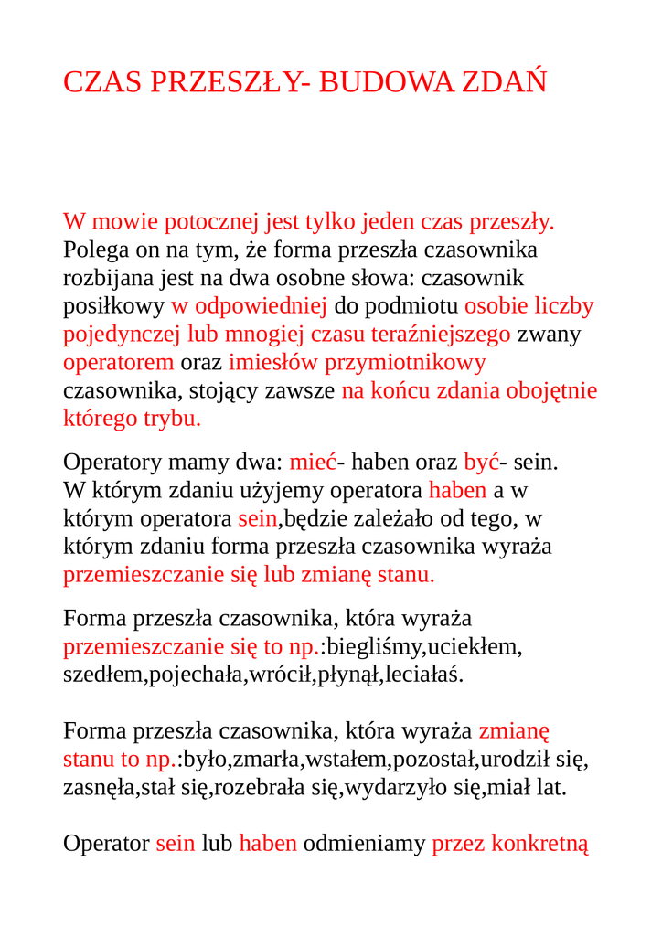 CZAS PRZESZŁY- BUDOWA ZDAŃ W mowie potocznej jest tylko jeden czas przeszły. Polega on na tym, że forma przeszła czasownika rozbijana jest na dwa osobne słowa: czasownik posiłkowy w odpowiedniej do podmiotu osobie liczby pojedynczej lub mnogiej czasu teraźniejszego zwany operatorem oraz imiesłów przymiotnikowy czasownika, stojący zawsze na końcu zdania obojętnie którego trybu. Operatory mamy dwa: mieć- haben oraz być- sein. W którym zdaniu użyjemy operatora haben a w którym operatora sein,będzie zależało od tego, w którym zdaniu forma przeszła czasownika wyraża przemieszczanie się lub zmianę stanu. Forma przeszła czasownika, która wyraża przemieszczanie się to np.:biegliśmy,uciekłem, szedłem,pojechała,wrócił,płynął,leciałaś. Forma przeszła czasownika, która wyraża zmianę stanu to np.:było,zmarła,wstałem,pozostał,urodził się, zasnęła,stał się,rozebrała się,wydarzyło się,miał lat. Operator sein lub haben odmieniamy przez konkretną osobę podmiotu w czasie teraźniejszym. Imiesłów przymiotnikowy czasownika zwany participem jest nieodmienny przez osoby,liczby ani rodzaje. Pozostaje w niezmienionej postaci niezależnie od tego, kto wypowiada zdanie i w jakim trybie je wypowiada. I tak na przykład: Tryb oznajmujący w rodzaju męskim i żeńskim: Ja pojechałam. Ja pojechałem. Ty pojechałeś. Ty pojechałaś. On pojechał. Ona pojechała. Ono pojechało. My pojechałyśmy. My pojechaliśmy. Wy pojechałyście. Wy pojechaliście. One pojechały. Oni pojechali. Pan pojechał. Pani pojechała. Panowie pojechaliście Panie pojechałyście. Państwo pojechaliście. Za każdym razem słowo zaznaczone kolorem czerwonym będzie miało postać gefahren. Tryb pytający w rodzaju męskim i żeńskim: Czy ja pojechałam? Czy ja pojechałem? Czy ty pojechałaś? Czy ty pojechałeś? Czy on pojechał? Czy ona pojechała? Czy ono pojechało? Czy my pojechałyśmy? Czy my pojechaliśmy? Czy wy pojechaliście? Czy wy pojechałyście? Czy one pojechały? Czy oni pojechali? Czy pan pojechał? Czy pani pojechała? Czy panowie pojechaliście? Czy panie pojechałyście? Czy państwo pojechaliście? Tutaj też każdy particip zaznaczony na czerwono będzie miał niezmienną postać gefahren. Tryb przeczący w rodzaju męskim i żeńskim: Ja nie pojechałem. Ja nie pojechałam. Ty nie pojechałeś. Ty nie pojechałaś. On nie pojechał. Ona nie pojechała. Ono nie pojechało. My nie pojechałyśmy. My nie pojechaliśmy. Wy nie pojechałyście. Wy nie pojechaliście. Oni nie pojechali. One nie pojechały. Pan nie pojechał. Pani nie pojechała. Panowie nie pojechaliście. Panie nie pojechałyście. Państwo nie pojechaliście. I tutaj participy zaznaczone na czerwono mają tę samą postać gefahren. Skoro w zdaniu: Ja pojechałam. Forma przeszła pojechałam wyraża przemieszczanie, to znaczy,że do niej musi być użyty operator sein. W tym wypadku operator sein musi być w 1 osobie liczby pojedynczej,a więc Ich bin,ponieważ podmiotem w zdaniu jest słowo ja. Na końcu zdania będzie particip gefahren. Po złożeniu do kupy, otrzymujemy: Ich bin gefahren. Jeśli to zdanie chcemy powiedzieć w trybie pytającym, to wystarczy tylko poprzez inwersję zamienić kolejność dwóch pierwszych wyrazów, natomiast particip gefahren pozostanie bez zmian na końcu zdania przed pytajnikiem. Osoba operatora sein nie zmieni się, bo nie zmieniliśmy podmiotu. Otrzymamy zatem: Bin ich gefahren? Czy ja pojechałam? W zdaniu przeczącym kolejność wyrazów będzie taka sama jak w trybie oznajmującym z tą tylko różnicą, że zaimek przeczący nicht będzie zaraz po operatorze. Otrzymamy zatem: Ich bin nicht gefahren. Ja nie pojechałam. W każdym zdaniu czasu przeszłego,niezależnie od podmiotu,jego rodzaju,liczby, oraz trybu zdania,orzeczeniem jest operator w konkretnej osobie podmiotu. W czasie przeszłym operator nigdy nie występuje w formie bezokolicznika. Kolejny przykład na trochę dłuższe zdanie: Ile mieliście dzieci? W zdaniu tym forma przeszła czasownika mieliście nie wyraża przemieszczania ani zmiany stanu. Wobec tego musi tu być użyty operator haben w 2 osobie liczby mnogiej czasu teraźniejszego, bo podmiotem jest domyślny zaimek osobowy wy, mimo że w j.polskim go nie wypowiadamy. Zdanie zaczniemy od zaimka pytającego ile. Zaraz za nim ze wzoru na tworzenie zdań pytających szczegółowych, będzie stał rzeczownik dzieci. Następnie orzeczenie w postaci operatora habt,po nim podmiot wy, a po nim na samym końcu zdania,particip czasownika „mieć” o postaci gehabt. Składamy zdanie do kupy: Wieviel Kinder habt ihr gehabt? Następny przykład: Moja córka nie wyszła za mąż. Znowu najpierw patrzymy na formę przeszłą czasownika. Wyszła za mąż wskazuje nam, że czasownik ten nie wyraża zmiany stanu ani przemieszczania. Wobec tego jego operatorem będzie czasownik haben w 3 osobie liczby pojedynczej czasu teraźniejszego,bo wyrażenie moja córka jest podmiotem, a moja córka to jakby ona a więc 3 osoba liczby pojedynczej. Zatem operator musi mieć postać hat, a participem na końcu zdania będzie słowo verheiratet. Zdanie zaczniemy od wyrażenia moja córka.Po nim damy operator ,za nim przeczenie nicht,a za nim particip. Otrzymamy: Meine Tochter hat nicht verheiratet. Inny przykład: Urodziłem się w Gdyni. Postępujemy podobnie. Podmiotem będzie tu zaimek osobowy ja. A więc zaczynamy zdanie od słowa ich. Potem patrzymy,że urodziłem się wyraża zmianę stanu,więc operatorem będzie czasownik sein w 1 osobie liczby pojedynczej czyli słowo bin. Mamy już ich bin. Potem umieszczamy dopełnienie w Gdyni, a za nim na końcu zdania ostatnie słowo, mianowicie particip czasownika urodziłem się. Otrzymujemy: Ich bin in Gdynia geboren. Participów wszystkich czasowników mocnych i nieregularnych kończą się na końcówkę „en” i uczymy się ich na pamięć lub odczytujemy je z tabeli. Participy czasowników słaby